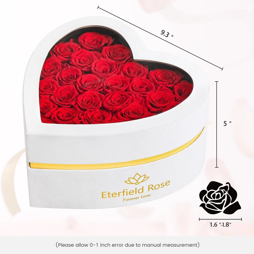 100% Real Rose - Our preserved roses are hand-picked at peak freshness and carefully arranged in variety of colors, styles, and looks by our master florists. Unique Roses Box Gift: 27-piece long lasting roses are arranged in a white heart-shaped suede box to give your significant ones a gift that represents your love. The transparent PVC cover not only effectively protects the roses from dust or damage, but also adds a sense of fashion and elegance to the entire preserved roses box. Roses that last over a year: Every preserved rose undergoes a cutting-edge method which allows them maintain their beauty and color for at least a year. With our long lasting rose, we offer an elegant, luxurious way to create lasting moments with the people you cherish most. Not just once, but every day, all year. Ultimate Gift for Her: Whether it's Birthday, Anniversary, Valentine's Day or any other special occasion, our eternal roses Gift Box will be a perfect gift. They are a symbol of love and will be cherished for years to come. Maintenance-Free: They will not wilt, fade, or lose their petals like fresh flowers. There is no need for water, no need for sunlight, easy to care for, just enjoy the forever beauty.