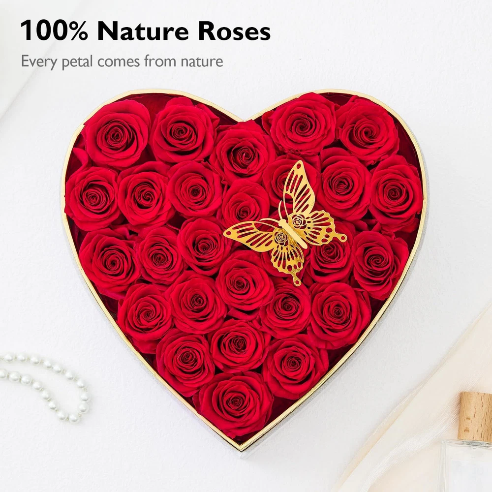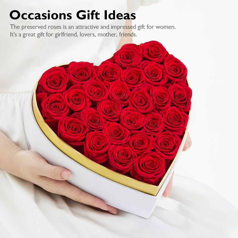 100% Real Rose - Our preserved roses are hand-picked at peak freshness and carefully arranged in variety of colors, styles, and looks by our master florists. Unique Roses Box Gift: 27-piece long lasting roses are arranged in a white heart-shaped suede box to give your significant ones a gift that represents your love. The transparent PVC cover not only effectively protects the roses from dust or damage, but also adds a sense of fashion and elegance to the entire preserved roses box. Roses that last over a year: Every preserved rose undergoes a cutting-edge method which allows them maintain their beauty and color for at least a year. With our long lasting rose, we offer an elegant, luxurious way to create lasting moments with the people you cherish most. Not just once, but every day, all year. Ultimate Gift for Her: Whether it's Birthday, Anniversary, Valentine's Day or any other special occasion, our eternal roses Gift Box will be a perfect gift. They are a symbol of love and will be cherished for years to come. Maintenance-Free: They will not wilt, fade, or lose their petals like fresh flowers. There is no need for water, no need for sunlight, easy to care for, just enjoy the forever beauty.