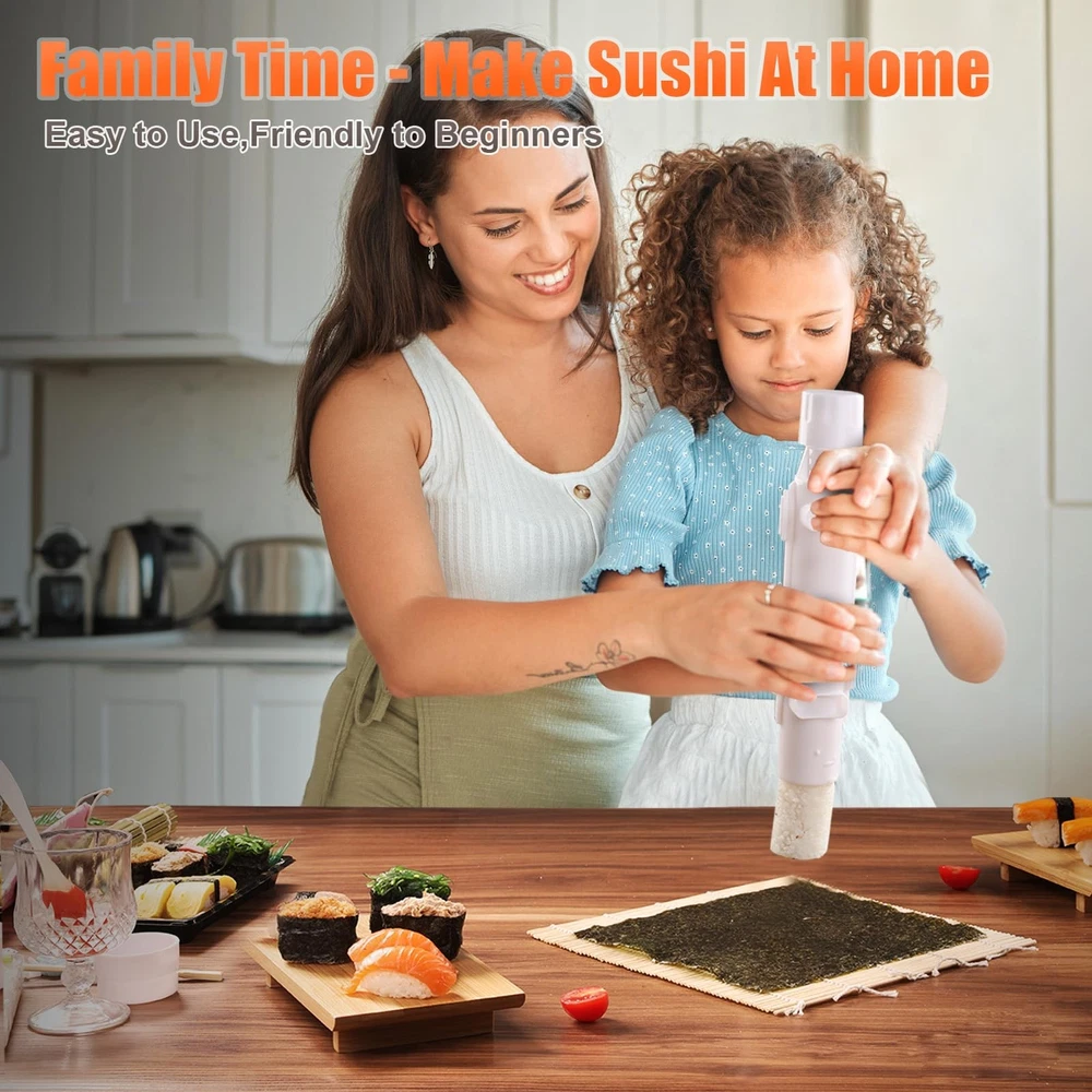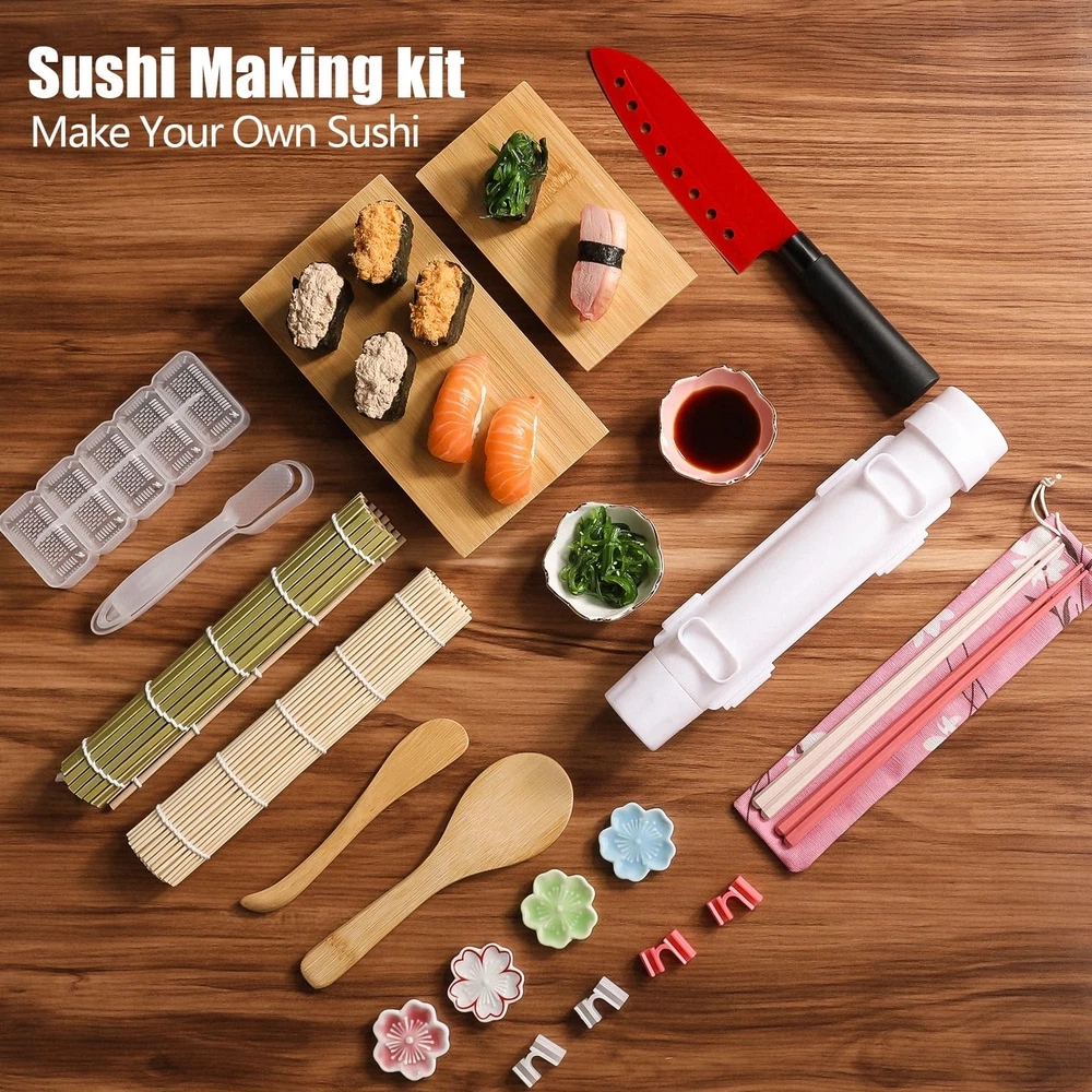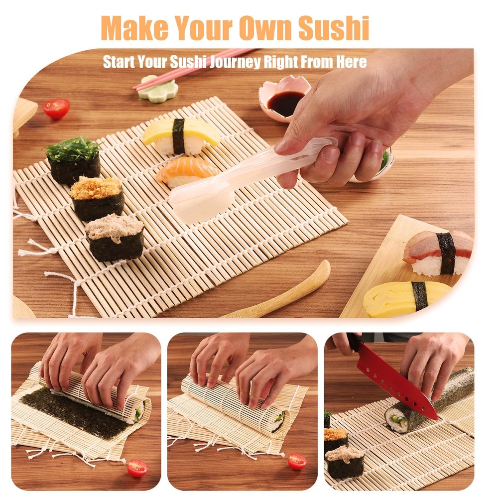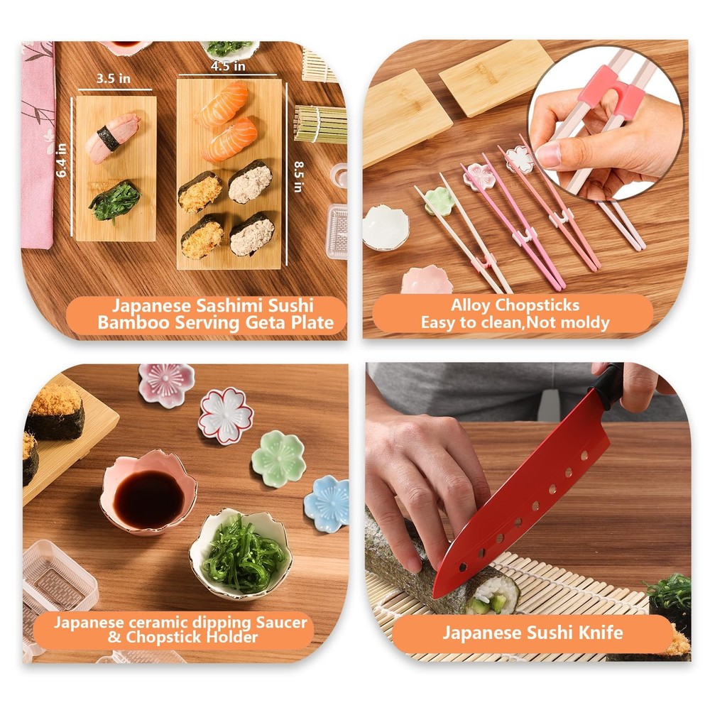 Sushi making set,1* bazooka, 2* sushi board, 4* chopstick pairs, 1* chopstick bag, 2* bamboo mats, 1* rice spoon, 1* sushi stick, 2* sushi mould, 4* chopstick aids, 2* dipping saucer, 4* chopstick holder, 1* sushi knife. This kit has everything you need to make sushi, including exquisite ceramic bowls and japanese bamboo sushi plates. Beautifully packaged and ready to give as a gift. Everything you need for sushi making: Our set includes japanese sashimi sushi bamboo serving geta plate,bamboo mat, chopsticks, ceramic bowl, rice molds, sushi knife, chopsticks helper and storage bag, and more Easy to follow: We have a user manual, and our sushi making kits contains a tutorial on the bazooka roller and all the tools you need to make sushi, so even if you're new to sushi you'll be able to make delicious sushi in no time Multi-functional rice mold: The rice mold included in the set is very practical, can correct the shape of the rice, so that the sushi can be easily shaped to make delicious and beautiful sushi, add color to your party, is the best choice for kitchen helpers Natural and eco-friendly materials: All the materials used in our sushi set tools are of high quality, the bamboo curtain and sushi board are made from natural and environmentally friendly bamboo, 100% natural and bpa free, and some plastic tools are also made from food grade plastic, which will last a long time if properly maintained Hassle-free purchase: Thank you for supporting our products, and your 100% satisfaction is our top priority. If you are not completely satisfied, please contact us immediately and we will do everything we can to make your experience a good one