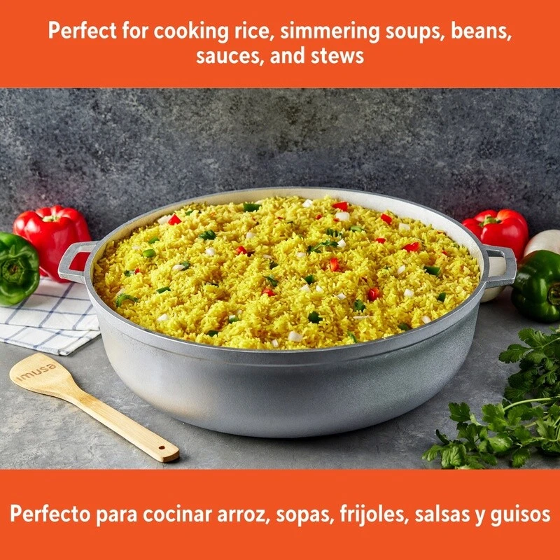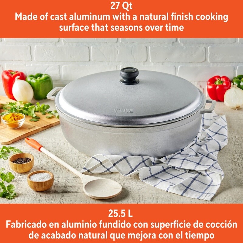 You may also like 6 Qt Nonstick Jumbo Cooker Pots Dishwasher Oven Safe Durable Aluminum Aqua New 24.55 USD 25.84 USD Free shipping 5% off Non-Stick 5 QT Saute Pans W/ Glass Lid Handles Stainless Steel Base Oven Safe US 38.9 USD 40.95 USD Free shipping 5% off 5 Quart Non-Stick Dutch Oven W/ Venting Lid Easy Meal Prep Induction Safe New 45.08 USD 47.45 USD Free shipping 5% off 13"Saute Pan W/ Glass Lid Non-Stick Coating Dishwasher Safe Kitchen Aluminum Red 56.96 USD 59.96 USD Free shipping 5% off The 27Qt Basic Caldero is an essential piece in every Hispanic kitchen, renowned for its durability and unique design. This caldero is manufactured in Colombia and is made of cast aluminum with a natural finish cooking surface that seasons over time. This cookware piece has a capacity of 27Qt. The Basic Caldero includes its tight-fitting lid, steam vent for moisture control, and a convenient knob and side handles for safe operation. The thick walls will deliver consistent and delicious results each time. With this versatile piece, you can cook a variety of different meals. Whether creating gourmet dishes, cooking rice, simmering beans, braising meats, preparing stews, crafting sauces, or enjoying comfort foods, the Basic Caldero excels. The Basic Caldero is oven-safe without the lid, making it perfect for grilling and baking. After cooking, take this caldero straight from the kitchen to the table as a stylish serving dish. Trust the Basic Caldero for balanced, home-cooked meals. It will surely become your kitchen's beloved companion, uniting tradition, and innovation in every delectable creation. Elevate your culinary experience with this enduring symbol of Hispanic heritage. LARGE COOKING CAPACITY: This caldero has a capacity of 27 quarts, making it ideal for substantial meal sizes effortlessly, providing extensive versatility in various cooking applications DURABLE AND RELIABLE: Made of cast aluminum for reliable durability, with a cooking surface that seasons over time for enhanced flavor TRADITIONAL AND CONVENIENT DESIGN: provides even heat distribution and oven safety without lid, and also features easy grip handles and tight-fitting glass lid with steam vent CULINARY ADAPTABILITY: Perfect for cooking rice, simmering soups, beans, sauces, stews, and a wide variety of other delicious dishes, this versatile caldero adapts to numerous cooking styles and recipes, making it an essential tool in any kitchen VERSATILE ESSENTIAL: Perfect for preparing a diverse array of traditional Hispanic recipes, making it an indispensable choice for everyday culinary endeavors