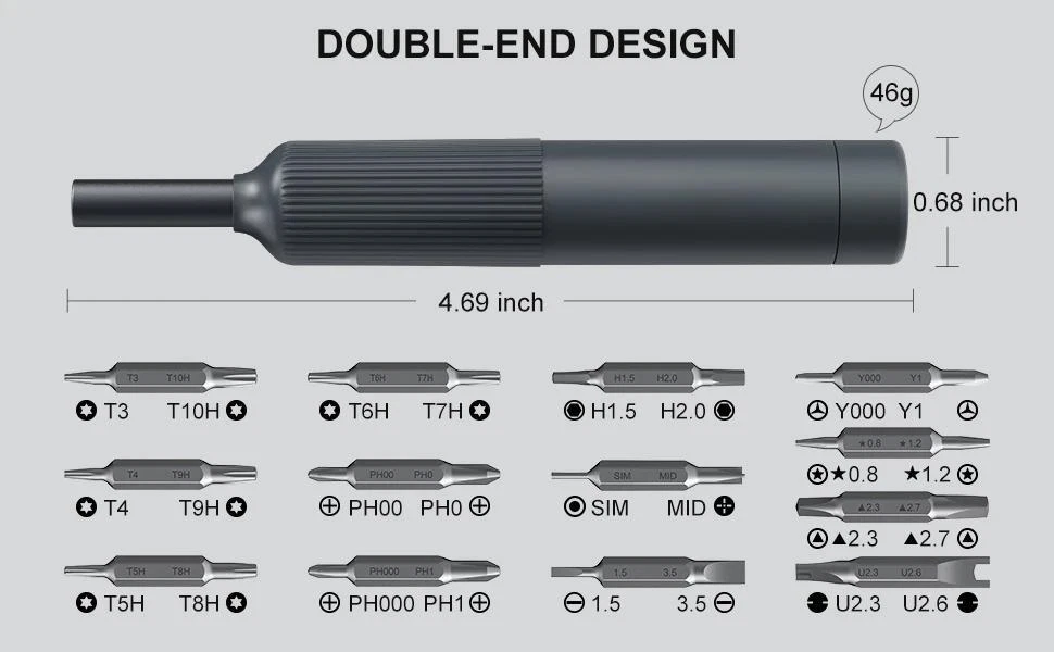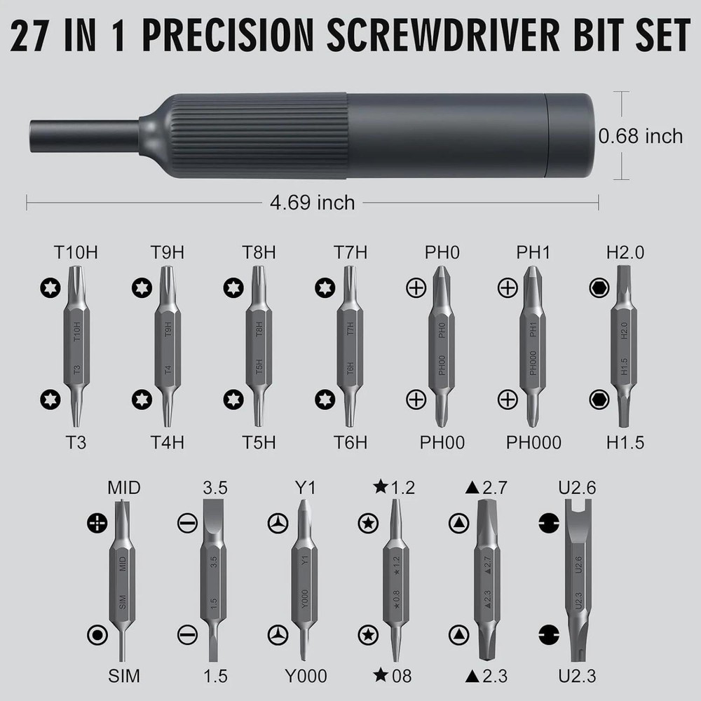 27-in-1 Precision Screwdriver Set Magnetic Bits Pen Style Manual Repair Tools Ki The magnetic slot holds 12 double ended screwdriver bits that offers utility for storage and various repair work The bit holder has a strong magnet to prevent the bit from dropping and makes switch bit quickly and easily The end cap freely rotates 360 degrees provides precise control and makes one hand use effortlessly during use The streamline handle provides a comfortable grip and higher torque output when fastening reduces hand fatigue Shipping Fast Shipping Worldwide Returns We accept returns 30 days from the package received. Payments All payments are accepted via PayPal. Thank you for shopping