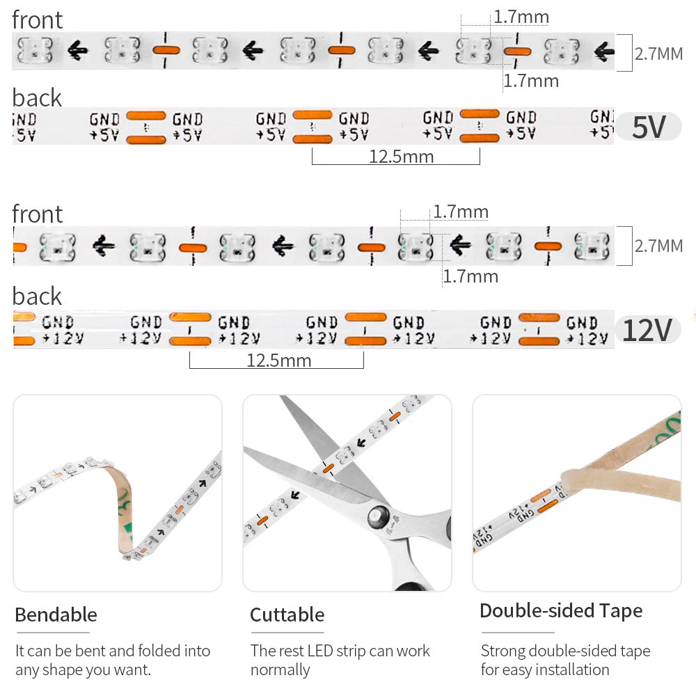 Pay Attention: 1. Led strip welded by 0.5m is very normal in an electronic product,not a quality problem. 2.Since the light strip is super narrow, don't bend it sharply to avoid breaking 3.The DC5V light strip needs a DC5V power supply, if it is greater than DC5.5V, the light strip will be damaged! The DC12V light strip needs a DC12V power supply, if it is greater than DC12.5V, the light strip will be damaged! 4.When the light strip is in white light, it will gradually change from white light to orange light. This is caused by insufficient voltage. You only need to increase the voltage to solve it. 5.The led strip need a WS2812B data Controller ( not include ) and led power supply ( not include ) to light up! Products Description: Product Name:Ultra Narrow WS2812 Smart Digital LED Strip IC Chip:WS2812B SMD Size: 2020SMD Voltage :DC5V/DC12V Color:Addressable RGB full color LED Qty:160 LEDs/m PCB width:2.7mm Watts:6w/m Cutted:Per 2 led PCB color:White IP rated:IP20;non-waterproof Pins:3 Wires = 5V+(Red wire), DATA(Green wire), GND(White wire) Length:1m/2m/3m/4m/5m(According to your choice) Operation temperature: -20℃-+45℃ Storage temperature: -20℃-+60℃ View angle: 180°