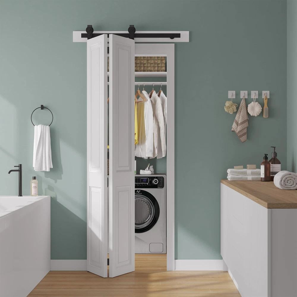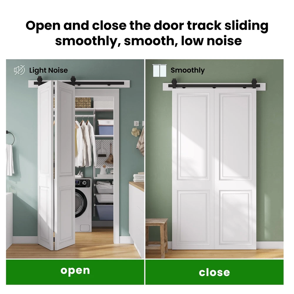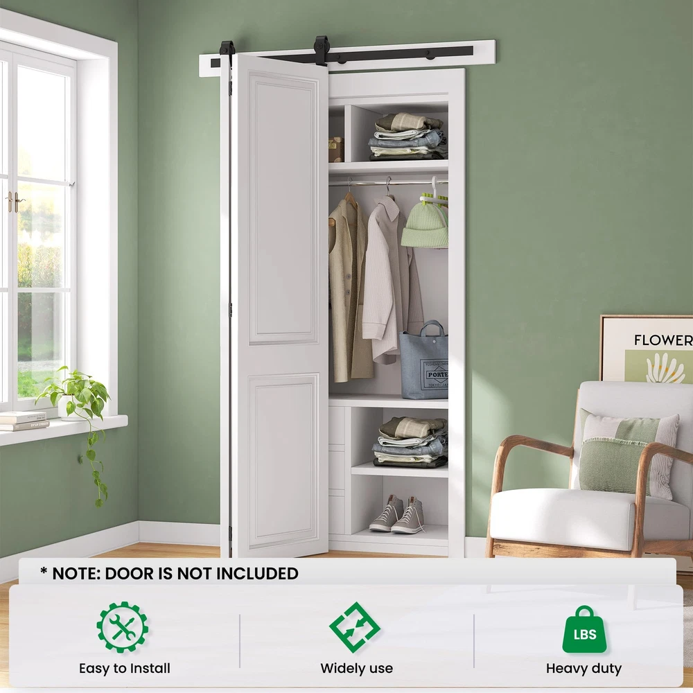 Maximize Your Space: Our bi-folding barn door kit is perfect for limited spaces, requires just 6”-8” beside your door opening. Versatile use for multiple door types and suitable for various living spaces, including the laundry room, closet, study, and more. Exceptional Quality: Constructed from heavy-duty black steel, offering robustness, wear and corrosion resistance.The rollers and tracks are designed to minimize friction, making it effortless to open and close the door. Hassle-Free Installation: Comes with a user-friendly manual with sequential instructions. Whether you're a DIY enthusiast or prefer professional help, we're here to assist you online, ensuring a smooth setup process. Dimensions: Fit Door Thickness:1" ~ 1-3/4", Per Door width: Max 12"; Door weight capacity: 360lb.The track length should be door opening size + 4",at least 6" clearance needed from top of door and ceiling. Package Lists: 1x 2.3FT Rails, 3x Rail Spacers, 1x Fixed Roller, 1x Adjustable Roller, 1x Roller Lock Bracket,1x Bottom Pivot Plate & Sleeve, 2x Top Connector Plates, 3x Butt Hinges, 3x Hex Key. All other necessary hardware is included. (Note: Door not included).