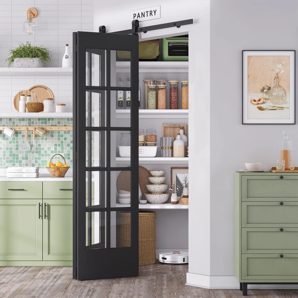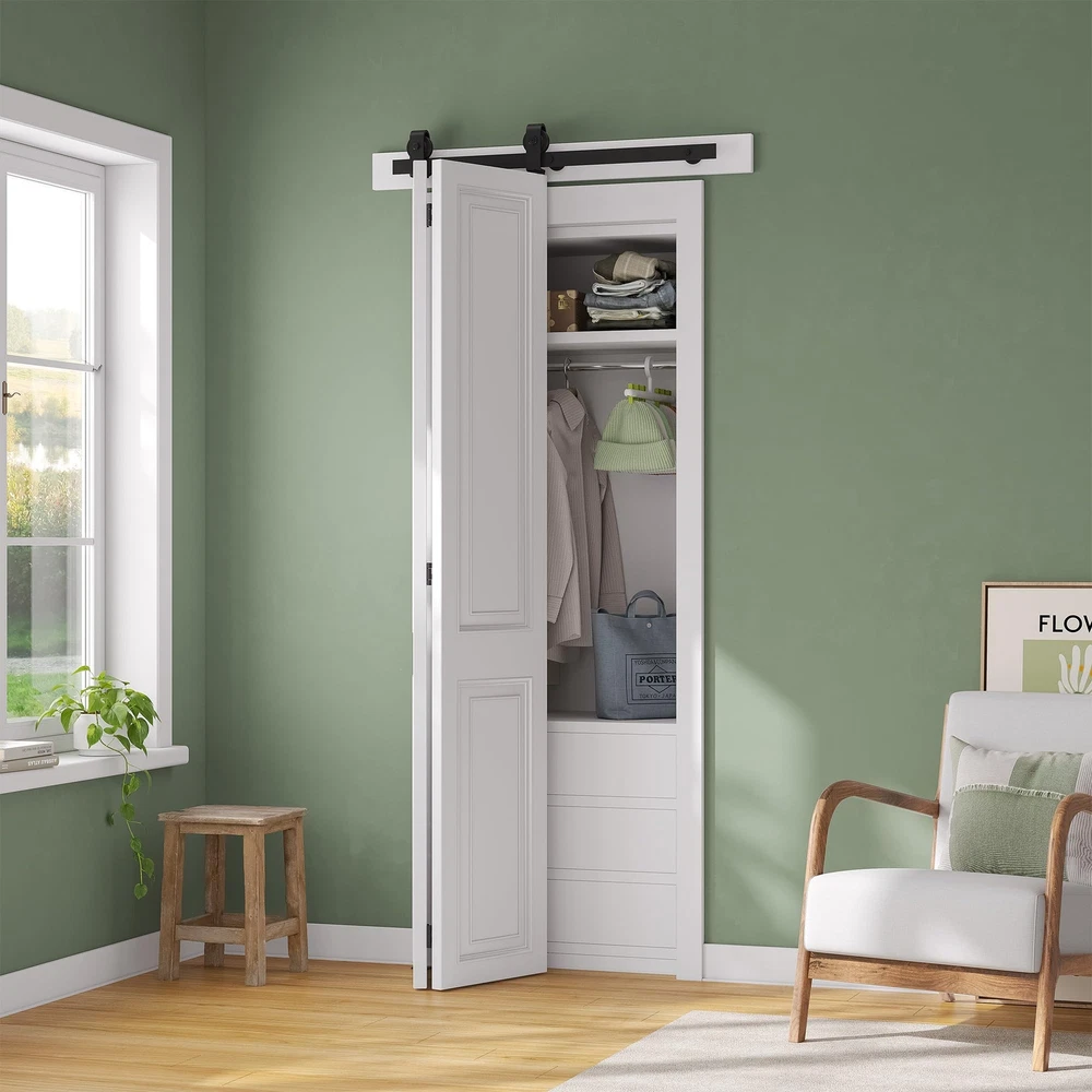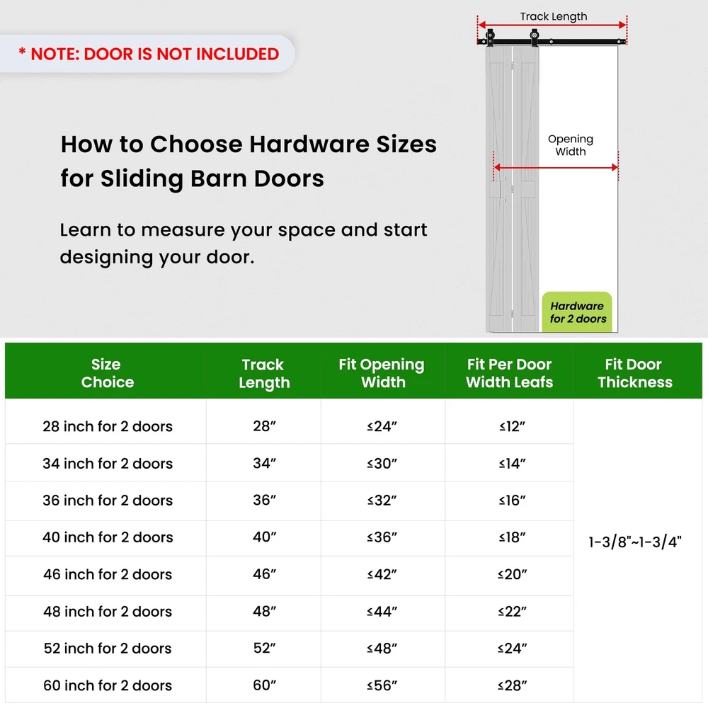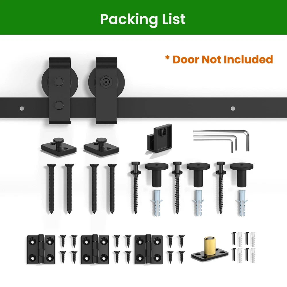 Maximize Your Space: Our bi-folding barn door kit is perfect for limited spaces, requires just 6”-8” beside your door opening. Versatile use for multiple door types and suitable for various living spaces, including the laundry room, closet, study, and more. Exceptional Quality: Constructed from heavy-duty black steel, offering robustness, wear and corrosion resistance.The rollers and tracks are designed to minimize friction, making it effortless to open and close the door. Hassle-Free Installation: Comes with a user-friendly manual with sequential instructions. Whether you're a DIY enthusiast or prefer professional help, we're here to assist you online, ensuring a smooth setup process. Dimensions: Fit Door Thickness:1" ~ 1-3/4", Per Door width: Max 12"; Door weight capacity: 360lb.The track length should be door opening size + 4",at least 6" clearance needed from top of door and ceiling. Package Lists: 1x 2.3FT Rails, 3x Rail Spacers, 1x Fixed Roller, 1x Adjustable Roller, 1x Roller Lock Bracket,1x Bottom Pivot Plate & Sleeve, 2x Top Connector Plates, 3x Butt Hinges, 3x Hex Key. All other necessary hardware is included. (Note: Door not included).