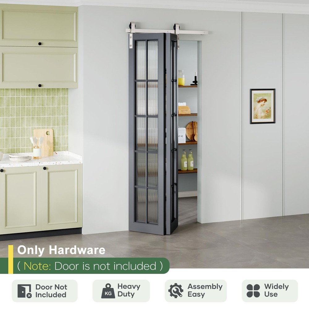 28" Brushed Nickel Bifold Sliding Barn Door Hardware Track Kit,Side Mounted Roller,Smoothly and Quietly,Assembly Easy,Fit Double 12" Bi-Folding Doors (Door Not Included) SUPERIOR QUALITY: Made of steel, and brushed nickel surface, with the benefits of sturdy and durable. The roller is a combination of high-quality bearings and nylon wheels, matched with 6mm thick track to improve the bearing capacity of the product. And it has undergone 120,000 tests to ensure quiet and smooth sliding. DESIGN CONCEPT: Different from the traditional hardware kit on the market, the folding door kit can greatly save you space. And the scope of application is wide, can be used in a variety of living occasions, such as living room, kitchen, study, closet, etc. PRODUCT DETAILS: Packing: 1x 2.3FT track, 2x roller, 2x roller rotating bracket, 1x roller fixator, 3x spacer, 3x hinge, 1x floor guide, 1x Sealing Strip. Fit Door Thickness: 1-3/8"~1-3/4"(35mm~45mm). [Friendly reminder: DOOR NOT INCLUDED] EASY TO INSTALL: The total width of the door panel plus 4" is the length of the track. We provide detailed Bi-Fold sliding barn door kit instructions with pictures and text, which can be intuitively installed by yourselves, saving the time and cost of finding an installation team for you. ALL DAY SUPPORT: We have a professional customer service team 24 hours online to help you. If there is any problem about our products, please let us know and we will try our best to solve your problem.