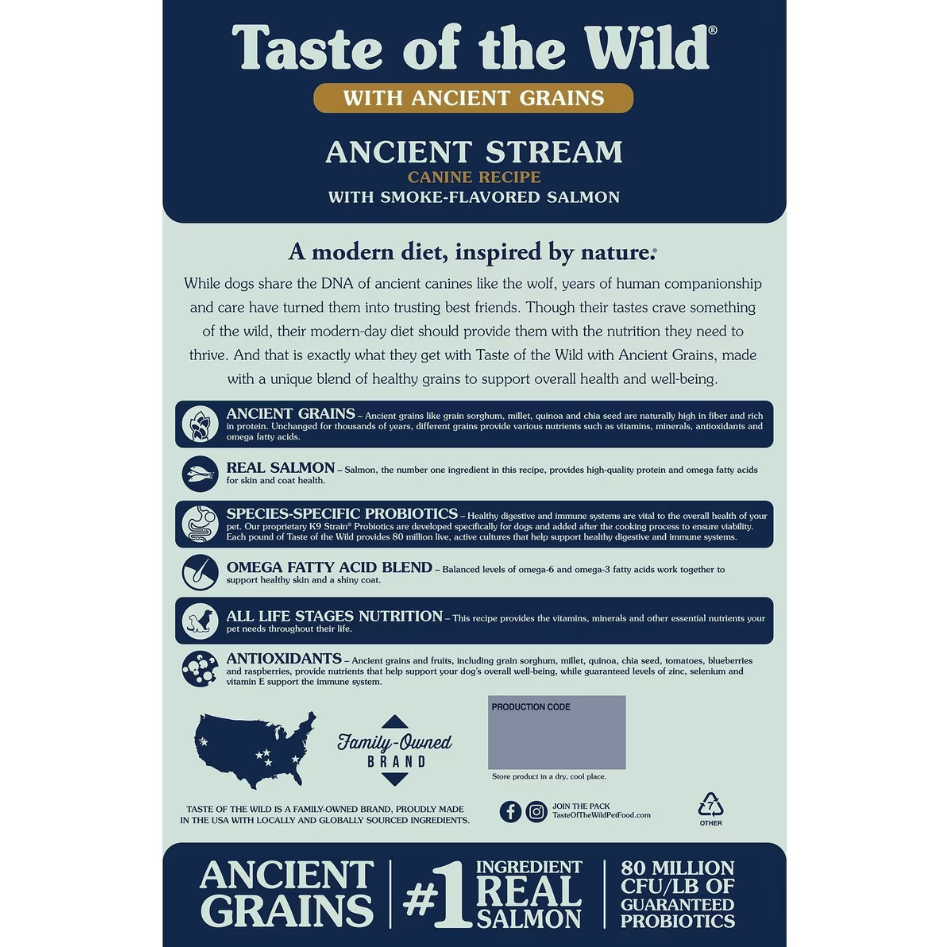 Taste of the Wild Ancient Stream Smoke-Flavored Salmon with Ancient Grains Dry Dog Food, 28-lb bag This smoke-flavored salmon dry dog food with ancient grains is crafted with real fish as the #1 ingredient and is high in protein (30%) to help support bones, joints and lean, strong muscles. Crafted with vitamins and minerals from real fruits, superfoods and ancient grains, omega fatty acids for skin and coat health and nutrients for the energy your furry friend needs thrive! Contains species-specific K9 Strain Proprietary Probiotics, along with antioxidants and prebiotics to help support healthy digestion, immune system health and overall health and wellness. Made in the USA by a family-owned brand that only uses quality ingredients from trusted domestic and global sources. A grain-inclusive recipe specially crafted for canine companions. Modern science proves that dogs share DNA with wolves. With Taste of the Wild Ancient Stream Smoke-Flavored Salmon with Ancient Grains Dry Dog Food, you can satisfy your canine’s carnivorous cravings, while also providing him with the proper ingredients and nutrition he needs to thrive. This recipe is crafted with fish along with healthy grains to support his overall health and well-being. With this recipe, you can give your dog a taste of the wild! Ingredients Salmon, Salmon Meal, Fish Meal, Grain Sorghum, Millet, Cracked Pearled Barley, Dried Yeast, Canola Oil (Preserved With Mixed Tocopherols), Whole Grain Brown Rice, Smoke-Flavored Salmon, Natural Flavor, Dried Tomato Pomace, Salmon Oil (A Source Of Dha), Quinoa, Chia Seed, Salt, Potassium Chloride, Dl-Methionine, Choline Chloride, Taurine, Dried Chicory Root, Tomatoes, Blueberries, Raspberries, Yucca Schidigera Extract, L-Carnitine, Dried Lactobacillus Plantarum Fermentation Product, Dried Bacillus Subtilis Fermentation Product, Dried Lactobacillus Acidophilus Fermentation Product, Dried Enterococcus Faecium Fermentation Product, Dried Bifidobacterium Animalis Fermentation Product, Vitamin E Supplement, Iron Proteinate, Zinc Proteinate, Copper Proteinate, Ferrous Sulfate, Zinc Sulfate, Manganese Sulfate, Copper Sulfate, Potassium Iodide, Thiamine Mononitrate, Manganese Proteinate, Ascorbic Acid, Vitamin A Supplement, Biotin, Niacin, Calcium Pantothenate, Sodium Selenite, Pyridoxine Hydrochloride, Vitamin B12 Supplement, Riboflavin, Vitamin D3 Supplement, Folic Acid. Contains A Source Of Live (Viable), Naturally Occurring Microorganisms. The Facility In Which This Food Is Made Also Makes Food That May Contain Other Ingredients. Caloric Content 3,640 kcal/kg, 413 kcal/cup
