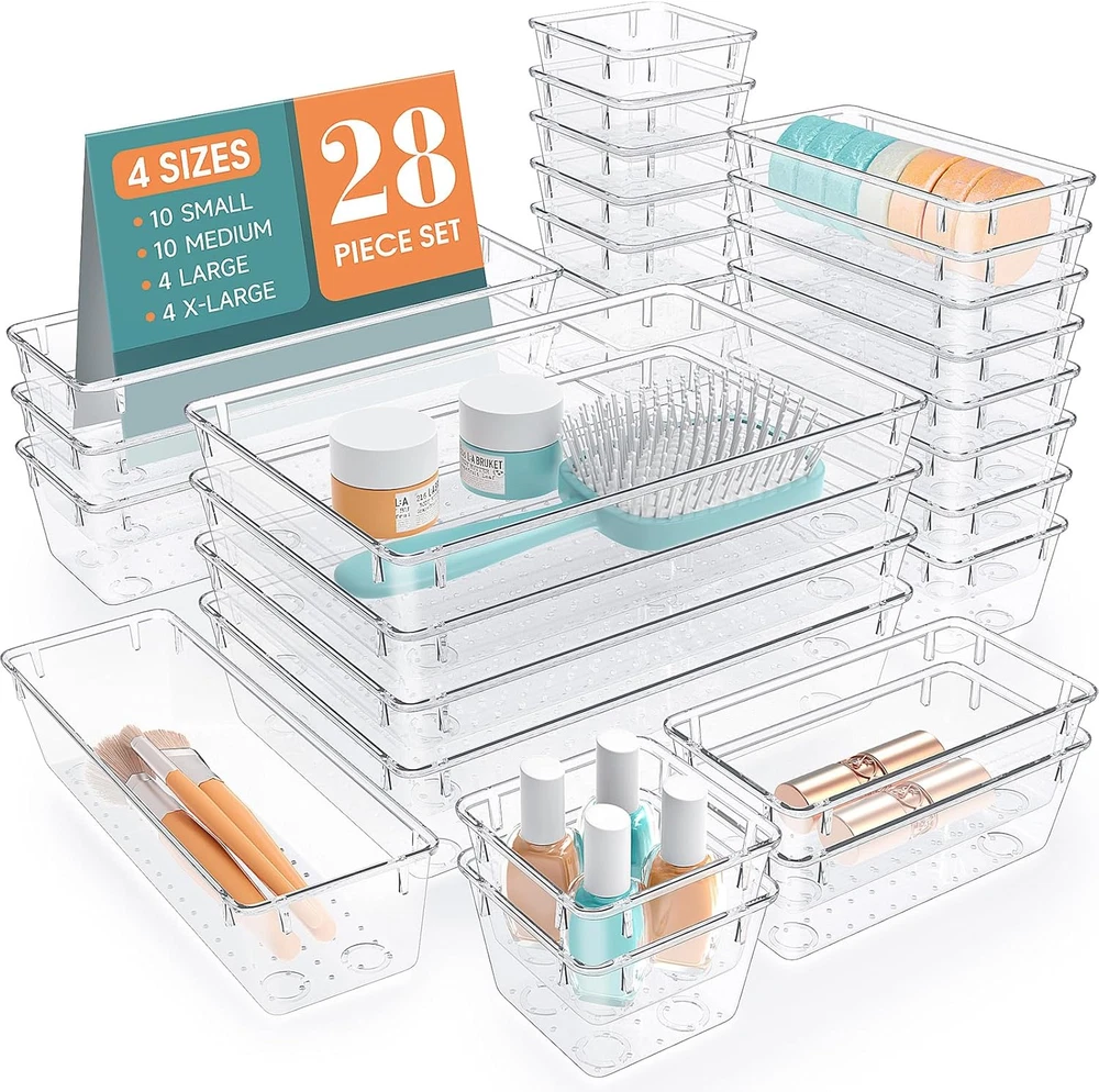 Premium Material: The transparent material of the plastic organizer bin can help to see the items inside clearly, easy to find and use. Diversified Dimensions: A set of cabinet organizer includes 25 storage bins of 4 different sizes. Includes: 9 x 6 x 1.8 inches (4pcs), 9 x 3x 1.8 inches(4pcs), 6 x 3 x 1.8 inches(10pcs), 3 x 3 x 1.8 inches(10cps). You can customize the combination to customize your own drawers. Versatile Storage Options:These clear versatile drawer dividers trays are suitable for various drawers such as dresser/bathroom/kitchen/office drawers/craft room, ideal for organizing cosmetics, pins, hair accessories, jewelry, tableware, office supplies, crafts and more. Stackable Design: These clear storage bins not only stackable but also maximize space so that your desk drawers can be effectively organized. Non-Slip Design: The bottom of the organizer bins has a non-slip design to prevent the tray from moving around when opening and closing the drawer. Product Description Premium Material Stackable Design Non-Slip Grip on Bottom Bathroom Organizer Kitchen Organizer Office Organizer