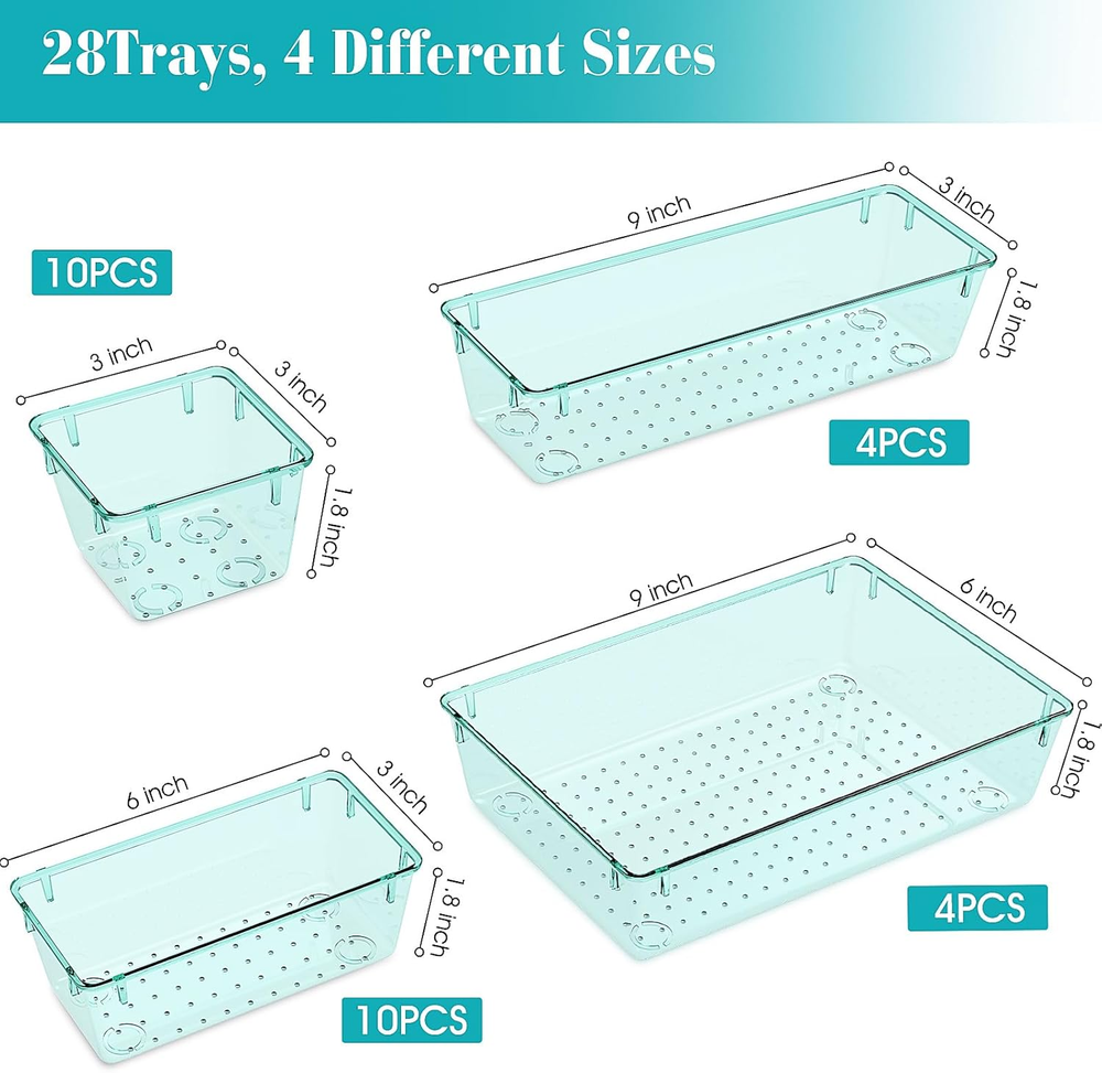 Premium Material: The transparent material of the plastic organizer bin can help to see the items inside clearly, easy to find and use. Diversified Dimensions: A set of cabinet organizer includes 25 storage bins of 4 different sizes. Includes: 9 x 6 x 1.8 inches (4pcs), 9 x 3x 1.8 inches(4pcs), 6 x 3 x 1.8 inches(10pcs), 3 x 3 x 1.8 inches(10cps). You can customize the combination to customize your own drawers. Versatile Storage Options:These clear versatile drawer dividers trays are suitable for various drawers such as dresser/bathroom/kitchen/office drawers/craft room, ideal for organizing cosmetics, pins, hair accessories, jewelry, tableware, office supplies, crafts and more. Stackable Design: These clear storage bins not only stackable but also maximize space so that your desk drawers can be effectively organized. Non-Slip Design: The bottom of the organizer bins has a non-slip design to prevent the tray from moving around when opening and closing the drawer. Product Description Premium Material Stackable Design Non-Slip Grip on Bottom Office Organizer Kitchen Organizer Bathroom Organizer