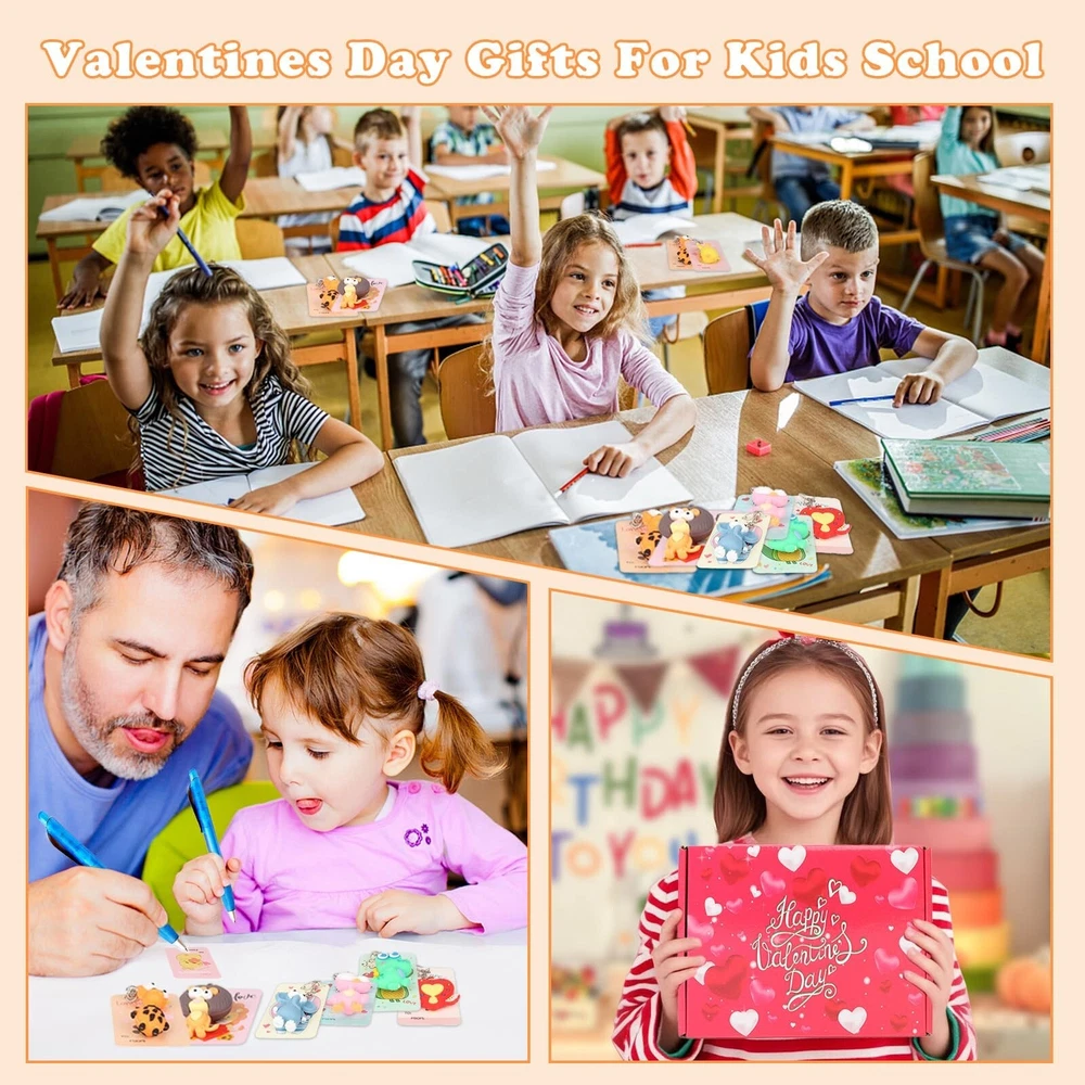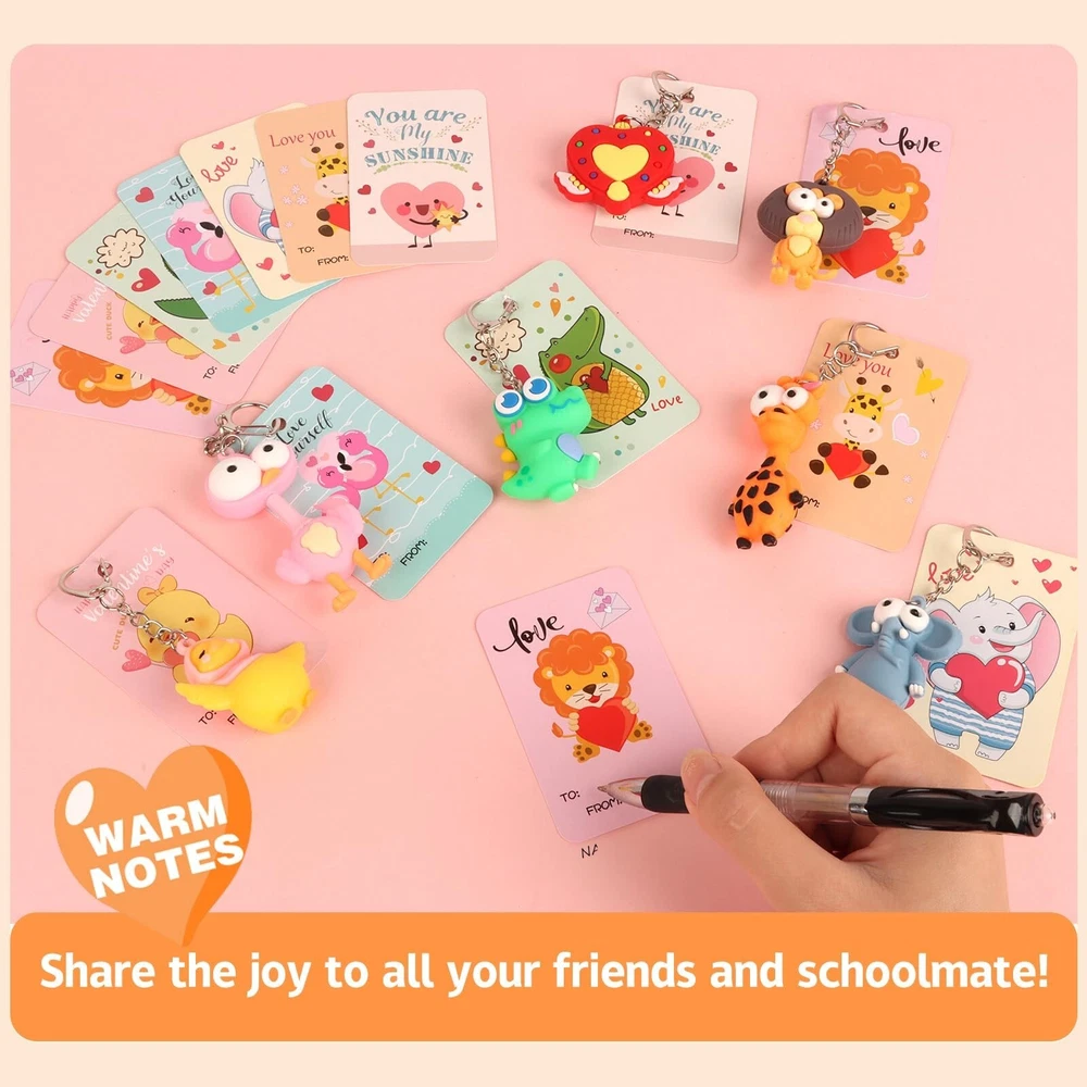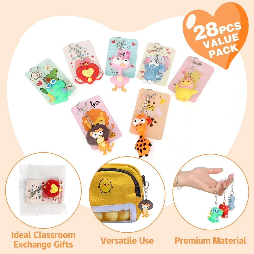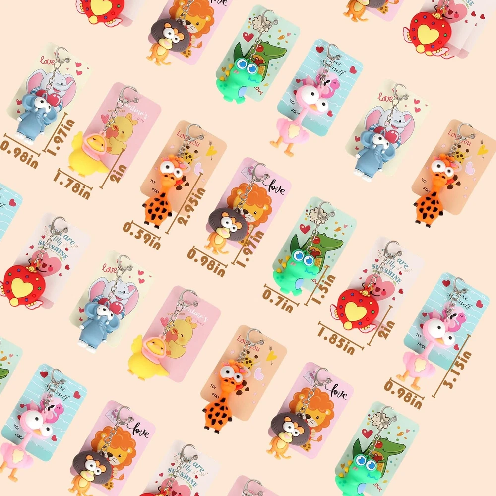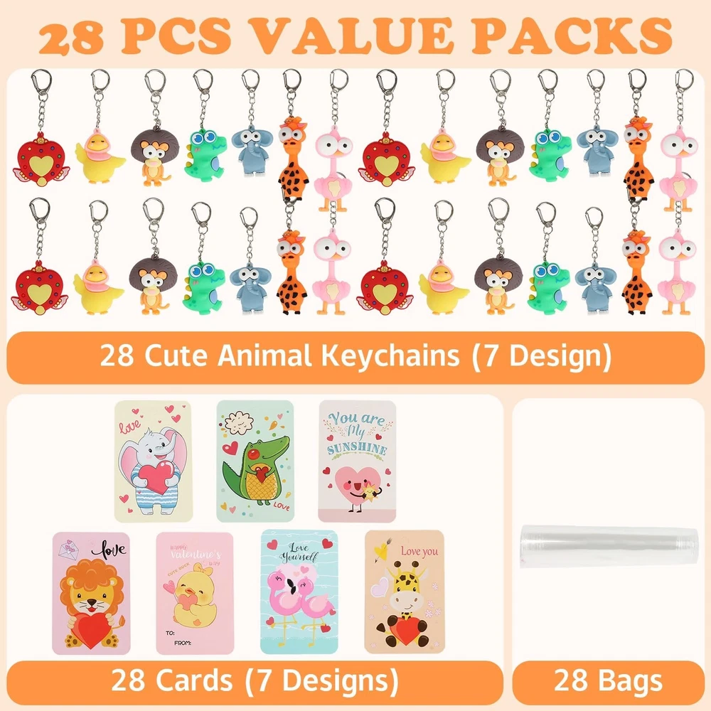 28 Pack Valentines Day Gifts for Kids with Animal Keychains, 7-Design Valentines Day Cards for Kids School, Valentine Party Favor Basket, Classroom Exchange and Games Prizes Product Details Color: Multiple Colors Material: Plastic Brand: BOYIN HUES Unit Count: 28.0 Count Theme: Animal Item dimensions L x W x H: 0.59 x 0.29 x 3 inches Occasion: Valentine's Day Manufacturer: BOYIN HUES Age Range (Description): Kid Product Dimensions: 0.59 x 0.29 x 3 inches Item Weight: 1.43 pounds Country of Origin: China Item model number: GL-73 Manufacturer recommended age: 3 years and up Department: Unisex DELUXE VALENTINE'S DAY GIFT SET: This 28-pack set features cute animal keychains paired with 7 unique Valentines Day Card designs and bags, which can put the first 2 items together and make it perfect for classroom exchanges and Valentine's Day parties, brings joy and memorable gifting experience to kids during the celebration KAWAII ANIMAL DESIGNS: The keychains and cards feature adorable designed including dinosaur, elephant, lion, ostrich, giraffe and heart. Our Valentine's day gift cards set made of quality paper card stock in 7 designs, sending blessings on a card, an ideal Valentine carnival party gift VERSATILE AND FUN: These animal keychains are not just accessories, they inspire imaginative play! Kids can use them as backpack charms or key ring decorations, providing practical daily use that goes beyond Valentines Day gifts PERSONALIZED GIFTING EXPERIENCE: Each keychain comes with a matching card, adding a personalized touch to the Valentine's Day celebration. Kids can DIY personalized greetings and gifts for friends and classmates to express friendship and gratitude. Beyond classroom exchanges, these keychains make fantastic Valentines Day gifts for kids, Holiday party favors, Gift Exchange, Game Prizes, School Prize, Love Notes and any occasions SAFE AND HIGH-QUALITY MATERIALS: Crafted from non-toxic materials, these animal keychains meet safety standards for children's toys. Designed for durability and long-lasting enjoyment, parents can have peace of mind while kids enjoy their new treasures