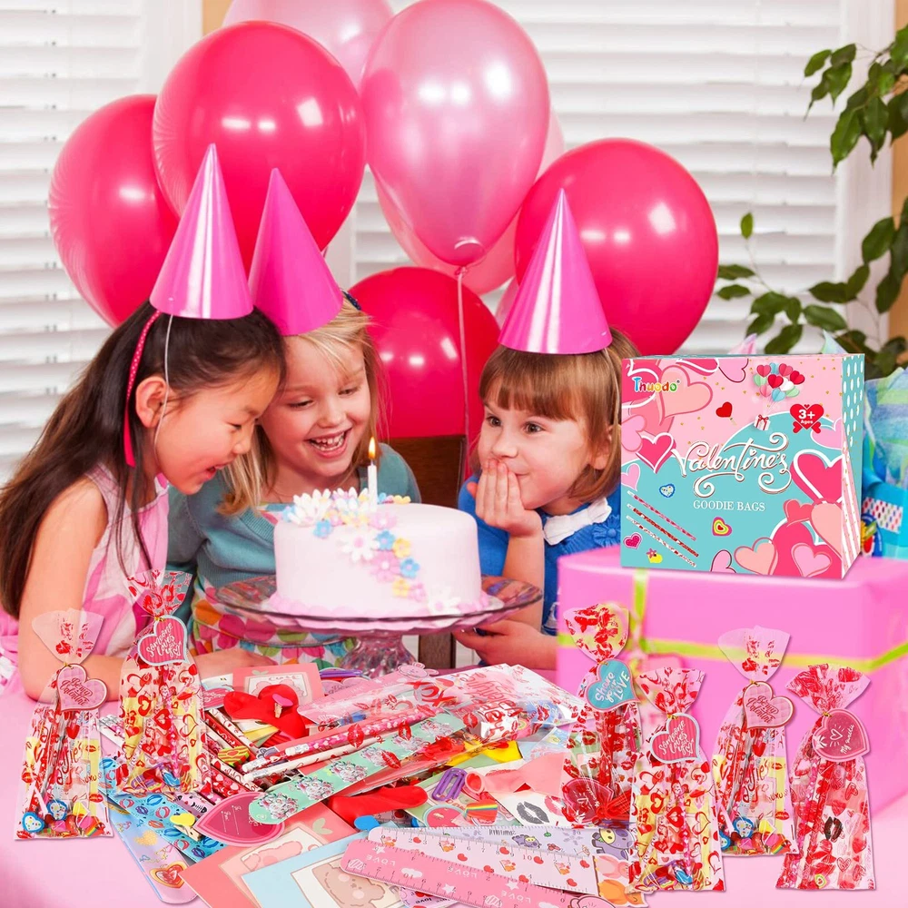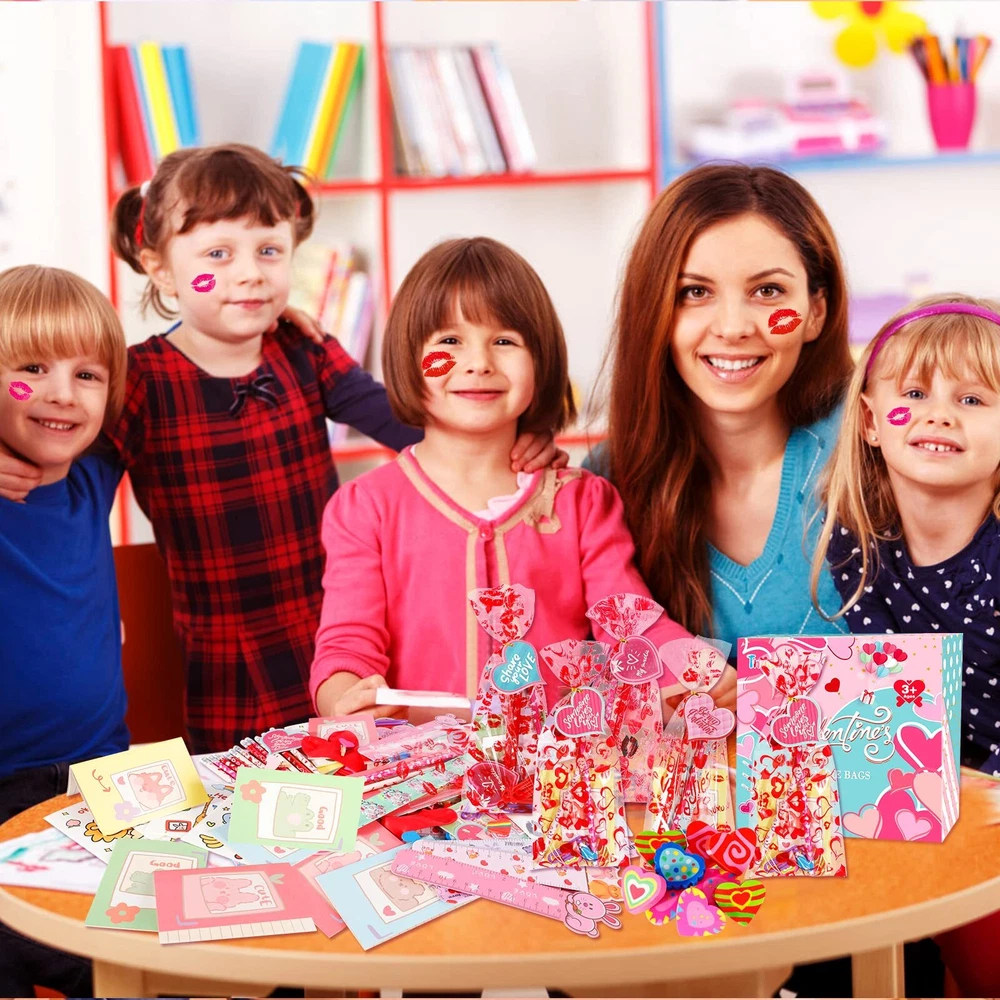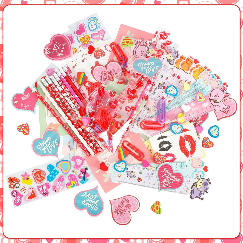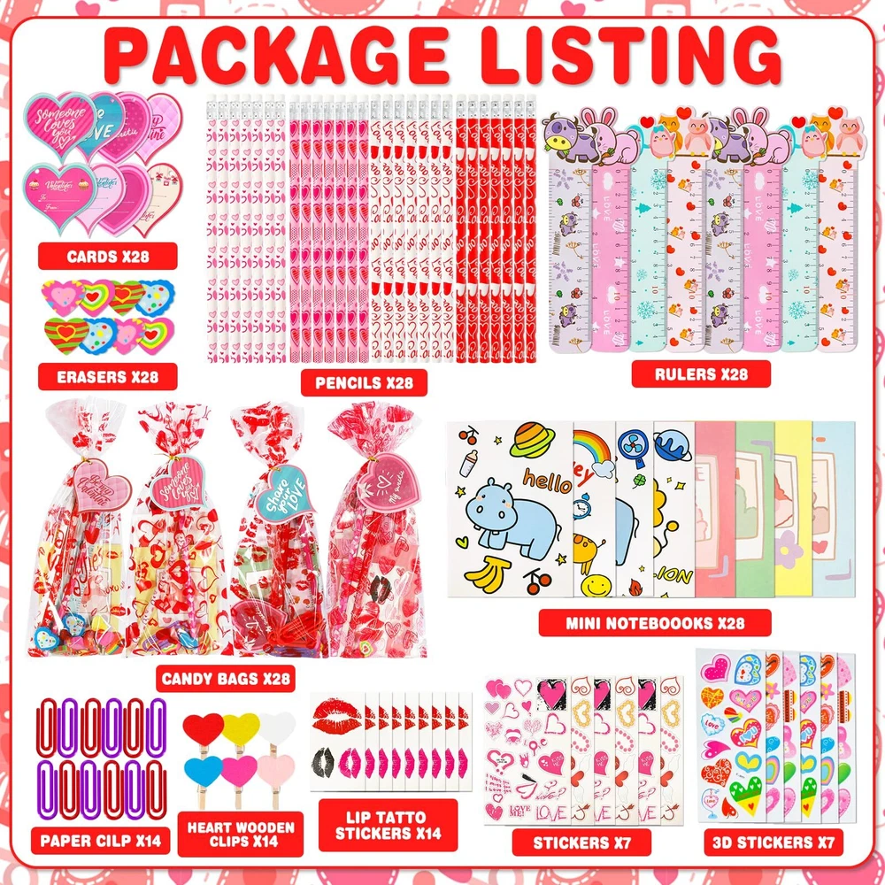 Valentine Stationery Set: 28 x Heart cards, 28 x Candy bags, 28 x Pencils, 28 x Mini Notebooks, 28 x Stickers, 28 x Clips, 28 x Erasers, 28 x Rulers, total of 224 pieces, perfect as a classroom stationery set gifts for children. Valentine's Day Theme Design: Valentine's Day heart cards, stickers, erasers, clips have cute and cozy heart shapes, Valentine's Day heart cards, notebooks, ruler, candy bags and stickers are designed with cute patterns, pencil are also infused with sweet Valentine's Day colors and patterns. DIY Gifts Time: Use unique Valentine's cards and stationery for fun DIY projects with your child! Write down classmates' names and get creative together. These goodie bags are ideal as Valentine's Day gifts for classroom exchanges, encouraging your kids to socialize and express gratitude to classmates, friends and teachers. Safety and Quality: The Valentine stationerys are made of plastic, which are safe for children. Meet US Toy Standard. ASTM & CPC Test Approved. However, the set contain small parts, children should pay attention to prevent swallowing. Ideal Valentine's Day Gifts: This kids' Valentine's stationery gifts set can bring joy to various occasions, suitable for classroom gifts exchanges, Valentine's party favors, classroom prizes, rewards, and more.