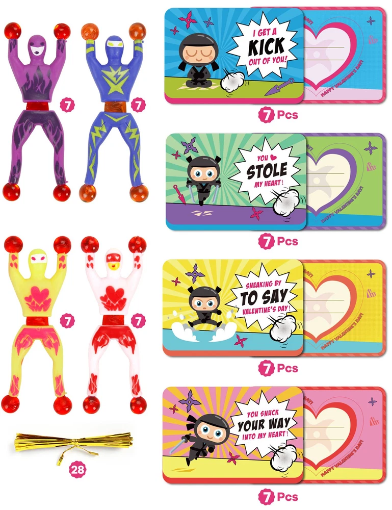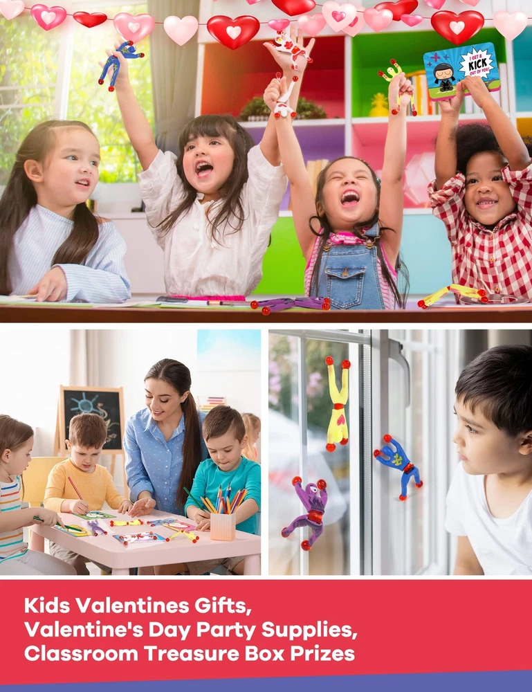 Unique Design: The colorful sticky wall climbers toys are super light and easy to throw/toss. Hands and feet have small glue balls. Glue balls have good resilience and extended flexibility. Four styles of cards with different themes to match the toy, lively and active. Super Value Pack: Our Valentine's gift Cards with wall climbers sticky toys Set includes 28 cards in 4 designs and 28 sticky men. It comes with everything you need to make great valentines gifts for your kids’ classroom valentines exchange. Ideal Valentines Gifts: Sticky wall climbing toys are ideal toys for kids to enjoy. kids will love tossing and flinging them so that they stick to the ceiling, walls, windows, tables, and virtually any surface. Let your kids or students have a perfect valentine with our Valentine wall climbers. the stretchy climbing man also can be an ideal gift for your classmates, students, colleagues, family members, and more. Safe Materials and Size: Safety test approved. The length can be stretched without breaking, and the stickiness is good. Durable and reusable and can be washed to keep it clean. the window climbers are about 3.7*1.3 inches, convenient for you to take them with you wherever you go. More Applications: These sticky toys tumble down a wall like a mountain climber scales down a mountain. A perfect chance to practice your handwork ability, kids can play it for fun, turn it over on walls, windows, or tables, like spiderman. These novelty tiny toys are great gifts for friends, classmates, and students in school activities like valentine's party favors, gift exchanging, Themed parties, celebrations, party bag stuffers and gifts, party games, or carnivals.