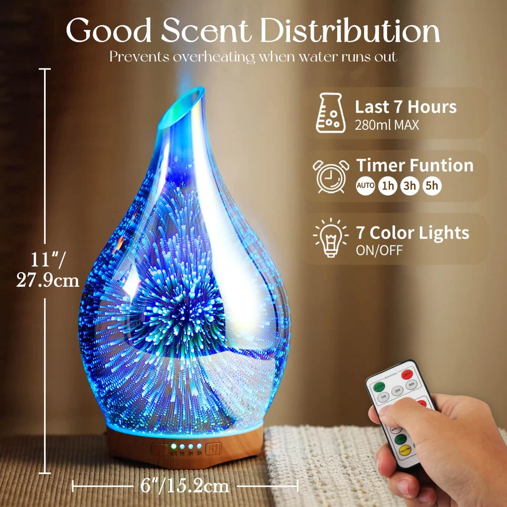 ★REMOTE CONTROL - You could be easily change the light color and mist when the oil diffuser is away from your bed.The remote's max reading range is 65ft. ★MESMERIZING AND RELAXING - The aromatherapy diffuser helps to enhance mood by offering a restful and purified space, as well as to maintain physical health. ★FOUR TIMER SETTINGS, LASTS ON 7 HOURS - You can set the timer by pressing the left button for auto,1 hour,3 hours or 5 hours.The 280ml essential oil diffuser lasts on 7 hours and has a good output of mist. Fits room not larger than 20*20(ft). ★WATERLESS AUTO-OFF - As a safe waterless auto-off design that prevents it from overheating when runs out of water,which assures safety for you and your family. Perfect to set and go to sleep without worry. ★SURPRISING WEDDING GIFT - It is good choice to use this lovely diffuser as gifts to your friends and families, lovers.