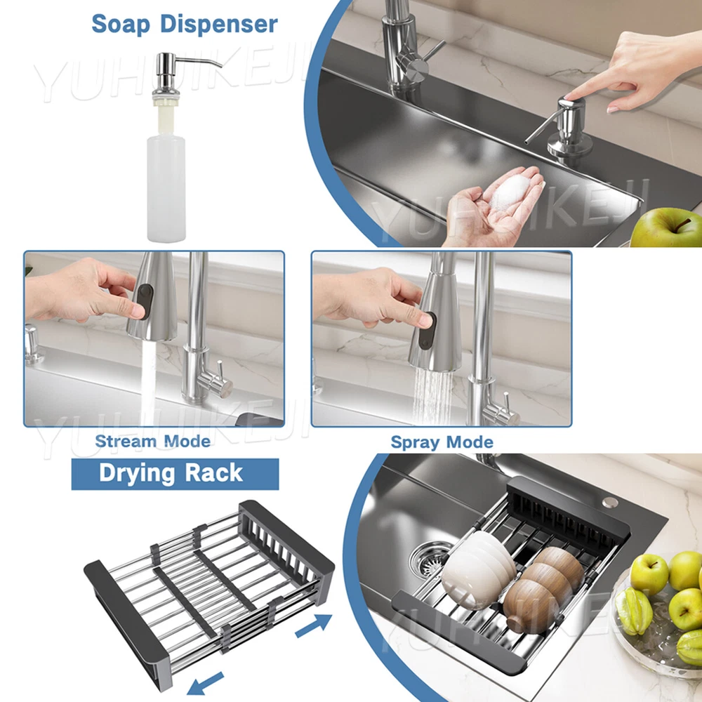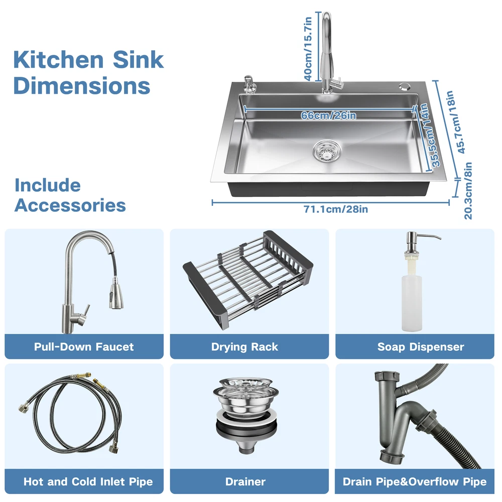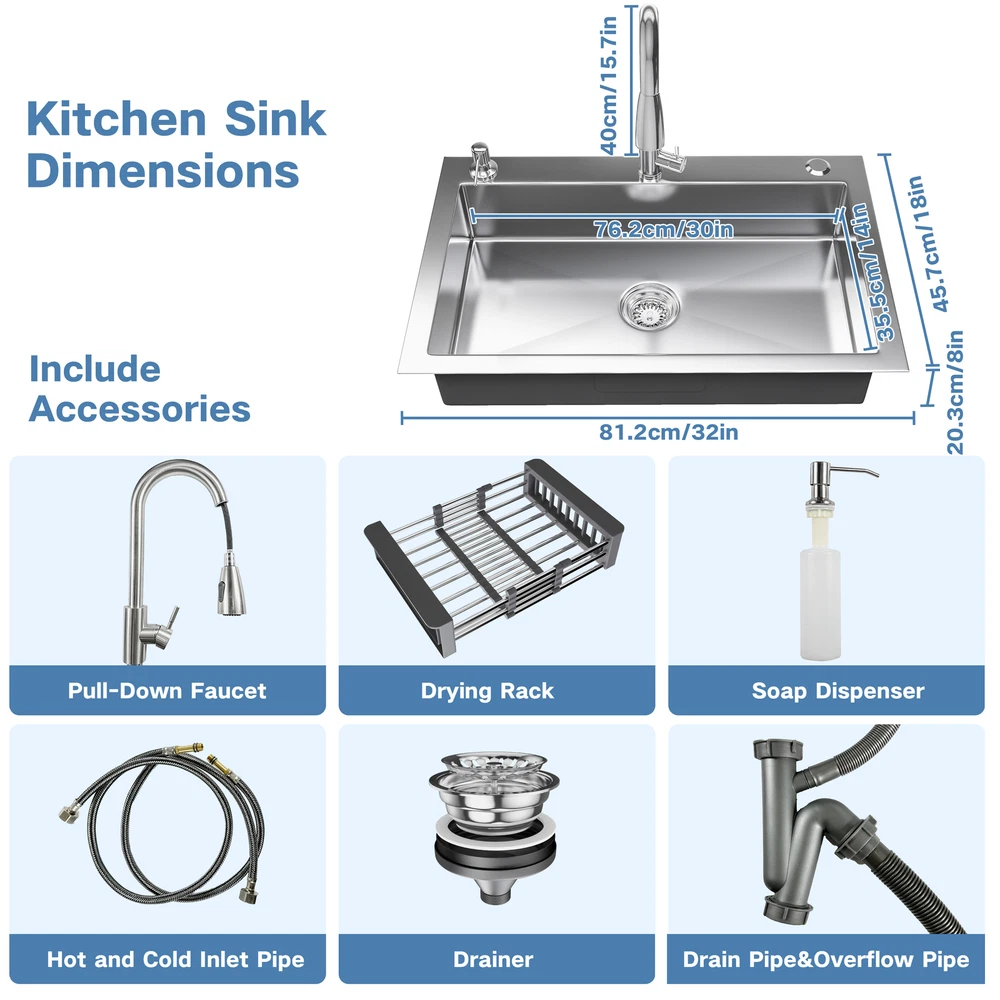 Feature: 【kitchen Sink and Faucet Combo Set】: Our kitchen sink equipped with 6 accessories(Pull-Down Kitchen Faucet,Drying Rack,Soap Dispenser,Hot and Cold Inlet Pipe,Sink Strainer and Stopper,Drain Pipe and Overflow Pipe).The 360 degree swivel and pull-out spray spout provides a full range of washing for your kitchen sink, which allows you to clean deeper corners of the sink more efficiently. 【T-304(18/10) Stainless Steel and Nano-Coating 】: Our kitchen sink is crafted of high-quality 304 stainless steel, which is strong, durable, rust-resistant. Nano-coating technology on the surface of our stainless steel sink not only enhances its aesthetic appeal but also offers resistance to stains and scratches, ensuring it remains looking pristine. 【X-Shaped Guide Groove and R10 Rounded Corners】: The sink bottom with X grooves for fast drainage to avoid water from pooling, smooth R10 rounded corners for easy cleaning.And This sink comes with three reserved holes and overflow, you can install faucets/soap dispensers/water purifiers etc through the pre-set holes.The overflow port can prevent water from overflowing the sink. 【Product Size And Installation Cutout Size】: The large sink base featured thick sound dampening rubber pads to absorb noise and vibration, nontoxic anti-condensation undercoating fully sprayed to prevent moisture accumulation and protect your cabinet from damage. 【Multiple Installation Modes and Countertops】: This sink is very easy to install and supports top-mount installation, undermount installation, drop-in installation.So it can be installed in home kitchens, bar counters, restaurant commercial workstation, and RV.If you have any issues, please contact us anytime. Dimension: 28Inch: Outside dimensions: 28"W x 18"D | Interior dimensions: 26"W x 14"D x 8"H 30Inch: Outside dimensions: 30"W x 18"D | Interior dimensions: 28"W x 14"D x 8"H 32Inch: Outside dimensions: 32"W x 18"D | Interior dimensions: 30"W x 14"D x 8"H Package including: Kitchen sink x 1 Pull-Down Faucet x 1 Hot and Cold Inlet Pipe x 1 Drying Rack x 1 Drainer x 1 Soap Dispenser x 1 Drain Pipe & Overflow Pipe x 1 On Sep 29, 2024 at 20:05:31 PDT, seller added the following information: On Oct 2, 2024 at 21:17:37 PDT, seller added the following information: