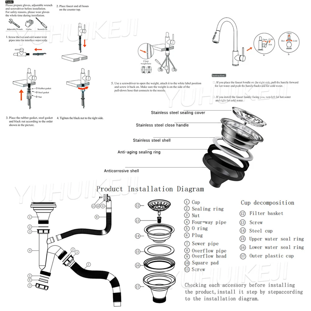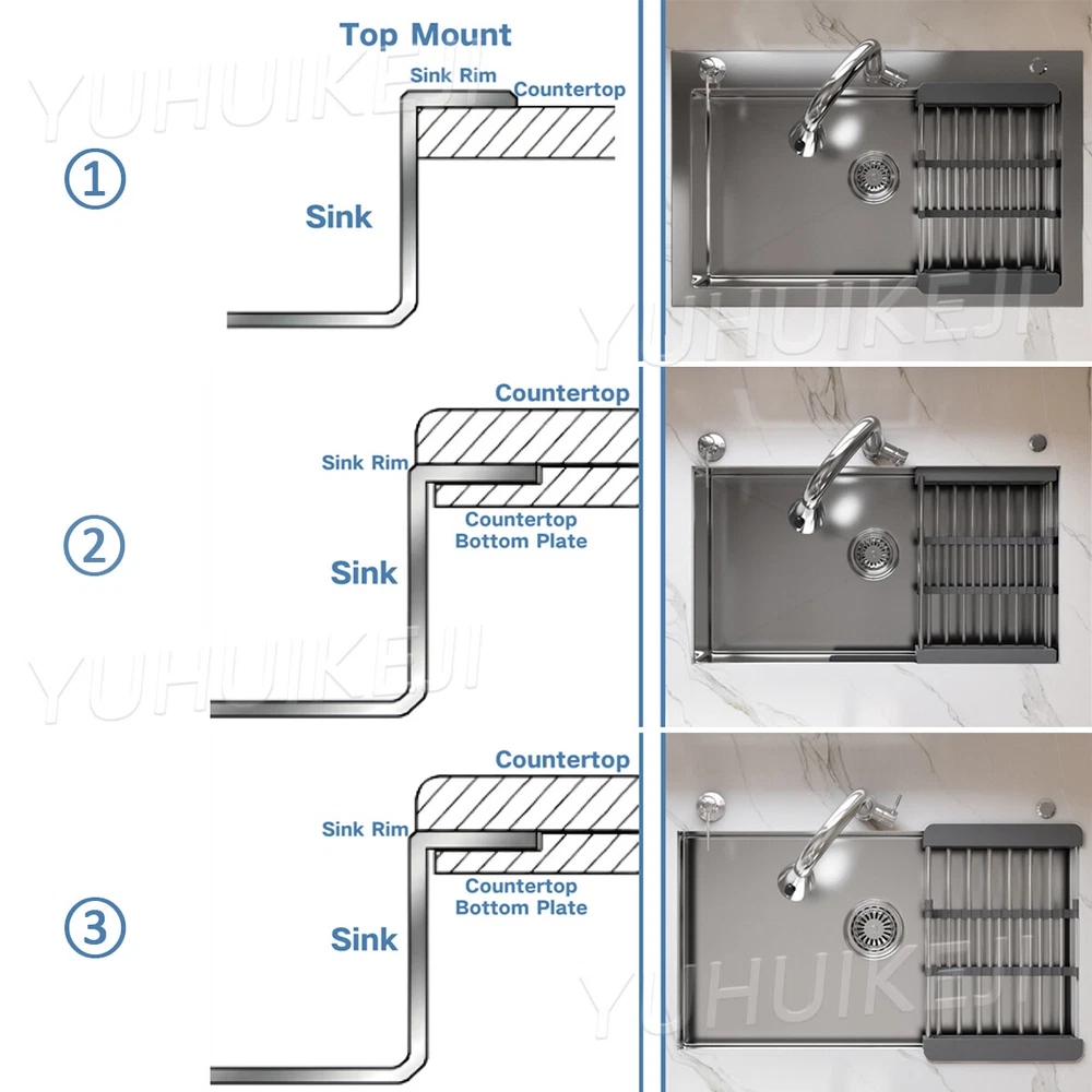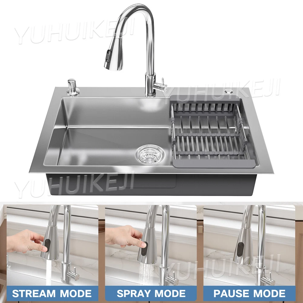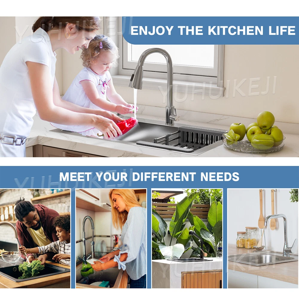 Feature: 【kitchen Sink and Faucet Combo Set】: Our kitchen sink equipped with 6 accessories(Pull-Down Kitchen Faucet,Drying Rack,Soap Dispenser,Hot and Cold Inlet Pipe,Sink Strainer and Stopper,Drain Pipe and Overflow Pipe).The 360 degree swivel and pull-out spray spout provides a full range of washing for your kitchen sink, which allows you to clean deeper corners of the sink more efficiently. 【T-304(18/10) Stainless Steel and Nano-Coating 】: Our kitchen sink is crafted of high-quality 304 stainless steel, which is strong, durable, rust-resistant. Nano-coating technology on the surface of our stainless steel sink not only enhances its aesthetic appeal but also offers resistance to stains and scratches, ensuring it remains looking pristine. 【X-Shaped Guide Groove and R10 Rounded Corners】: The sink bottom with X grooves for fast drainage to avoid water from pooling, smooth R10 rounded corners for easy cleaning.And This sink comes with three reserved holes and overflow, you can install faucets/soap dispensers/water purifiers etc through the pre-set holes.The overflow port can prevent water from overflowing the sink. 【Product Size And Installation Cutout Size】: The large sink base featured thick sound dampening rubber pads to absorb noise and vibration, nontoxic anti-condensation undercoating fully sprayed to prevent moisture accumulation and protect your cabinet from damage. 【Multiple Installation Modes and Countertops】: This sink is very easy to install and supports top-mount installation, undermount installation, drop-in installation.So it can be installed in home kitchens, bar counters, restaurant commercial workstation, and RV.If you have any issues, please contact us anytime. Dimension: 28Inch: Outside dimensions: 28"W x 18"D | Interior dimensions: 26"W x 14"D x 8"H 30Inch: Outside dimensions: 30"W x 18"D | Interior dimensions: 28"W x 14"D x 8"H 32Inch: Outside dimensions: 32"W x 18"D | Interior dimensions: 30"W x 14"D x 8"H Package including: Kitchen sink x 1 Pull-Down Faucet x 1 Hot and Cold Inlet Pipe x 1 Drying Rack x 1 Drainer x 1 Soap Dispenser x 1 Drain Pipe & Overflow Pipe x 1 On Sep 29, 2024 at 20:05:31 PDT, seller added the following information: On Oct 2, 2024 at 21:17:37 PDT, seller added the following information: