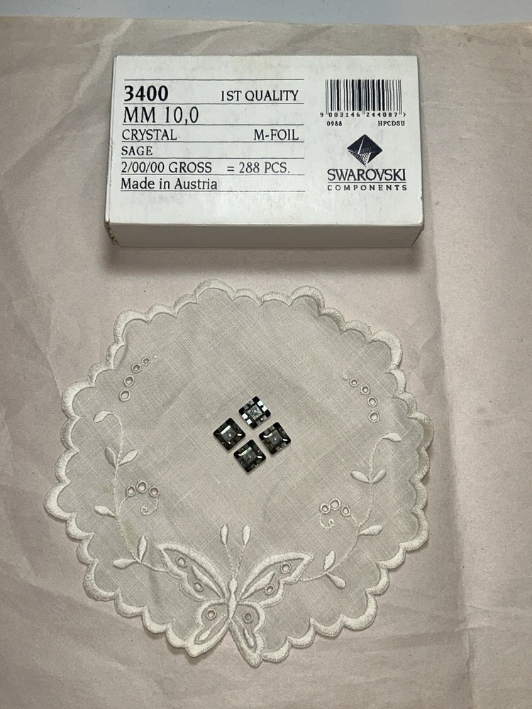 Swarovski Components 3400 MM 10,0 Crystal Sage PACK OF 288 sequins. These are square shaped beads/sequins as they have a hole drilled in the center. Gorgeous and rare sage, dark green color that is no longer sold or made for retail. Dark green that reflects light green and gold. PLEASE NOTE: Opened box in the photo is a sample to show the product. All packs for sale are UNOPENED with ALL CONTENTS and SEALED if it isn’t a sliding box.