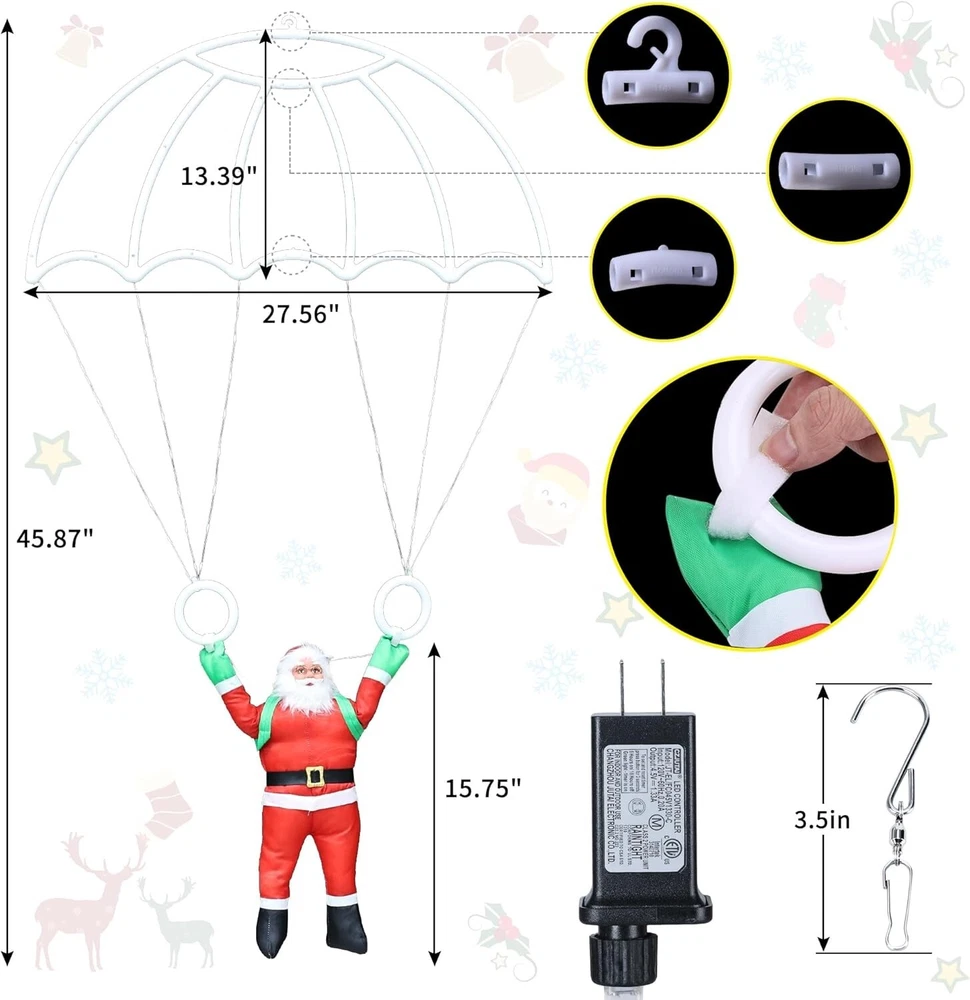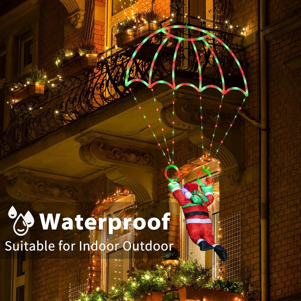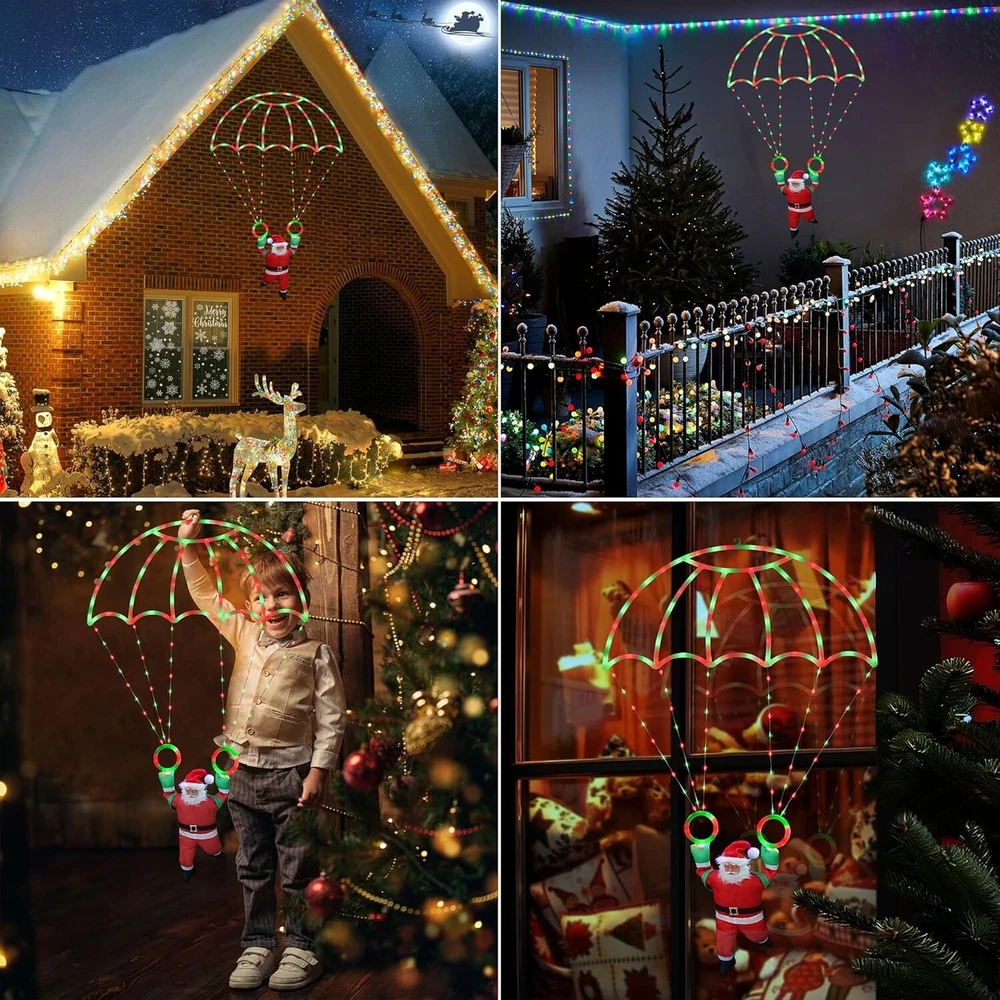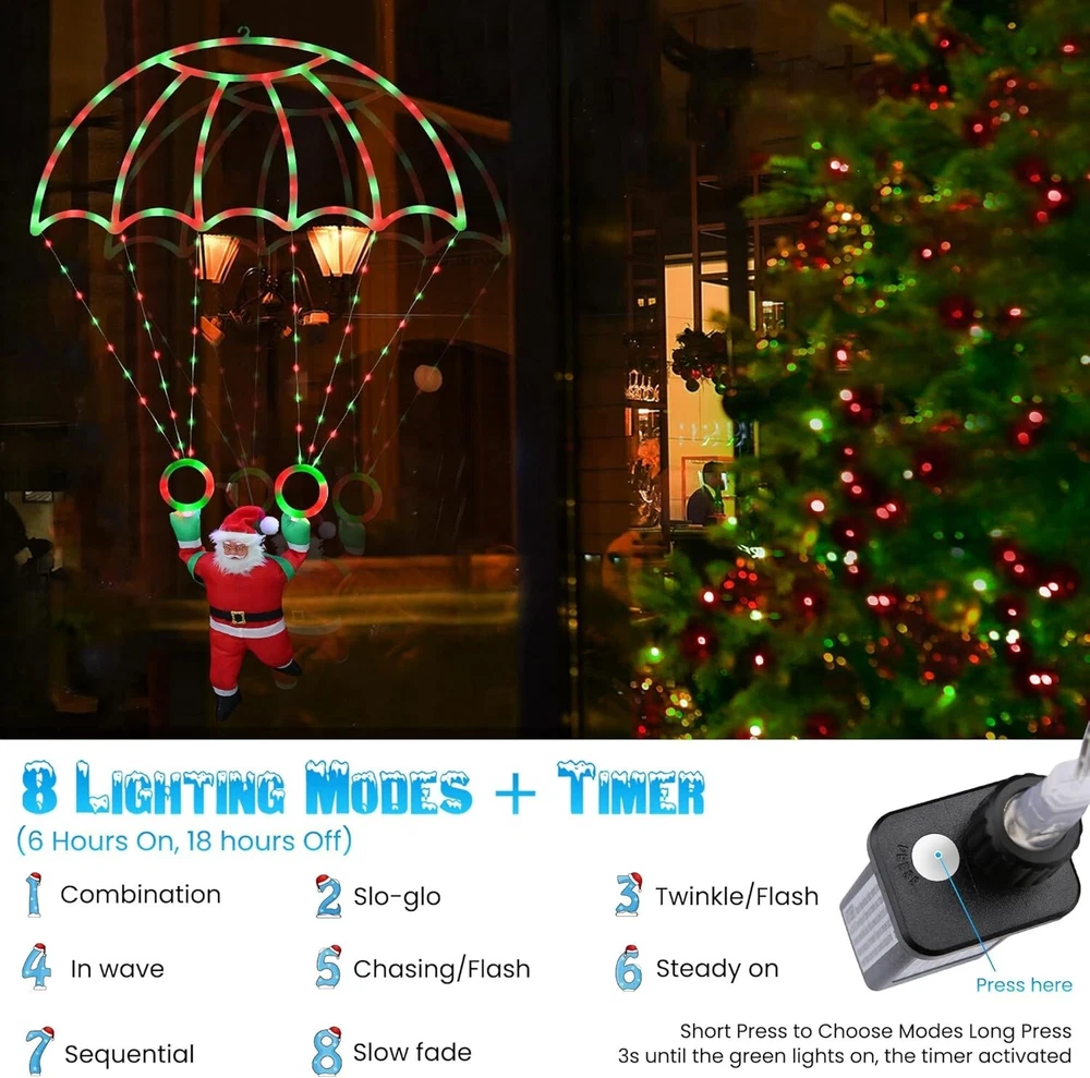 About this item 2024 Newest Exclusive Release Christmas Parachute Lights : Unique-designed Christmas lights composed of a 2.8 * 2.3ft lighted parachute and a 1.3ft detachable santa, will add a lot of festive atmosphere for your Christmas. The xmas decorative lights is popular and fashionable to your yard, garden, window, wall, roof, eave, balcony decor. 8 Modes & Timer and Memory Function : Red & Green Christmas hanging lights contain a steady-on mode and 7 different kinds of blinking modes, which meet your various Christmas decor needs. There is a button on the adapter, short press to choose the mode, long press 3s until the green light is on then the timer is activated. The memory chip will save your last mode setting, free your hand and no need to reset the mode every time. Safe to Use & Waterproof : Outdoor Christmas lights are powered by 30V low voltage, safe to touch, compatible with all of USA standard outlets, with UL certified. This outdoor holiday decorative lights is waterproof, suitable for indoor and outdoor holiday decorations (NOTE : The adapter is not waterproof, please kindly protect the power adapter away from the water) Ideal Christmas Decor & Good Gift Idea - The Christmas window lights can be hung indoors or outdoors to create a warm and romantic atmosphere for your holidays. You can use it to decorate your house, garden, yard, trees, roof, room, and window; it can also be a great Christmas gift for your families, children, lovers, friends, and colleagues during Christmas, New Year, Wedding, Party, Birthday and other occasions. Widely Used : The led parachute lights is suitable for indoor & outdoor Christmas decorations, such as wall, window, garden, yard, roof, eave, balcony, etc…