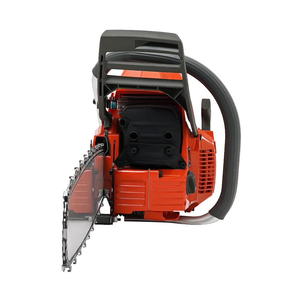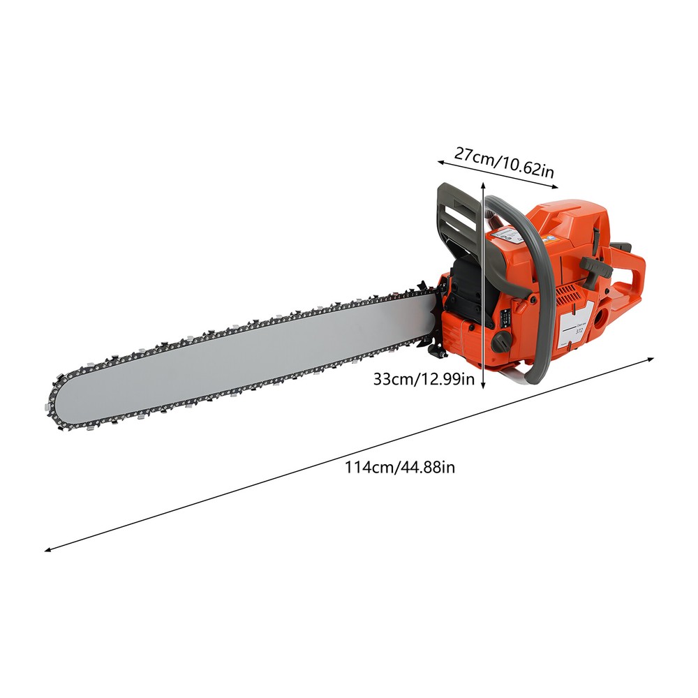 71CC 28" Gasoline Chainsaw Cordless Power Chain Saw Wood Cutting 2-Stroke Engine Handheld Cordless Petrol Chain Saw, Gas Powered Chainsaw, 71cc Gasoline Chainsaw Power Head Description Selected materials, excellent performance and powerful engine make this gas chainsaw an efficient professional cutting tool, which saves you time and labor. With silent and vibration-dampening design, an ergonomic handle, a braking baffle, and a pull-start ignition method, it is safe and comfortable to use. Key Features Made to Last: It is made of high-quality nylon housing, aluminum handle, and Mn steel guide bar&chain , which is insulating, strong, durable, wear-resistant , and not easy to deform. Excellent Performance : The 2-stoke engine with 71cc displacement, 10000rpm high speed, and 3.9KW high power, the high-magnetic flywheel with thickened blade design, the filter, the pressure-reducing valve, and the 28" guide chain can achieve fast cutting, thus providing excellent performance(about 28" cutting diameter). Cost Saving: The combination of this quality carburetor and automatic lubricating oil system enables the product to provide a stable and economical supply of chains and bars, quickly and easily adjust chain tension, and reduce friction and oil consumption by 20%, thereby improving cutting performance and extending service life. High Safety: The double protection switches that must be pressed at the same time to work can prevent the machine from accidentally starting. The heat-sink holes on the machine also ensure good heat dissipation. Moreover, the guide plate has an inertia-activated chain brake to reduce the possibility of injury due to recoil, and the practical gloves and the widened brake baffle that makes emergency braking can protect your hands from hurting, avoid sawdust splashing, and improve safety. Convenient and Comfortable: With a hand-pull spring-loaded starter handle, premium spark plug, safety switch, and throttle switch, it's convenient to use. Its Cordless design and non-slip shock-absorbing ergonomic handle allow you to operate more easily and freely. Moreover, the silencing and damping designs can effectively reduce noise and vibration, providing you with a multi-angle cutting by changing the direction of the machine, which is convenient for you to use. Easy to Install: The simple structure, complete accessories, and English manual allow you to install this product in minutes, saving you time and labor. Protective Package: To prevent the product from being damaged and bumped during transportation, we packed it with foam to protect your products to the maximum extent possible. Customer Service: We aim to provide quality products and services. If you have problems, please feel free to contact us. We will reply and solve the problem for you as soon as possible. Details Tool Bag: It can help you organize your accessories in an orderly manner, making it easy for you to carry around and effectively preventing accessory loss . Fuel Tanks: The 18.6Oz translucent fuel tank and 4.73Oz chain fuel tank allow for large capacity, a convenient mixture of fuels, and long-term use without frequent filling. Double Nuts and Piston Rings: The guide plate is fixed with double bolts to ensure the stability of the product and make the chain not easy to loosen. The rings make the product sealing performance better, which can increase the machine's power. Guide Bar Cover: It allows for convenient storage and better protection of the guide bar when not in use. Application It is suitable for garden pruning, forest logging, chopping wood, bamboo harvesting, timber making, ice cutting, tree pruning, clearing land, preparing firewood or cleaning up, outdoor wood cutting, for home, garden, ranch, and farm use. How to Assemble the Chainsaw Install the jam teeth in the right direction. Install the guide bar. Install the chain. Cover the side cover. Adjust the chain tightness. Tighten the screw. How to Start the Chainsaw 1. Push the brake. 2. Move the On/Off switch to the On position. 3. Pull the choke knob fully out to position. 4. Pull the start handle(Max 6 times). 5. Push the choke knob back fully. 6. Pull the starter until the engine start. Specification Color: Orange Style: Modern Assembly Required: Yes Material: Nylon, Mn Steel, Aluminum Engine Type: Single Cylinder, Air-cooled, 2-Stroke Ignition System: Self-reset Pull Start Fuel Tank Capacity: 550ml/18.6Oz Chain Fuel Tank Capacity: 140ml/4.73Oz Bore : 45.2mm/1.78inch Volume: 116dB Power: 3.9kw Speed: 10000rpm Displacement: 71cc Oil Mixture: 25:1( 90# Gasoline : Oil) Max. Cutting Diameter: 71cm/28in Chain Length: 71cm/28inch Guide Plate Package Size: 85*15*3cm/33.46*5.9*1.18inch Guide Plate Gross Weight: 2.2kg/4.85lbs Host Gross Weight: 7.5kg/16.53lbs Host Package Size: 70*29*35cm/27.56*11.42*13.78inch Package Included 1* Gas Chainsaw 1* Chain 1* Guide Plate 1* Tool Bag 1 Pair*Glooves 1 Pair*Goggles 1* English Manual Other Accessories for Assembly Notes Before starting the gasoline chainsaw, please ensure that it fits well with the guide bar, and use a wrench to adjust the chain. When installing the guide bar, please note that the screw column on the side cover must be aligned with the guide bar hole before installation(The function of the screw column is to adjust the chain tightness.). Please use gasoline 90# with special 2-cycle engine oil and never use pure gasoline . Gasoline and oil mixture ratio: 25:1. The oil output can be controlled to turn larger to the left and smaller to the right. Please note that after the first ignition sound, closing the choke and repeatedly pulling the start handle will suck in too much fuel and prevent the engine from starting. If the choke knob is not fully pushed back after pulling the starter handle up to 6 times, the engine preheating may be missed. Too much fuel will flow out and submerge the spark plug. Then you can't start the chainsaw. The damper is used to regulate air intake. When the engine is cold or not