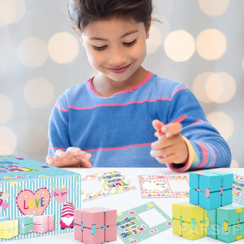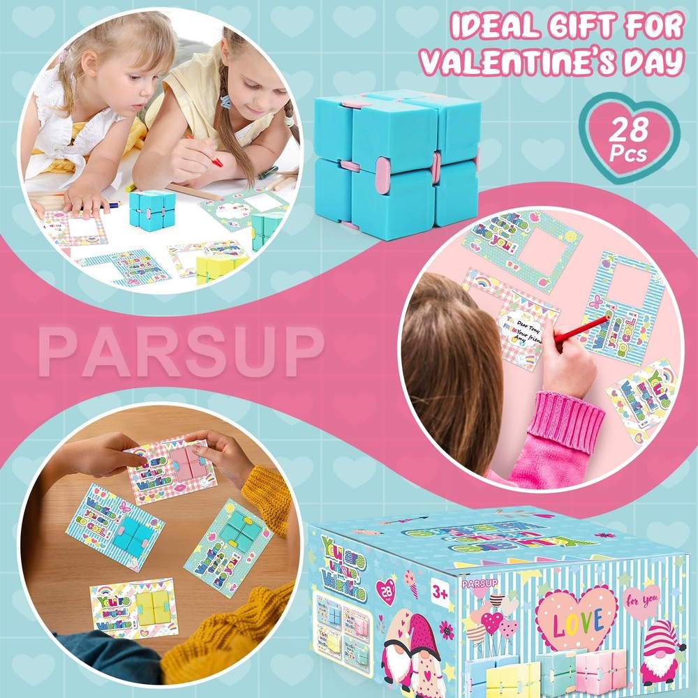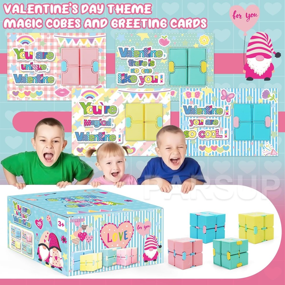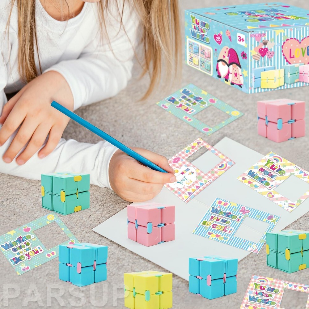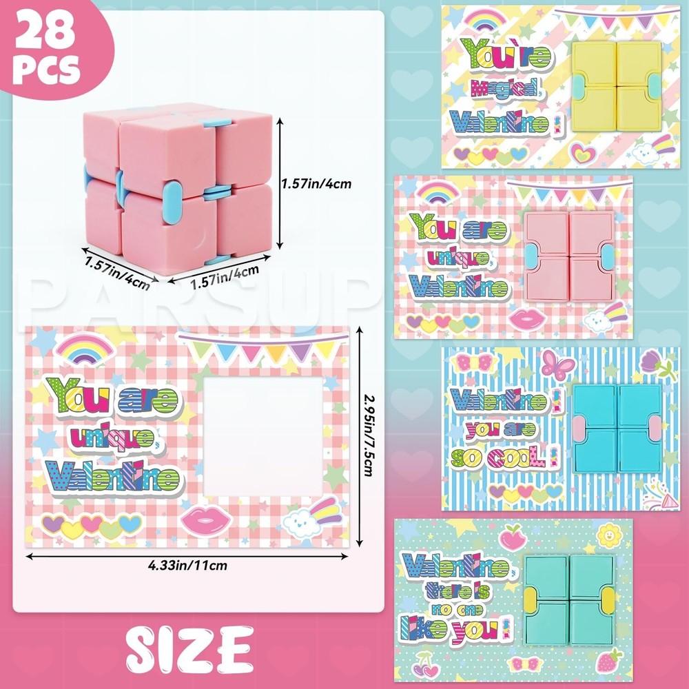 28 Pack Valentines Day Gifts for Kids, 4 Color Infinity Cubes with Valentines Gift Cards for Boys Girls School Classroom Exchange Prize, Valentines Party Favors Toys Product Details Product Dimensions: 4 x 6 x 1 inches Item Weight: 2.2 pounds Country of Origin: China Item model number: 20241005 Manufacturer recommended age: 12 months and up Manufacturer: PARSUP VALUABLE PACKYou will get 28pcs Valentines theme cute cards, 28pcs infinity cubes in 4 color, red, yellow, pink, purple, orange, each measuring 1.57inch. The infinity cubes are great valentine's greeting gifts for kids school exchange on Valentine's Day. PREMIUM MATERIALThese kids valentines day gifts are made of high-quality ABS plastic, safety and smooth edge, also each can be pieced together firmly. Draw your unrestrained imagination and hands-on ability to assemble different shapes. VALENTINES DAY PARTY FAVORSThese Valentines infinity cubes are small sized 1.57, mini and lightweight, nice size for school valentines exchange, also its great gift to put in goodie bag for party favor and gives to kids, students on Valentines day, this make class time a lot of fun. VALENTINES GIFTOur cute valentines infinity cubes are sweet additions to your Valentine's treat bags, suitable for kids Valentine's Day gift exchange, kids valentines day party favors, valentines party pack, valentines giveaway, school classroom prizes, etc. 100% High-quality Customer ServiceContact us if you are not satisfied with it for any reason. We'll provide great customer service. Please notice that reecommended Age Grade is 3+ years old.