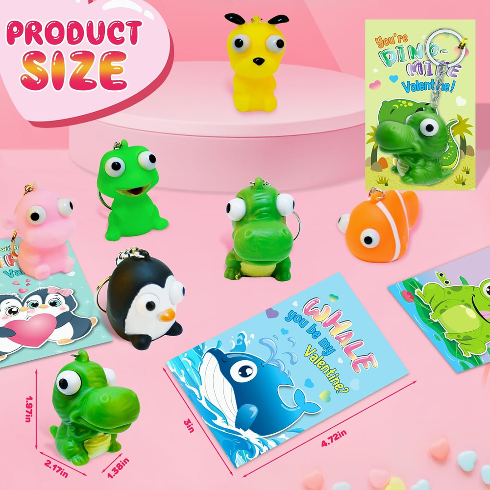 Great Valentine's Day Gift Set - If you're looking for a unique and funny Valentine's Day gift for kids, our popping eyes keychain is the perfect choice! This set includes 28 pcs cards + 28 animal keychains in 7 different styles. Each Valentines Card has a special blessing that matches the animal keychains. Quantity enough for your child to share with classmates. Let’s prepare interesting Valentine’s Day gifts for the kids! Great Valentine's Day Gift Set - If you're looking for a unique and funny Valentine's Day gift for kids, our popping eyes keychain is the perfect choice! This set includes 28 pcs cards + 28 animal keychains in 7 different styles. Each Valentines Card has a special blessing that matches the animal keychains. Quantity enough for your child to share with classmates. Let’s prepare interesting Valentine’s Day gifts for the kids! Funny Card Design - Compared with traditional Valentine's Day cards, our cards add more lovely cartoon elements and rich colors, making your child's gift stand out. Each Valentines card has a cute, humorous messages that uniquely match the animal keychains. Get ready to write blessings on the card and exchange it on Valentine’s Day, will bring endless fun to the kids. High Quality & Easy to Assembly - For the health and safety of children, we use high demanding quality standards. Animal keychains made of safety material, non-toxic, non-BPA. And the cards part is made of high quality coated paper, which is Clear printing and bright colors. The entire set of products has passed the children's product safety test and complies with US toy standards. Tie the keychain and card together with a twist tie, the unique Valentine's Day gift is ready! Fit for Various Occasions - This great value is Ideal gifts for kids valentines day gifts, school event prizes,valentines class exchanging gifts and other. By squeezing the animal, children can atisfying relax fun and entertaining, both entertaining and practical.We believe kids will like this, but if you are not satisfied for any reason, please let us know and we will refund your amount. Product Description