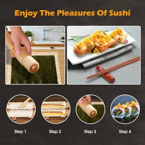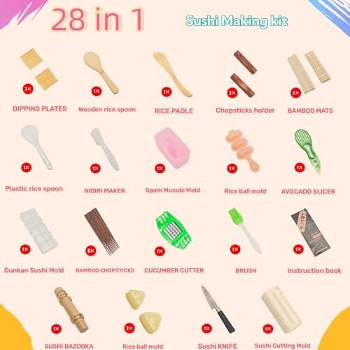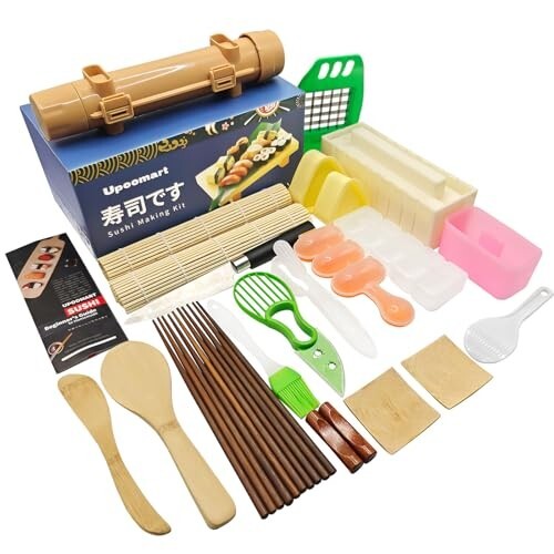 Sushi Making Kit, 28 in 1 Sushi Making Set for Beginner &Pros, with Bamboo Sushi Mats, Sushi Bazooka, Onigiri Mold, Rice Paddle, Sushi Knife, Sushi ball maker, cucumber slicer & More Size: 28 in1 Sushi Making Kit Brand Upoomart Style Traditional Shape Rectangular Product Care Instructions Hand Wash Only Size 28 in1 Sushi Making Kit Customer Reviews 4.4 4.4 out of 5 stars 4.4 out of 5 stars Best Sellers Rank #102,193 in Kitchen & Dining #112 in About this item Ideal Sushi Making kit: From Beginners to Pros Sushi Makers,Upoomart comprehensive kit allows you to unleash your creativity and prepare various types of sushi effortlessly. The cutting former ensures each individual basic sushi roll is perfectly shaped. COMPLETE KITCHEN KIT: Our sushi making kit comes with a bazooka sushi roller, bamboo sushi mats,triangle/nigiri/gunkan sushi maker, cutting mold, cucumber slicer, sushi knife, avocado slicer, oil brush, chopsticks, chopstick holders, sauce dishes, spreader, rice paddle. We have included all the accessories in one set. PARENT-CHILD FUN SUSHI time:PARENT-CHILD FUN SUSHI MAKING KIT - The sushi maker ball and musubi mold makes easily for both adults and kids to get started and unleash your sushi creativity and storytelling fun. The parents can do sushi with kids and enjoy a unforgetable sushi family time together. FOOD-GRADE BPA-FREE MATERIAL - Built to last and safe to use. Our sushi mats are crafted from natural bamboo, and tied with cotton strings. The thick hinges of our Sushi Bazooka Roller are reinforced for durability. Besides, our extra sharp chef's sushi knife is upgraded with a nonstick coating to ensure quick and smooth sushi cutting COST-EFFECTIVE SUSHI SOLUTION: Say goodbye to costly restaurant bills with Upoomart sushi making kit! Save money while exploring personalized sushi flavors. Prepare delicious sushi effortlessly and in no time with this DIY sushi making kit! It's a ideal gift for friends, family, and your significant other. (Item does not ship to Miami&Doral, FL), have any problem please contact us !
