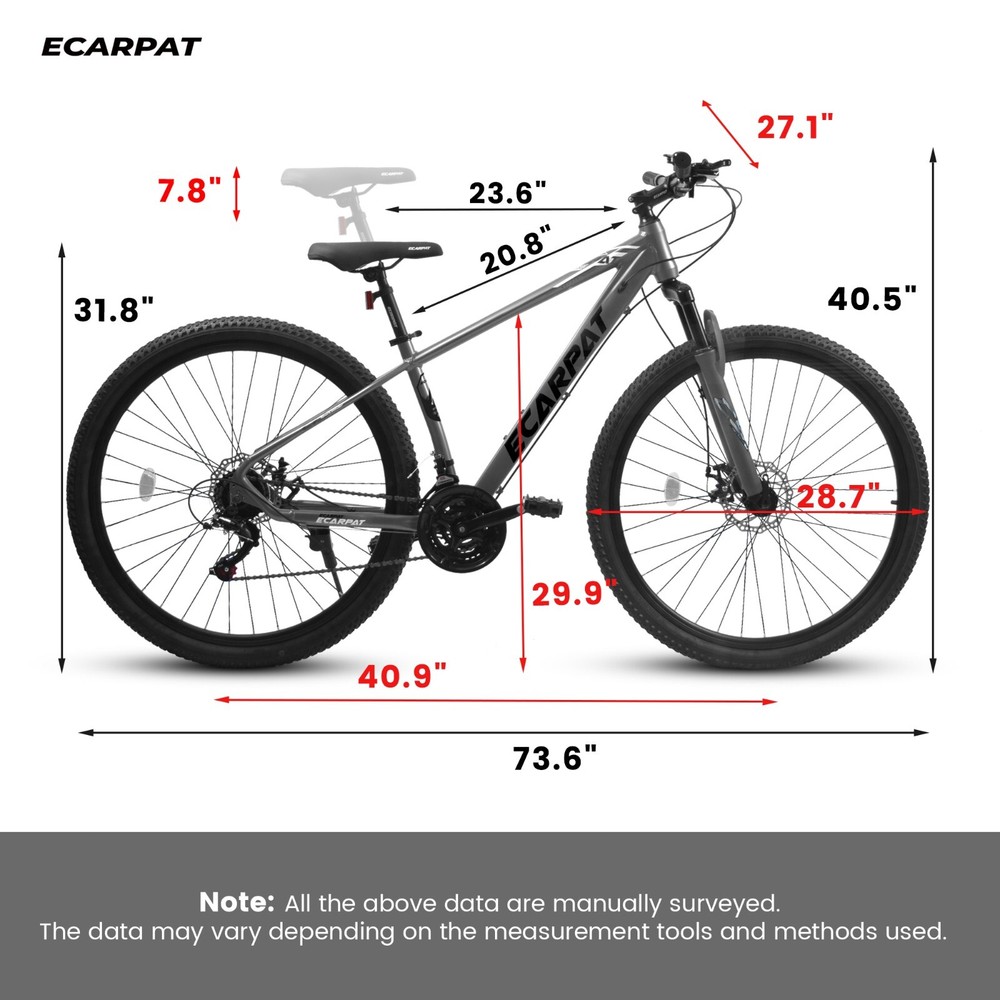 29 Inch Mountain Bike 21 Speed, Suspension Fork, Aluminum Frame Disc Brake Bike Features 【High quality aluminum Frame】ECARPAT has a high quality ultralight aluminum frame for riding and moving with ease,corrosion resistant and very easy to clean and maintain. 【Brake&Shifter】Front and rear disc brakes ensure timely and effective braking,provide you better durability and stopping power for your rugged and damp adventures.The 21-speed drivetrain with Shimano shifters and Trigger Shifter allows you to find the most comfortable and efficient gear for the kind of road. 【Suspension Fork】Equipped with a shock-absorbing fork that absorbs any bumps and inclines in the road for a smoother feeling ride. 【29*2.125" Tire】29*2.125" Rubber mountain pattern tires with high friction. Anti-skid and wear-resistant with strong grip and puncture resistance for hillsides, gravel, city streets and trails. 【Buy Guide】29 inch wheel bike Suits riders between 5'5" & 5'10".85% pre-assembled,easy to assemble, assembly tools included. Please don’t assemble the fork BACKWARDS. If you have any questions about the bike, please do not hesitate to contact us for solution.