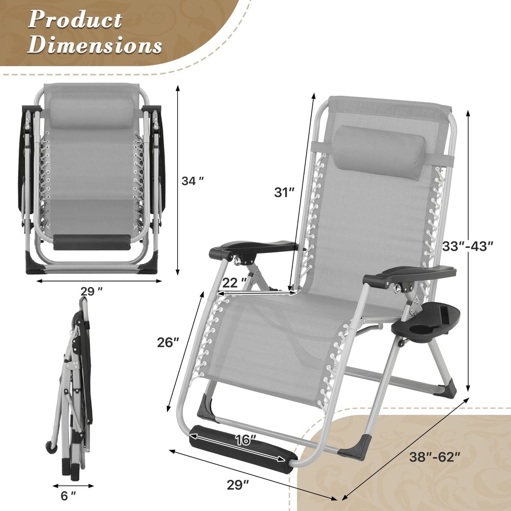 Our lounge chair features a stylish and minimalist design that complements various home decor styles, enhancing the aesthetic appeal of your living space. The adjustable headrest accommodates different heights and postures, ensuring optimal comfort. Combining practicality, comfort, and convenience, these lounge chairs are perfect for home use, outdoor activities, camping, and many other settings. High-quality Zero Gravity Chair: Constructed with an alloy steel frame and breathable textile mesh material, this folding camping chair provides enhanced stability and durability, supporting up to 330 lbs. The metal surface is coated with a rust-resistant finish to prolong its lifespan. Lounge Chair with Cushion: This patio lounge chair features a rectangular cushion that integrates both the seat and backrest, filled with high-density foam. It offers exceptional softness and support, enhancing overall comfort and making it ideal for extended use. Ergonomic Design: The camping chair features a backrest and armrests designed to align with ergonomic principles, offering superior support for your back and arms. The backrest can be adjusted from 95° to 140°, allowing for various sitting and reclining positions and increasing overall flexibility. Detachable Accessories: The outdoor beach chair includes removable headrests and foot pads, offering extra support for the head, neck, and feet to improve relaxation. Additionally, it has side trays for the easy placement of beverages, books, phones, or other small items, ensuring convenient access while you unwind. Versatile Chaise Chair: This outdoor zero-gravity chair is ideal for patios, decks, beaches, or poolside areas, and is suitable for both indoor and outdoor relaxation and leisure. High-quality Zero Gravity Chair: Constructed with an alloy steel frame and breathable textile mesh material, this folding camping chair provides enhanced stability and durability, supporting up to 330 lbs. The metal surface is coated with a rust-resistant finish to prolong its lifespan. Lounge Chair with Cushion: This patio lounge chair features a rectangular cushion that integrates both the seat and backrest, filled with high-density foam. It offers exceptional softness and support, enhancing overall comfort and making it ideal for extended use. Ergonomic Design: The camping chair features a backrest and armrests designed to align with ergonomic principles, offering superior support for your back and arms. The backrest can be adjusted from 95° to 140°, allowing for various sitting and reclining positions and increasing overall flexibility. Detachable Accessories: The outdoor beach chair includes removable headrests and foot pads, offering extra support for the head, neck, and feet to improve relaxation. Additionally, it has side trays for the easy placement of beverages, books, phones, or other small items, ensuring convenient access while you unwind. Versatile Chaise Chair: This outdoor zero-gravity chair is ideal for patios, decks, beaches, or poolside areas, and is suitable for both indoor and outdoor relaxation and leisure.