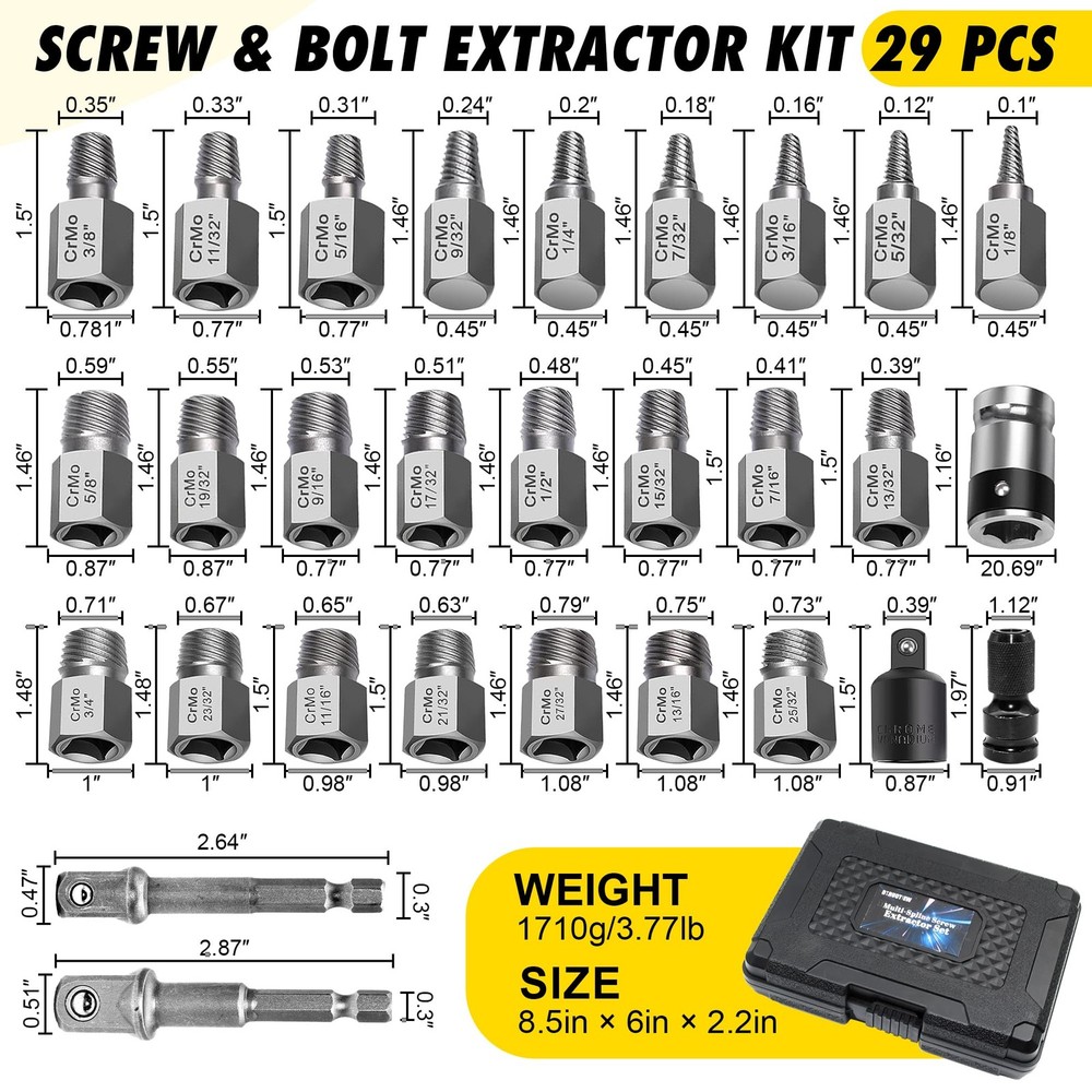 29 Piece Bolt Extractor Kit,Easy Out Stripped Screw Extractor Set For Removing Stripped, Broken Rusted Bolts Screws screw extractor set stripped screw removal tool easy out bolt extractor set stripped screw remover bolt extractor set stripped screw extractor stripped bolt extractor broken key extractor kit broken bolt extractor kit screw remover and extractor screw extractor kit easy out screw extractor set broken bolt extractor broken screw extractor set bolt extractor kit set screw extractor kit damaged screw extractor set micro screw extractor small easy out screw extractor set stripped torx bolt extractor super screw extractor set stripped allen screw removal tool a screw extractor micro screw extractor set hex screw extractor screw extractors with #0 grab it pro screw extractor kit ez out screw extractor set phillips screw extractor set extractor bit set small screw extractor set wood screw extractor set damage screw extractor kit easyout screw extractors mini screw extractor small screw extractor kit screw extractor set small tiny screw extractor skmoon screw extractor smallest screw extractor remove screw with stripped head small screw extractor grabit pro screw extractor set easy out screw extractor set small 1/16 screw extractor for tiny screws screw extractor mini screw extractor set Multi-Function Upgrade:As an upgraded version of the standard 3/8 inch drive design, the screw extractor set can be directly attached to the wrench without the need for a socket. It can also be used with manual tools, electric tools, or pneumatic tools. The easy out screw extractor set is suitable for wrenches/ratchets/drills/impact drivers CR-MO Steel: The bolt extractor kit are made from high-hardness chromium-molybdenum steel and are heat-treated, making them durable and not easily damaged Multiple Sizes and Easy to Read:This 27-piece stripped screw extractor set includes 24 different sizes of screw extractor, 1 piece of 1/2 inch drive adapter,1 piece of 1/2 inch drive adapter, and 1 piece of 3/8 inch drive adapter. Each bolt extractor is clearly marked with its size for easy identification and use Broken Bolt Extractor Kit:The internal left-handed spiral design provides ample gripping power and faster extraction speed, making it easier to remove broken or damaged screws, bolts, nuts, and studs Easy to Carry and Store:The stripped bolt extractor set is stored in a convenient case for easy access and portability. Each tool fits securely in its designated spot to prevent movement and scratching