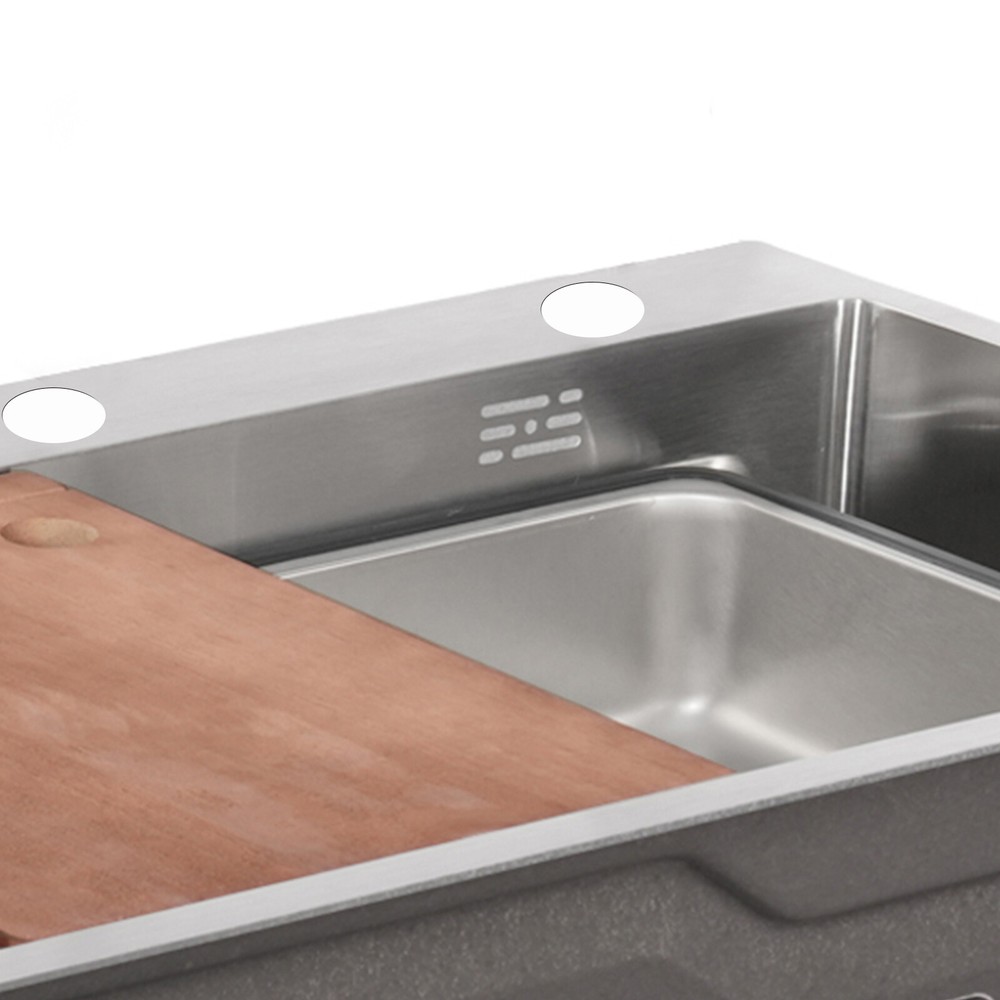 Application This product can be widely used in homes, kitchens, restaurants, cafes, bars, hotels, homestays, milk tea shops, dessert shops, and other places. Specification Color: Silver Style: Modern Shape: Rectangular Material: 304 Stainless Steel Cutting Board Material: Solid Wood Process: Nano Coating Mounting Type: Drop-In/Topmount/Undermount Assembly Required: Yes Valve Core Type: Ceramic Faucet Water Output Mode: Water Column, Spraying, Sweeping Faucet Pull-out Length: 30cm/11.81in Sink Size: 75*45*22cm/29.53*17.72*8.66in Package Size: 81*51*28cm/31.89*20.08*11.02in Gross Weight: 12kg/26.46lbs Net Weight: 11kg/24.25lbs Package Included 1 * Sink 1 * Cutting Board 1 * Drainer 1 * Basin in Basin 3 * Inlet Pipes Other Accessories for Assembly On Jul 28, 2025 at 22:49:07 PDT, seller added the following information: