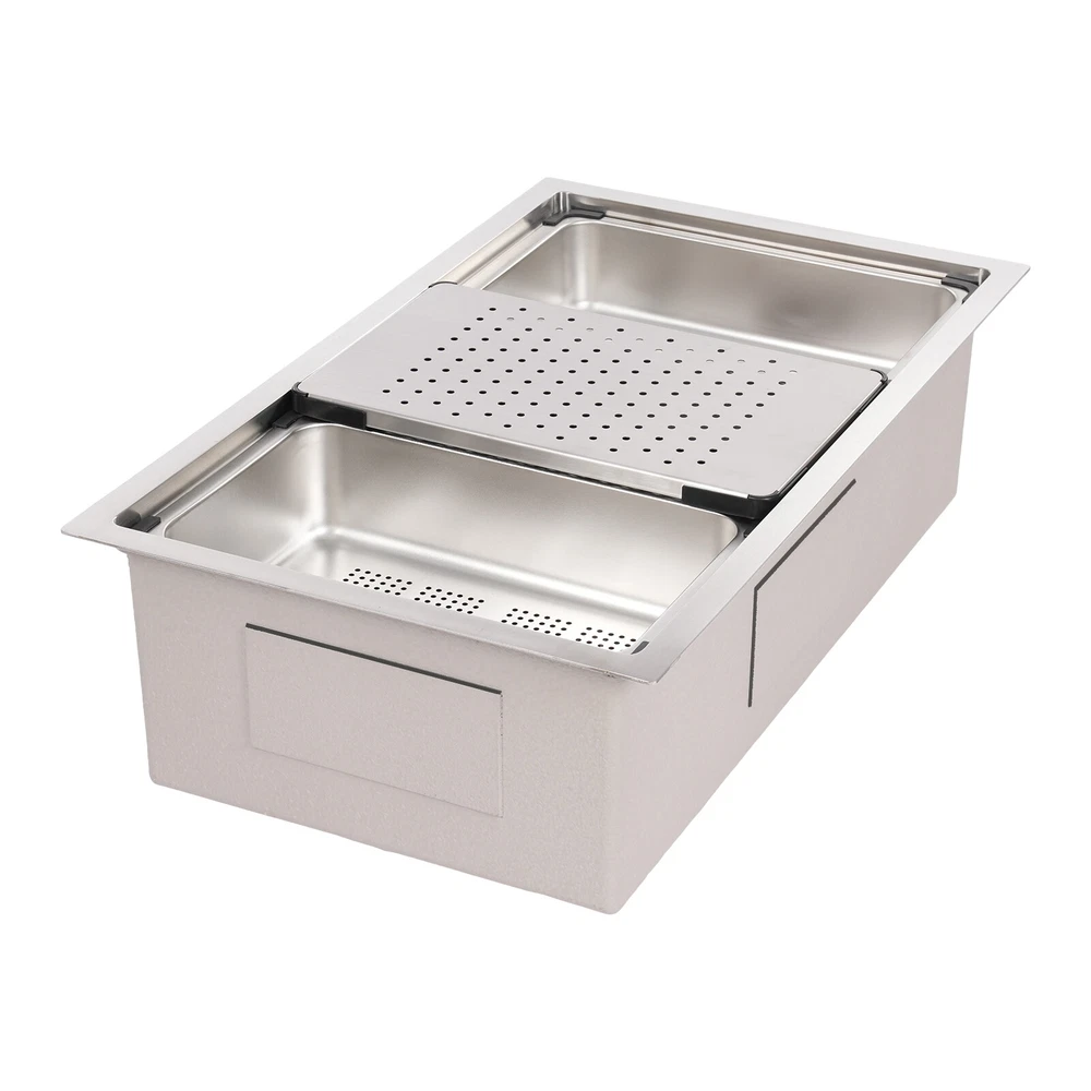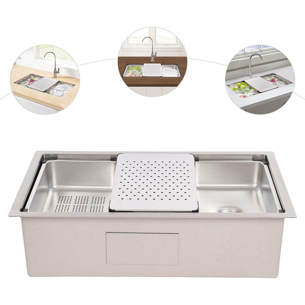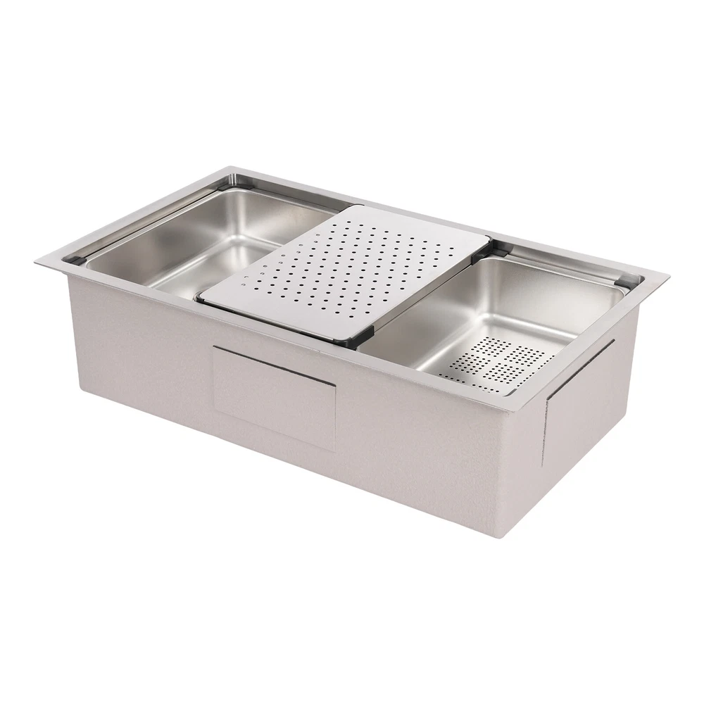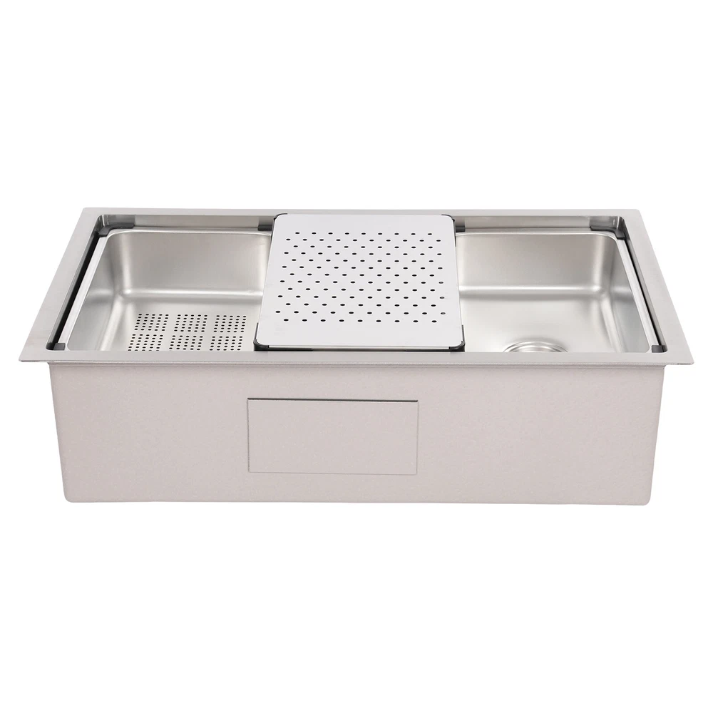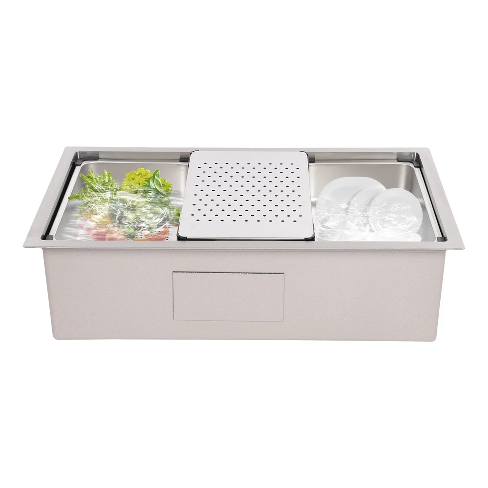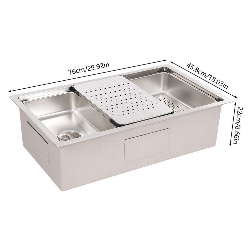 Specifications Style: Modern Material: 304 Stainless Steel, 201 Stainless Steel, Rubber, Plastic Shape: Rectangle Installation Type: Undermount, Overmount, Drop-In Color: Silver Process: Brushed Assembly Required: Yes Drain Opening: 11cm/4.33in Product Size: 76*45.8*22cm/29.92*18.03*8.66in Package Size: 79*49*29cm/31.1*19.3*11.4in Gross Weight: 12.5kg/27.6lbs Net Weight: 11.8kg/26.01lbs Package Included 1*Stainless Steel Sink 1*Draining Basket 1*Inner Basin 1*Draining Board All Accessories for Assembly 29.92*18.03*8.66 in Rectangular Kitchen Sink Stainless Steel Drop-In Sink Details X-Deflector Line: It can effectively drain water and avoid water accumulation inside the sink. Plastic Wrapped Corners : They not only make it possible to place draining baskets, inner basin , and draining boards more snugly but also prevent scratches to the sink. Practical Sealing Ring : It makes the connection tighter, effectively reducing water leakage and saving you costs. Raised Edges : The raised edges can efficiently prevent overflowing, and keep your kitchen dry and clean. Strainer Center Knob : It helps lift the strainer basket quite easily for fast draining. Application It is ideal for hand washing and cleaning food, fruits and vegetables. It can be used in commercial restaurants, dessert shops, clean rooms, utility rooms, cafeterias, garages, laundry rooms, basements, patio bars, kitchens, food trucks, and more. Specifications Style: Modern Material: 304 Stainless Steel, 201 Stainless Steel, Rubber, Plastic Shape: Rectangle Installation Type: Undermount, Overmount, Drop-In Color: Silver Process: Brushed Assembly Required: Yes Drain Opening: 11cm/4.33in Product Size: 76*45.8*22cm/29.92*18.03*8.66in Package Size: 79*49*29cm/31.1*19.3*11.4in Gross Weight: 12.5kg/27.6lbs Net Weight: 11.8kg/26.01lbs Package Included 1*Stainless Steel Sink 1*Draining Basket 1*Inner Basin 1*Draining Board All Accessories for Assembly Payment Delivery details Terms of sales About us Contact us Payment We accept ebay payment 。 Fees such as import duties, taxes are not included in the item price or shipping costs. These charges are the buyer's responsibility. Delivery details Shipping: 2-9 working days to: USA Terms of sales We maintain high standards of excellence and strive for hundred percent customer satisfaction. Feedback is very important to us. We hope that you contact us immediately before you give neutral or negative feedback, so that we can address your concerns. It is impossible to address issues if we do not know about them! About us Your satis faction is our ultimate goal. We work hard to earn your trust and future business. Our certified technicians have tested each item before shipping. The unit comes with 1 year limited warranty on all manufacturing defects. a) If you receive a defective item, you may return it or ask for a discount. Please contact us within 14 days after you receive the package. b) What you returned must be intact and in its original packaging as re? u. Customer is responsible for shipping costs of the returned item. c) We will cover the cost of shipping back t with the shipping rate indicated in the registration page. We will send you a new unit or refund the full payment you paid. Thank you. Contact us Business Hour Business Hour: Monday To Friday: 8:30 AM to 5:00 PM (Beijing China time) Due to time zones, our reply to your questions may not be immediately. But within above working time, we will reply your email within 24 hours. If it's non-workdays, please kindly be patient and wait till Monday. Please contact us with ebay message. Please feel free to contact us if you have any questions. Monday To Friday: 8:30 AM to 5:00 PM (Beijing China time) Due to time zones, our reply to your questions may not be immediately. But within above working time, we will reply your email within 24 hours. If it's non-workdays, please kindly be patient and wait till Monday. Please contact us with ebay message. Please feel free to contact us if you have any questions.