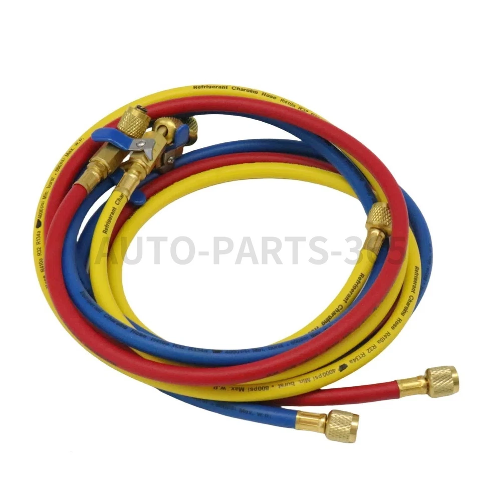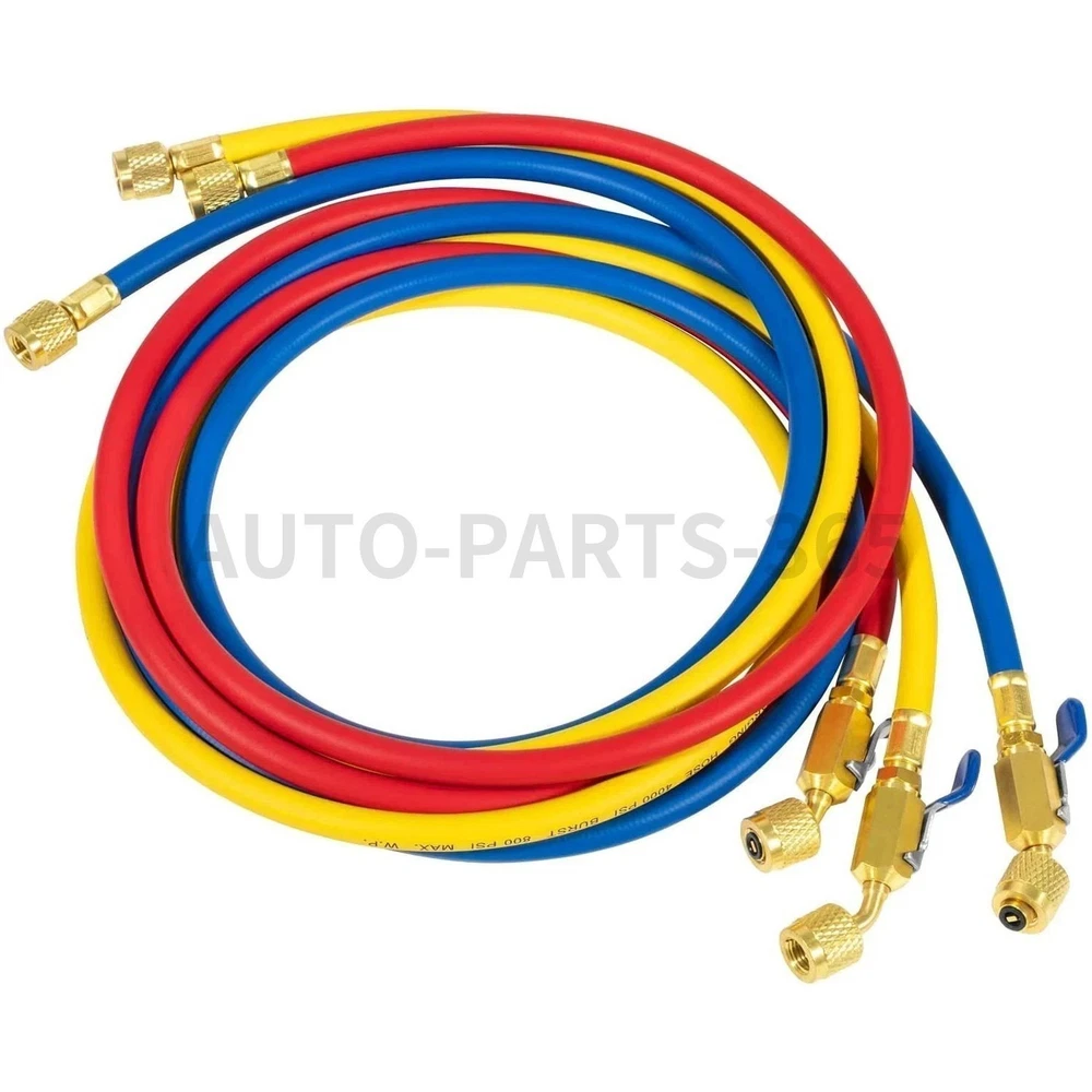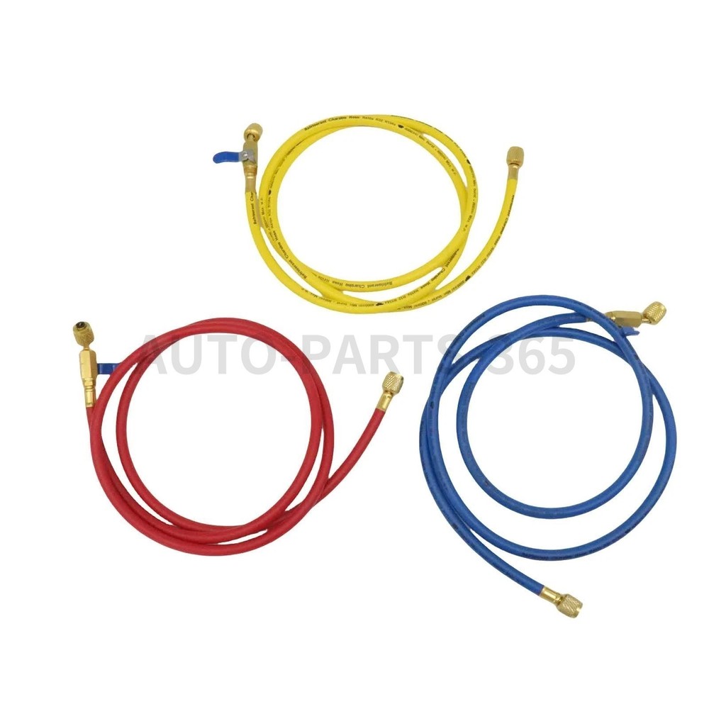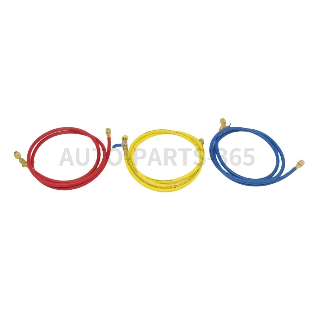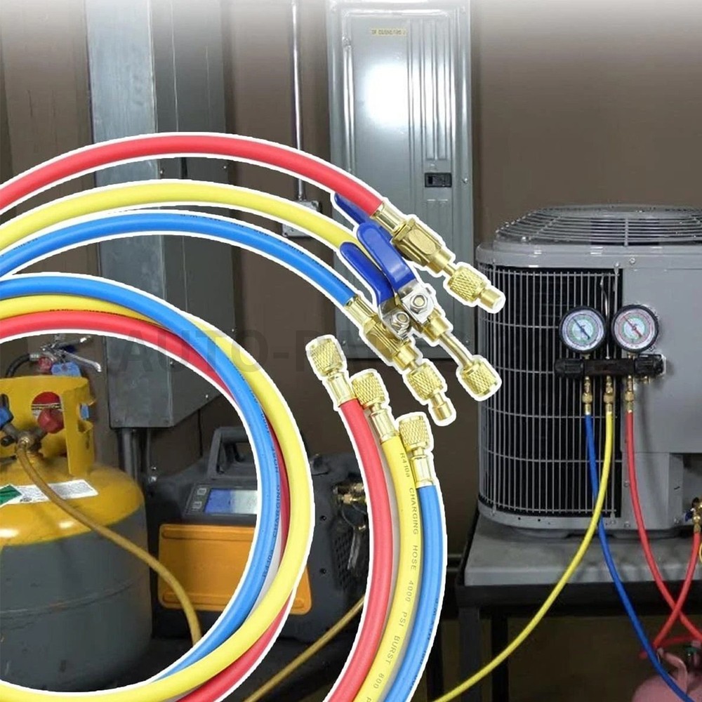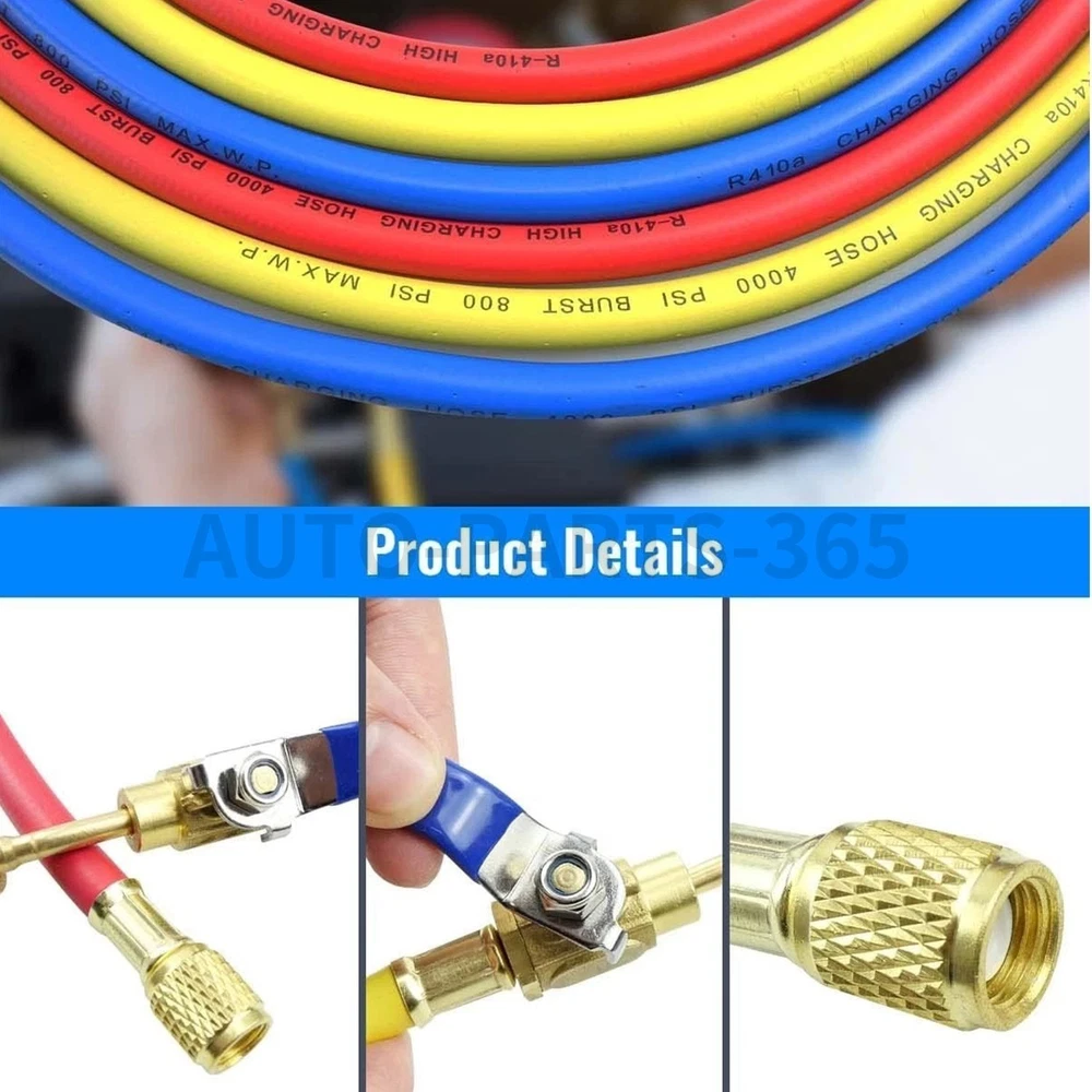 Product Details Material: Brass, Rubber Color: red blue yellow Item Weight: 2.3 Pounds Maximum Pressure: 4000 Pound per Square Inch Item Length: 72 Inches Specific Uses For Product: HVAC and A/C maintenance, Refrigerant charging Batteries Included?: No Batteries Required?: No Adaptation: 29986 hose recommended for R-410A, necessary tool for HVAC, car air conditioning (A/C) maintenance and adding coolant Professional Design: Compact, lightweight design is easy to install and use. Ball valve design with quarter turn valve handle switch for refrigerant control. it can be operated with one hand Product Details Material: Brass, Rubber Color: red blue yellow Item Weight: 2.3 Pounds Maximum Pressure: 4000 Pound per Square Inch Item Length: 72 Inches Specific Uses For Product: HVAC and A/C maintenance, Refrigerant charging Batteries Included?: No Batteries Required?: No Adaptation: 29986 hose recommended for R-410A, necessary tool for HVAC, car air conditioning (A/C) maintenance and adding coolant Professional Design: Compact, lightweight design is easy to install and use. Ball valve design with quarter turn valve handle switch for refrigerant control. it can be operated with one hand Function: Full flow valves using standard gaskets and valve openers. Metal handle on the end of the hose is suitable for sealing the area and traps all gas High-quality Material: Made of brass and high-quality rubber, with strong airtightness and high safety. High-quality HVAC instrument hose for durability and reliability; Diaphragm valve with rotary ball valve seal for more reliable sealing and reduced wear Specifications: Replaces part number: 29986, 72" long 1/4" hose, blue hose*1, red hose*1, yellow hose*1, three total, hose with compact ball valve end. Minimum burst pressure is 4000 psi (276 bar) and maximum working pressure is 800 psi (55 bar). Operating temperature is -20F to 180F (-28.8°C to 82.2°C). Minimum Bend Radius: 6" (152mm) Notice: A. Manual measurement, please allow slight errors in size. B. Due to different screen display, the color may be slightly different Buyers must read: please confirm whether the part number or photo of the product matches your original before purchasing