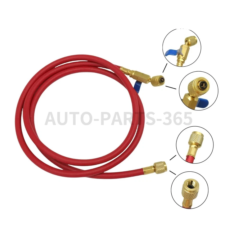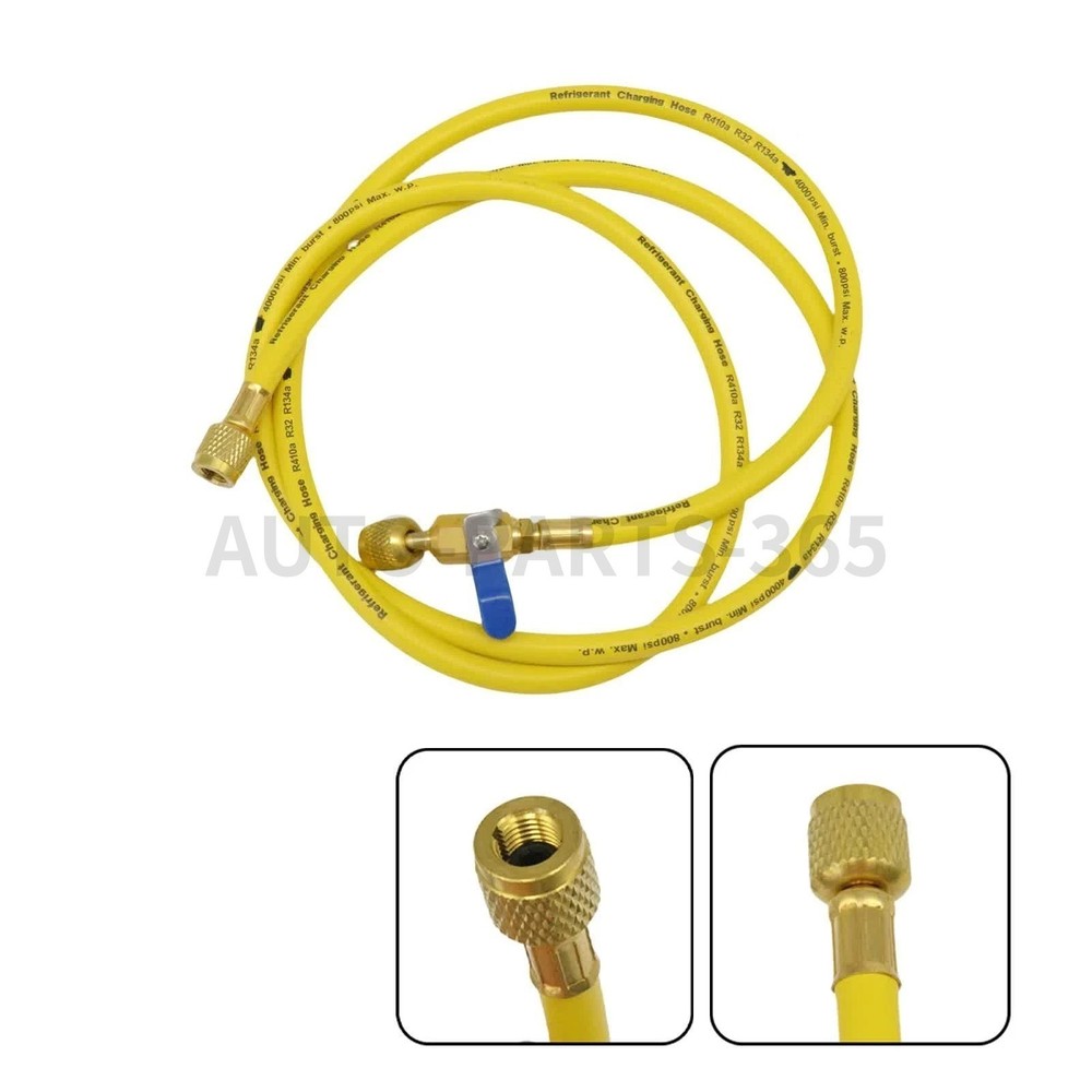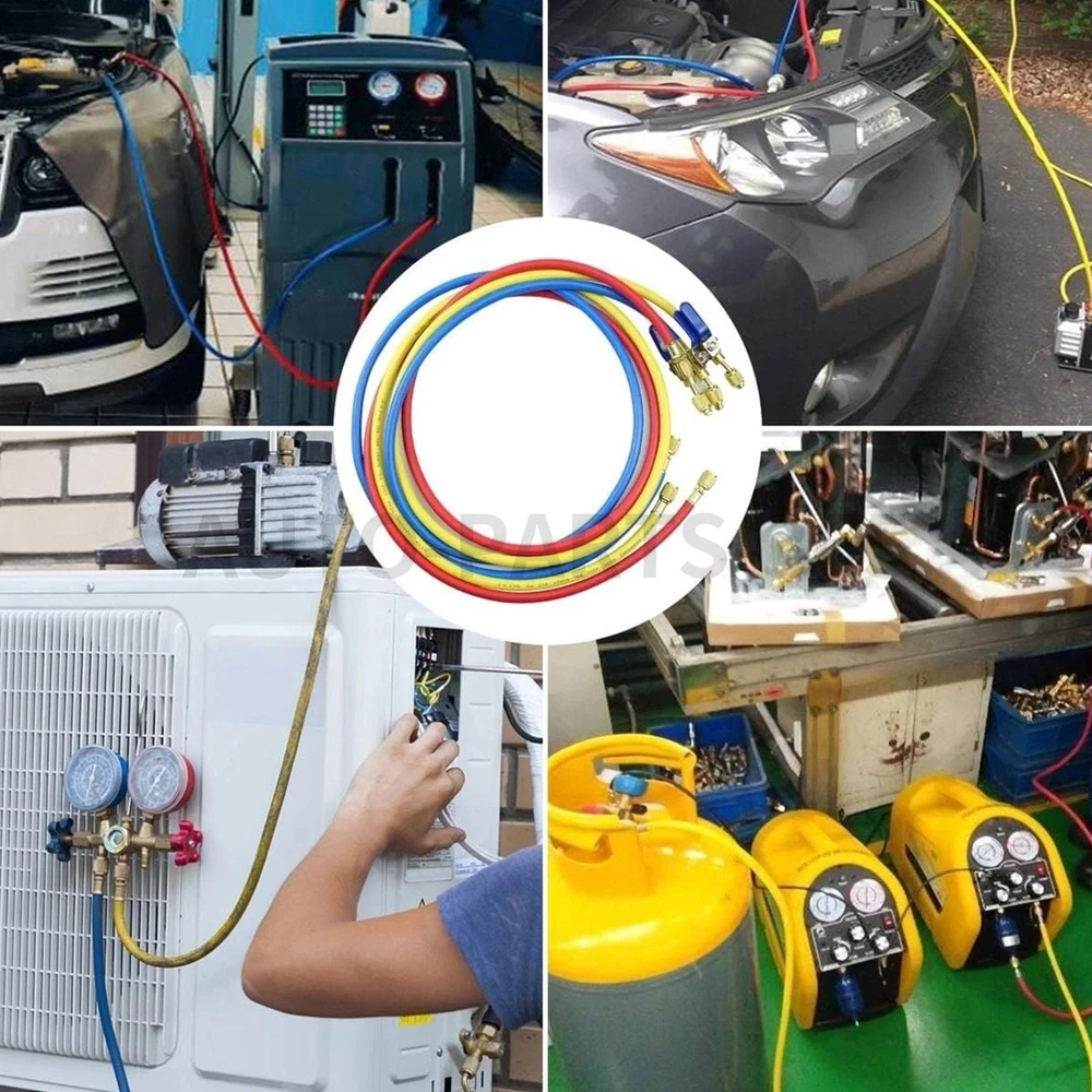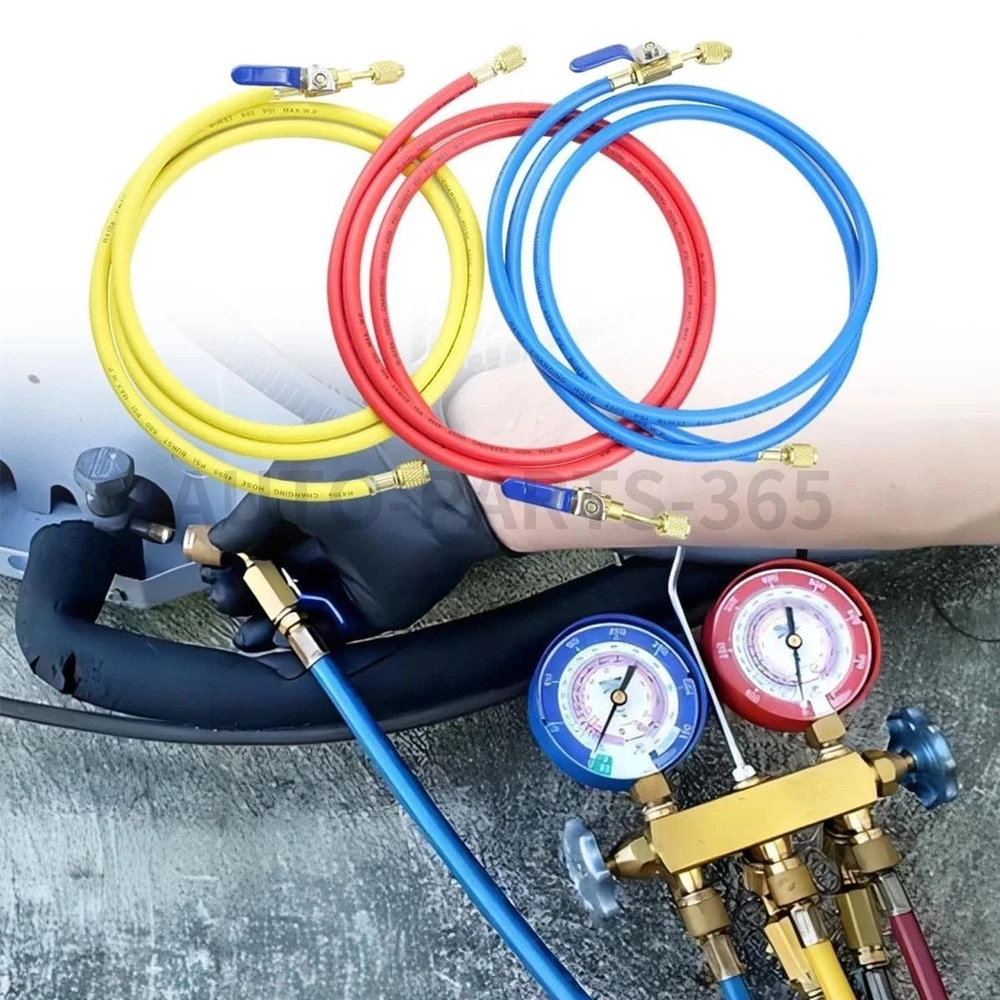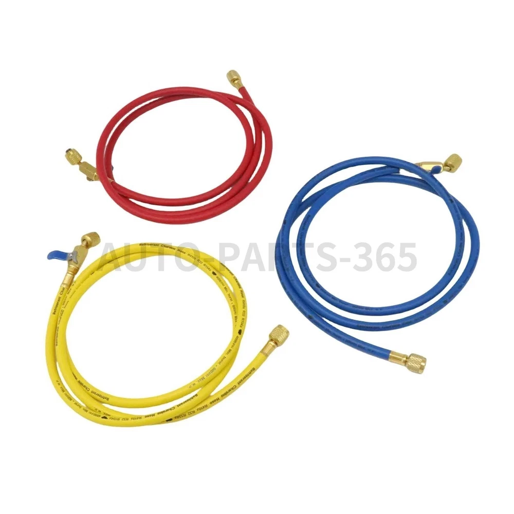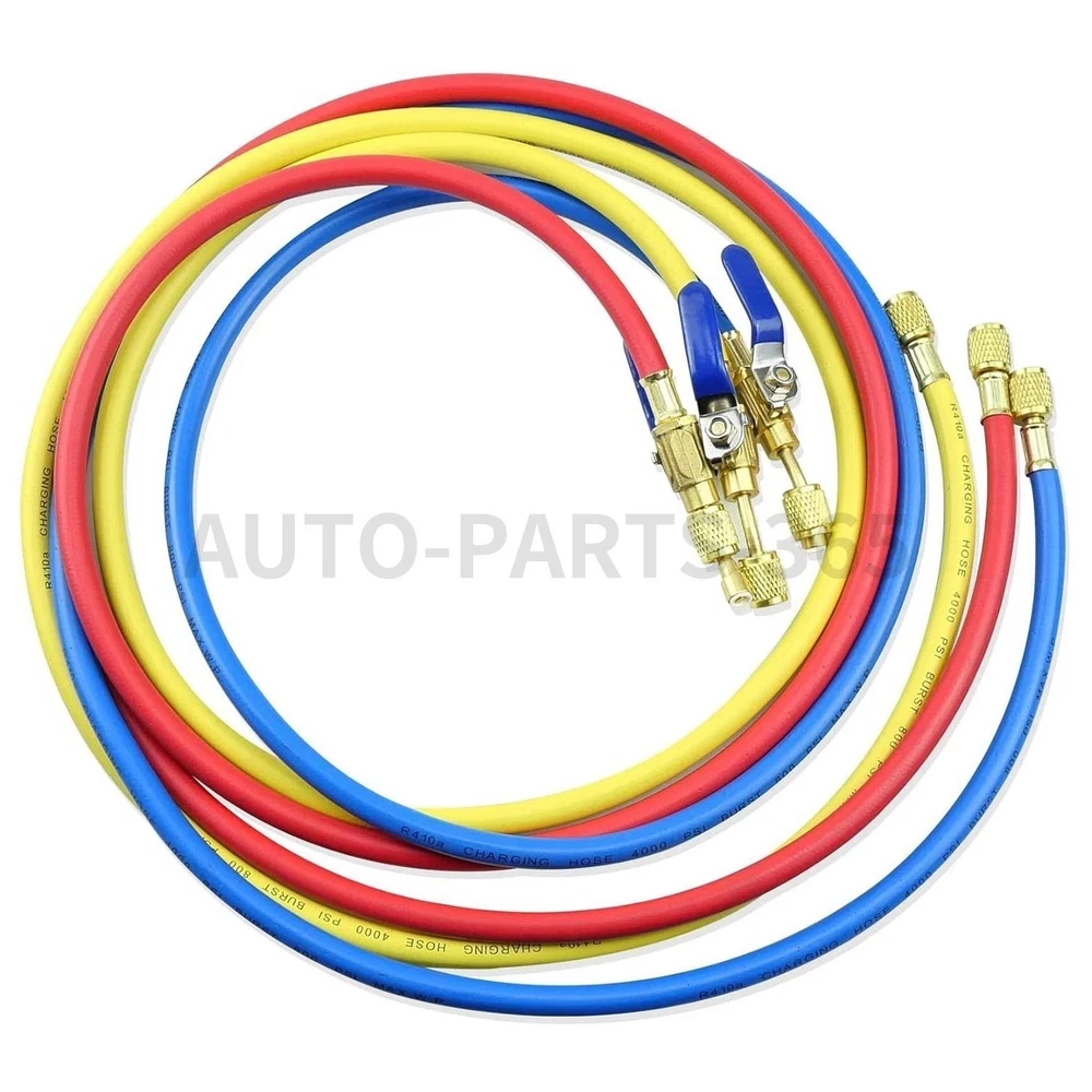 Product Details Material: Brass, Rubber Color: red blue yellow Item Weight: 2.3 Pounds Maximum Pressure: 4000 Pound per Square Inch Item Length: 72 Inches Specific Uses For Product: HVAC and A/C maintenance, Refrigerant charging Batteries Included?: No Batteries Required?: No Adaptation: 29986 hose recommended for R-410A, necessary tool for HVAC, car air conditioning (A/C) maintenance and adding coolant Professional Design: Compact, lightweight design is easy to install and use. Ball valve design with quarter turn valve handle switch for refrigerant control. it can be operated with one hand Product Details Material: Brass, Rubber Color: red blue yellow Item Weight: 2.3 Pounds Maximum Pressure: 4000 Pound per Square Inch Item Length: 72 Inches Specific Uses For Product: HVAC and A/C maintenance, Refrigerant charging Batteries Included?: No Batteries Required?: No Adaptation: 29986 hose recommended for R-410A, necessary tool for HVAC, car air conditioning (A/C) maintenance and adding coolant Professional Design: Compact, lightweight design is easy to install and use. Ball valve design with quarter turn valve handle switch for refrigerant control. it can be operated with one hand Function: Full flow valves using standard gaskets and valve openers. Metal handle on the end of the hose is suitable for sealing the area and traps all gas High-quality Material: Made of brass and high-quality rubber, with strong airtightness and high safety. High-quality HVAC instrument hose for durability and reliability; Diaphragm valve with rotary ball valve seal for more reliable sealing and reduced wear Specifications: Replaces part number: 29986, 72" long 1/4" hose, blue hose*1, red hose*1, yellow hose*1, three total, hose with compact ball valve end. Minimum burst pressure is 4000 psi (276 bar) and maximum working pressure is 800 psi (55 bar). Operating temperature is -20F to 180F (-28.8°C to 82.2°C). Minimum Bend Radius: 6" (152mm) Notice: A. Manual measurement, please allow slight errors in size. B. Due to different screen display, the color may be slightly different Buyers must read: please confirm whether the part number or photo of the product matches your original before purchasing