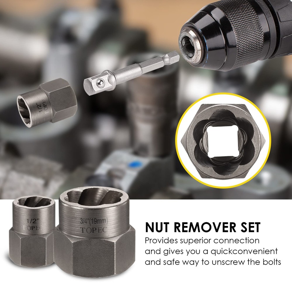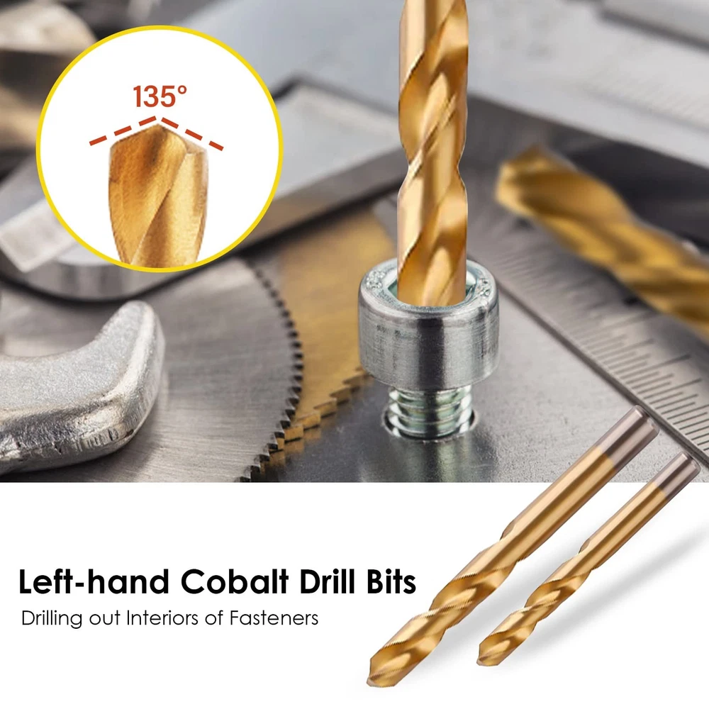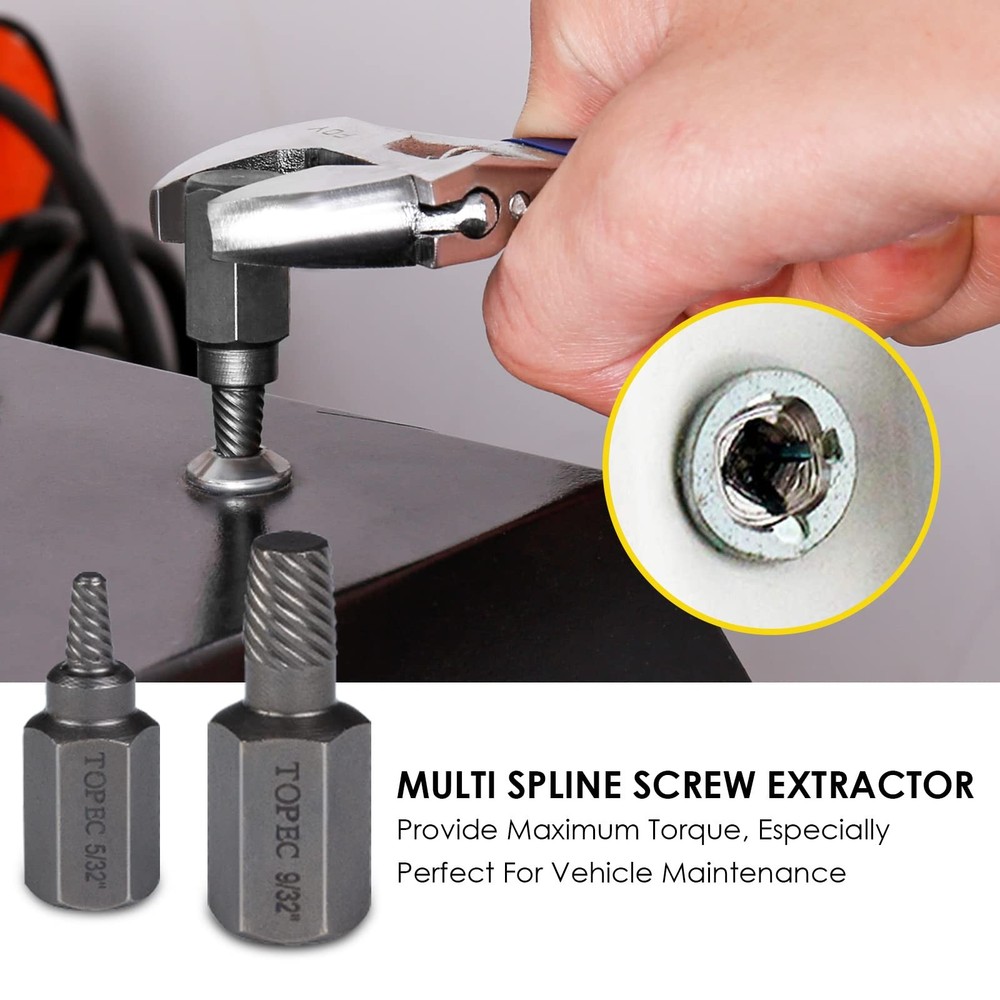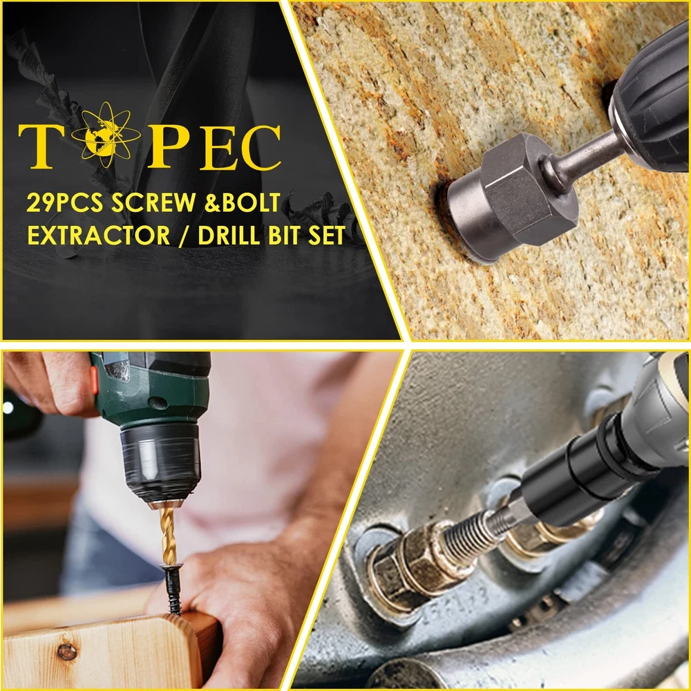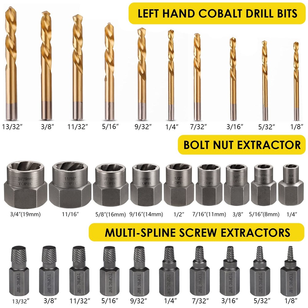 Spiral Flute Screw Extractor Set for Removing Rusted and Stripped Screws, Bolts and Other Fasteners 【29-PIECE MULTIFUNCTIONAL EXTRACTORS SET】: This is a set of 3-in-1 screw & nut remover kit and drill bit kit. It contains 9pcs nut removers, 10pcs left hand HSS drill bits, 10pcs multi-spline screw extractors. Multiple specifications and sizes to meet your various work needs. 【EXACT SIZE】: Screw remover kit parts have clear specifications printed on them, 9pcs nut removers size: 3/4” (19mm), 11/16”, 5/8”(16mm), 9/16”(14mm), 1/2”, 7/16”(11mm), 3/8”, 5/16”(8mm), 1/4”. 10pcs drill bit size: 13/32", 3/8", 11/32", 5/16", 9/32", 1/4", 7/32", 3/16", 5/32", 1/8". 10pcs multi-spline screw extractors size: 13/32", 3/8", 11/32", 5/16", 9/32", 1/4", 7/32", 3/16", 5/32", 1/8". 【HIGH QUALITY】: The nut remover/multi-spline screw extractor are made of high hardness chrome-molybdenum steel. Reverse spiral groove design bending down to provide maximum grip force to easily remove damaged bolts, nuts, broken screws. The left hand drill is made of HHS and the head is designed with a 135° angle. which is not easily worn and has strong penetration. Surface titanium nitride coating, effective anti-corrosion and rust prevention, extending service life. 【WIDELY USED】All premium industrial grade bolt extractors are strictly designed. The grip is firm, not easy to fall off, and provides more torque. Easily remove damaged bolts, nuts and screws even if they are peeled, rusted or frozen. Suitable for power drills, flat or allen wrenches, tap adapters. 【PREMIUM SERVICE】 - If you have any problems with our products. our professional after-sales service team through , the after-sales team will you and solve your problem in time.