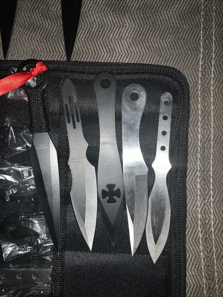 throwing knife kit, includes 5 different knife styles. 29 knifes total. two carriers. most knifes in the kit are still in their plastic from the factory. few are not for the sake of pictures.
