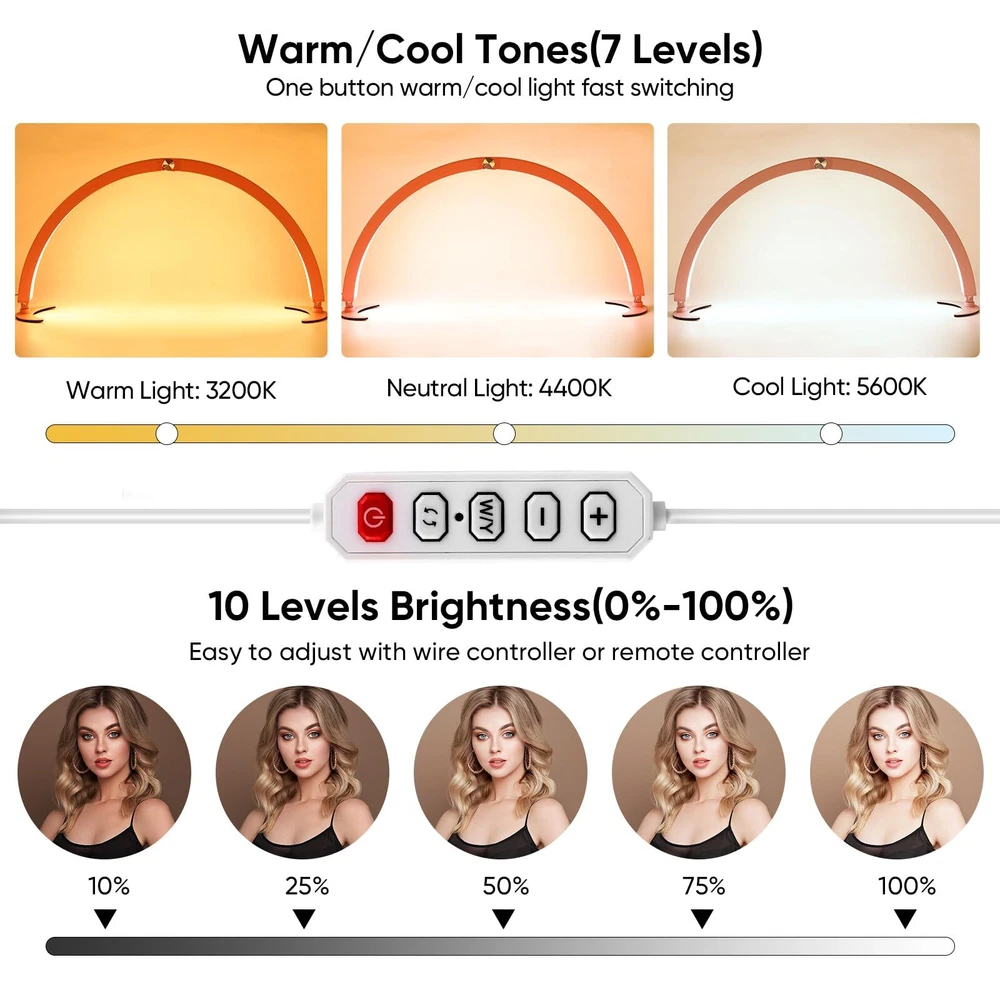Half-moon Lamp :Our nail table lamp uses half-moon design,which can achieve focused lighting, no shadows, no eye damage, and use at ease. Our nail table lamp designs 320 LED lamp beads, which can provide bright light up to 2000 lumens to see even small details of their work more clearly and detect any imperfections. Adjustable Brightness and Tones: Our half moon light has 2 color temperatures including warm light,cool light.The tone can be adjusted from3200K to 5600K (7 levels).You can adjust the brightness from 0% to 100%(10 levels) according to your need. Wide Application:Our half moon lamp is not only suitable for nail art, facial spa, skin care, lash extensions, tattoo,but also is suitbale for reading, threading and hand crafting lighting.Our half moon lamp can be used at home for reading or working. Easy to Assemble:Our manicurist desk lamp is easy to install.Just install the base on both sides of the lash lamp without any extra tools.Our manicurist desk lampbe placed on desktop or beauty bed, stable and not toppling. Package Includes:You will get 1 half moon lamp.Please contact us if you have any problems about the half moon lamp.We will reply you in time.