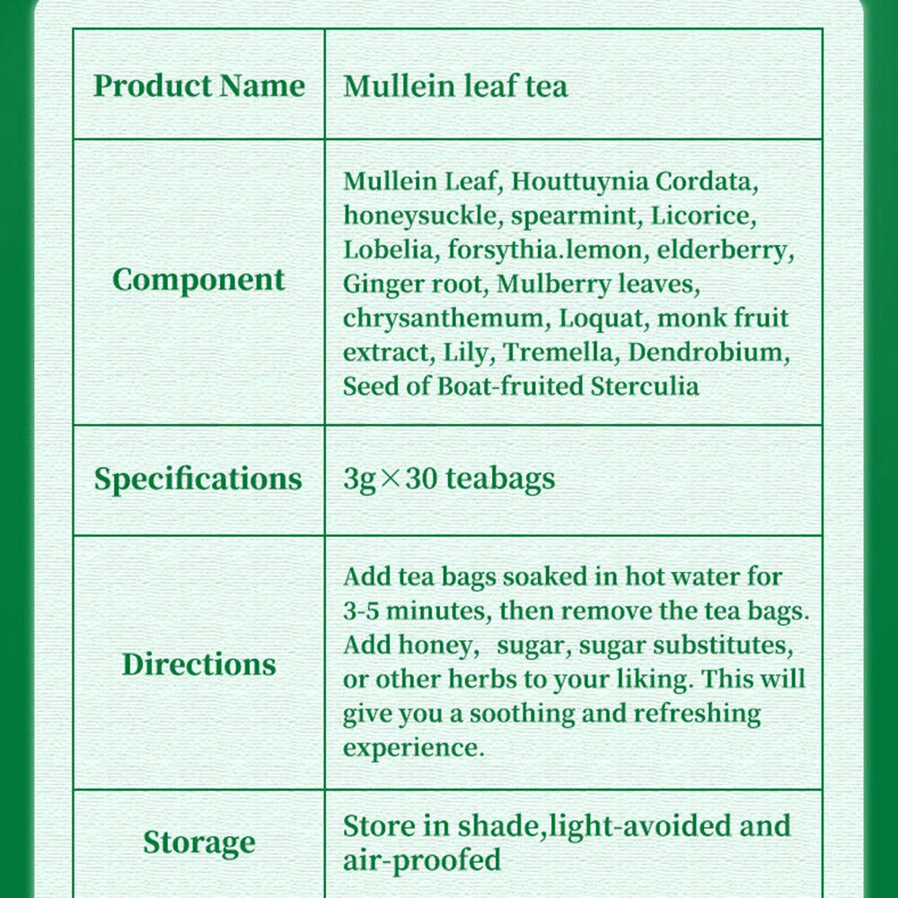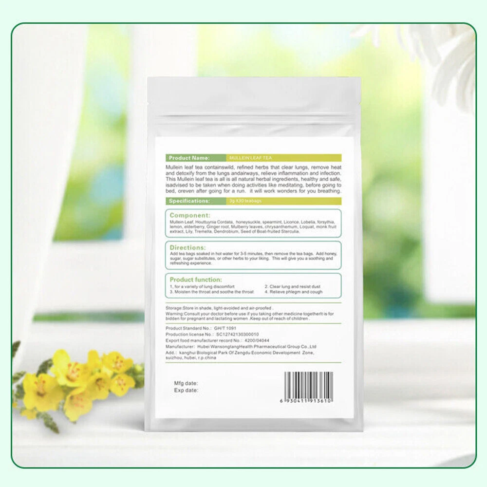Product Description Specification: Condition: 100% Brand New And High Quality Item Type: Mullein Leaf Tea Quantity: 30 Day Tea Bags Shelf Life: 2 Years Main effects: clearing away heat and detoxification, curing cough, anti-virus,ect. Direction: Soak for 3-5 minutes. You can add flavorings such as lemon, honey or fructose syrup according to your preference. This will bring you a delicious and refreshing experience. Features: Natural ingredients - natural Mullein leaves, decaffeinated, gluten free, no artificial flavor. You can enjoy a pleasant herbal Mullein tea at any time of the day. Health support - our pistil tea is full of aroma and has many health benefits. It promotes digestion, antioxidation, reduces mucus and helps the throat. Purify the lungs - this pleasant pistil tea is rich in vitamins and minerals, which can clean the lungs, promote respiratory health and relax the body. Strengthen your defense - Mullein flower leaves are naturally rich in antioxidants, which help strengthen the body's immune system. It may help protect you from foreign invaders and keep you healthy. Free breathing - Mullein flowers and leaves are well-known tea. We develop its characteristics in dietary products. It can relieve breathing and help the body enter the respiratory tract. Package Include: 2 * Mullein Leaf Tea Bags(30pack) Notes: These statements have not been evaluated by the Food and Drug Administration. This product is not intended to diagnose, treat, cure or prevent any disease. Payment Shipping Returns Contact Us All Modes of Payment are acceptable,such as Apple pay, Google pay, PayPal, credit card, etc. We will deliver the items to you within the processing time. Please provide us your correct receiving address (include house number, Street name) , so that we can ship the order to you as soon as possible! If you need us to ship the items by other way, please feel free to contact us. Thanks! Please check your shipping address carefully before checkout, it can't be changed if order completed. If you are not satisfied with your purchasing, you can return the product and get a full refund. But we will not responsible for the shipping and people damaged. You can return a product for up to 30 days from the date you’ve purchased it. Please contact us to confirm the return address before you return the items. Incorrect/Faulty/Damaged Items: Please contact us to arrange for the return via eBay messaging or one of the numbers above. NO postage will be refunded unless agreed upon in email or writing prior to returning. Monday to Friday 9:00 am to 6:00 pm. We do not work holidays . If you send email to us,In our working hours will be resumed within 24 hours. If you we are not satisfied with the product or service ,please contact me and don't give us negative or natural feedback,We must give you a satisfactory solution. Payment All Modes of Payment are acceptable,such as Apple pay, Google pay, PayPal, credit card, etc. Shipping We will deliver the items to you within the processing time. Please provide us your correct receiving address (include house number, Street name) , so that we can ship the order to you as soon as possible! If you need us to ship the items by other way, please feel free to contact us. Thanks! Please check your shipping address carefully before checkout, it can't be changed if order completed. Returns If you are not satisfied with your purchasing, you can return the product and get a full refund. But we will not responsible for the shipping and people damaged. You can return a product for up to 30 days from the date you’ve purchased it. Please contact us to confirm the return address before you return the items. Incorrect/Faulty/Damaged Items: Please contact us to arrange for the return via eBay messaging or one of the numbers above. NO postage will be refunded unless agreed upon in email or writing prior to returning. Contact Us Monday to Friday 9:00 am to 6:00 pm. We do not work holidays . If you send email to us,In our working hours will be resumed within 24 hours. If you we are not satisfied with the product or service ,please contact me and don't give us negative or natural feedback,We must give you a satisfactory solution. powered by