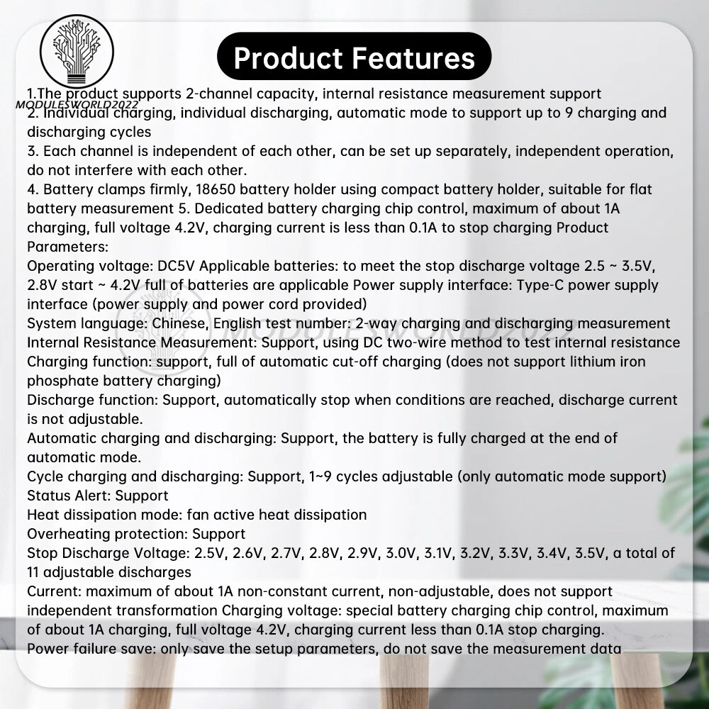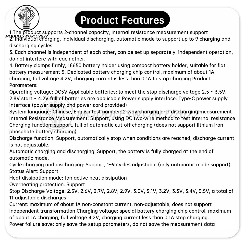 Store Categories Store Categories Other Product View Details Features The product supports 2-channel capacity and internal resistance measurement Support separate charging and discharging, and support up to 9 charging and discharging cycles in automatic mode. Each channel is independent of each other, can be set up separately, independent operation, no interference with each other. Firm battery clamp, 18650 battery holder using a compact battery holder, suitable for flat battery measurement Dedicated battery charging chip control, maximum of about 1A charging, full voltage 4.2V, charging current less than 0.1A stop charging Specification Working voltage: DC5V Applicable batteries: meet the stop discharge voltage 2.5 ~ 3.5V, 2.8V start ~ 4.2V full of batteries are applicable Power supply interface: Type-C power supply interface (power supply and power cord provided) System language: Chinese, English Test quantity: 2-way charging and discharging measurement Internal Resistance Measurement: Support, using DC two-wire method to test internal resistance. Charging function: support, full of automatic cut-off charging (does not support lithium iron phosphate battery charging) Discharge function: Support, automatically stop when conditions are reached, discharge current is not adjustable. Automatic charging and discharging: Support, the battery is fully charged at the end of automatic mode. Cyclic charging and discharging: Support, 1~9 cycles adjustable (only automatic mode support) Status Alert: Support Heat dissipation mode: fan active heat dissipation Overheating protection: Support Stop Discharge Voltage: 2.5V, 2.6V, 2.7V, 2.8V, 2.9V, 3.0V, 3.1V, 3.2V, 3.3V, 3.4V, 3.5V, adjustable in 11 steps. Discharge current: maximum of about 1A non-constant current, non-adjustable, does not support independent transformation Charging voltage: special battery charging chip control, maximum about 1A charging, full voltage 4.2V, charging current less than 0.1A stop charging. Power failure save: only save the setup parameters, do not save the measurement data Product size: 190×50×27mm Instructions for use: 1. Product switch on and off: The product has no switch key, power on automatically turn on, power off shutdown 2. Language switching: Live in the “menu / M” key and then power on, the screen displays the main interface, release the “menu / M” key, wait 10 seconds to restart after the shutdown can be 3. Switch channel display: Each channel is independent of each other, do not interfere with each other, click the “channel / CHN” button to switch the display channel, and can view the parameters of each channel, and set the parameters of each channel 4.Test internal resistance: Install the battery, power on, wait for 10 seconds, display the battery voltage and internal resistance test results, this product uses DC two-wire method to test internal resistance, subject to the limitations of the test principle, may not be able to identify the battery, the internal resistance is always displayed in the case of 9999. When the battery is not installed, the test circuit is disconnected, which is equivalent to infinite resistance value, and the internal resistance shows 9999 milliohms. 5. Charging function (not suitable for lithium iron phosphate battery charging): Install the battery in the battery holder, adjust the mode to “charging” mode, click “start/stop/R/S” to run the program; after the charging is finished, the status indication is complete; the charging process records the capacity, energy, charging time, charging metering capacity is for reference only, please take the discharging capacity as the standard 6. Test capacity: Capacity test needs to be discharged, need to wait for time, capacity test is carried out through the resistance discharge, discharge resistance heat generated high temperature, do not touch directly with your hands to avoid burns outside. Capacity test results are only the capacity measured during the test phase when the battery starts discharging and stops triggering. 7. Battery capacity dividing and running cycle: Separate the capacity to run the cycle is a process of charging, discharging and recharging, the use of the stop voltage can not be lower than 2.8V, otherwise it can not be charged, the program can not run properly 8.Data zeroing: Shutdown, switch mode, capacity, energy, time data is automatically cleared to zero List 1 x 18650 Battery Capacity Resistance Tester Shipping Policy Payment Method Returns Policy Shipping Policy Payment Method Returns Policy Home Payment Shipping About us Contact us Copyright©2018 datacaciques Home Payment Shipping About us Contact us Store Categories Store Categories Other Product View Details Features The product supports 2-channel capacity and internal resistance measurement Support separate charging and discharging, and support up to 9 charging and discharging cycles in automatic mode. Each channel is independent of each other, can be set up separately, independent operation, no interference with each other. Firm battery clamp, 18650 battery holder using a compact battery holder, suitable for flat battery measurement Dedicated battery charging chip control, maximum of about 1A charging, full voltage 4.2V, charging current less than 0.1A stop charging Specification Working voltage: DC5V Applicable batteries: meet the stop discharge voltage 2.5 ~ 3.5V, 2.8V start ~ 4.2V full of batteries are applicable Power supply interface: Type-C power supply interface (power supply and power cord provided) System language: Chinese, English Test quantity: 2-way charging and discharging measurement Internal Resistance Measurement: Support, using DC two-wire method to test internal resistance. Charging function: support, full of automatic cut-off charging (does not support lithium iron phosphate battery charging) Discharge function: Support, automatically stop when conditions are reached, discharge current is not adjustable. Automatic char