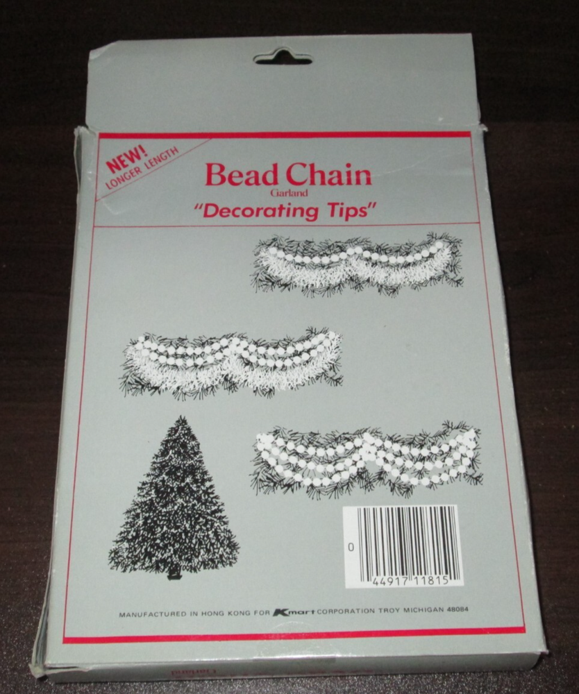 These two vintage Christmas garland from Kmart features a 15-foot long chain of silver decorative beads, perfect for adding a touch of festive elegance to your holiday decor. Made of plastic, this garland is suitable for use on a Christmas tree or as a stylish trim for a festive wreath or plant display. The silver color adds a classic touch to your seasonal decorations, making it a timeless addition to your home during the holiday season.