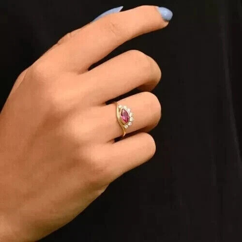 This product is a 2CT Marquise Lab Created Red Ruby Women Wedding Band Ring in 14K Yellow Gold Plated. It is a beautifully crafted ring with a floral pattern and engraved details, perfect for special occasions like anniversaries or birthdays. The ring features a marquise-shaped ruby as the main stone, complemented by sparkling diamonds on the sides. The yellow gold plating and sterling silver base add a touch of elegance to the design. This ring is a unique and stunning piece that can be personalized to suit your preferences. Made in the United States, it is a high-quality and eye-catching accessory for any woman's jewelry collection.