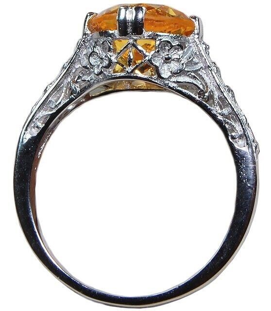 Shipped in timely manner. Packaging was very through. Arrived undamaged. As described, but more lovely than photo. Value - well worth the price. Appearance is realistic! More of elegant engagement or cocktail ring. Main stone shine like delicate orange diamond surrounded by white diamonds. Can be worn daily or special occasion. 0ld-english-silver, excellent merchandise & prices too. Business is professional, trustworthy.