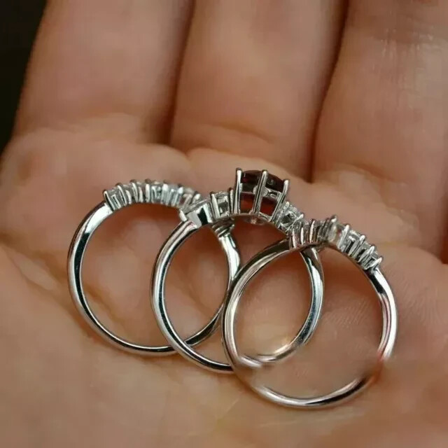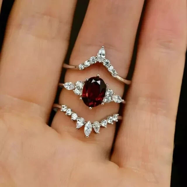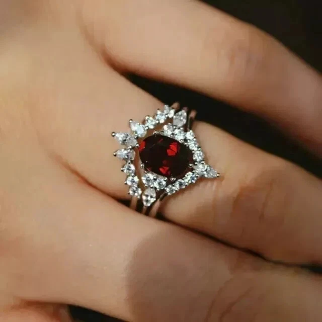 2Ct Oval Red Garnet Trio Wedding Ring Set in 14K White Gold Plated