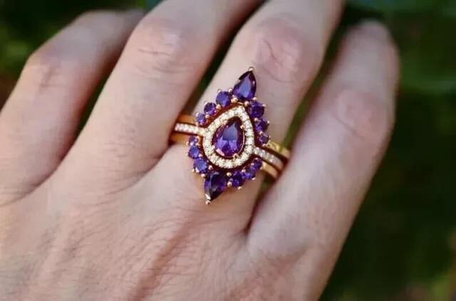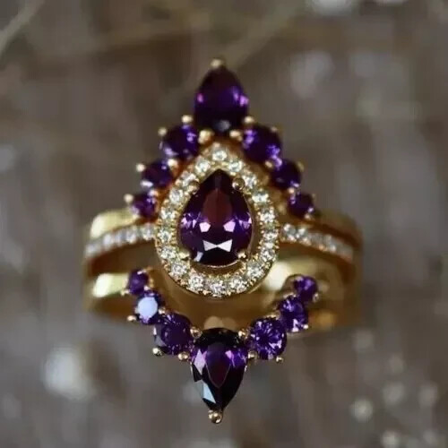 2Ct Pear-Cut Simulated Amethyst Trio Ring Set in 14K Gold Plated