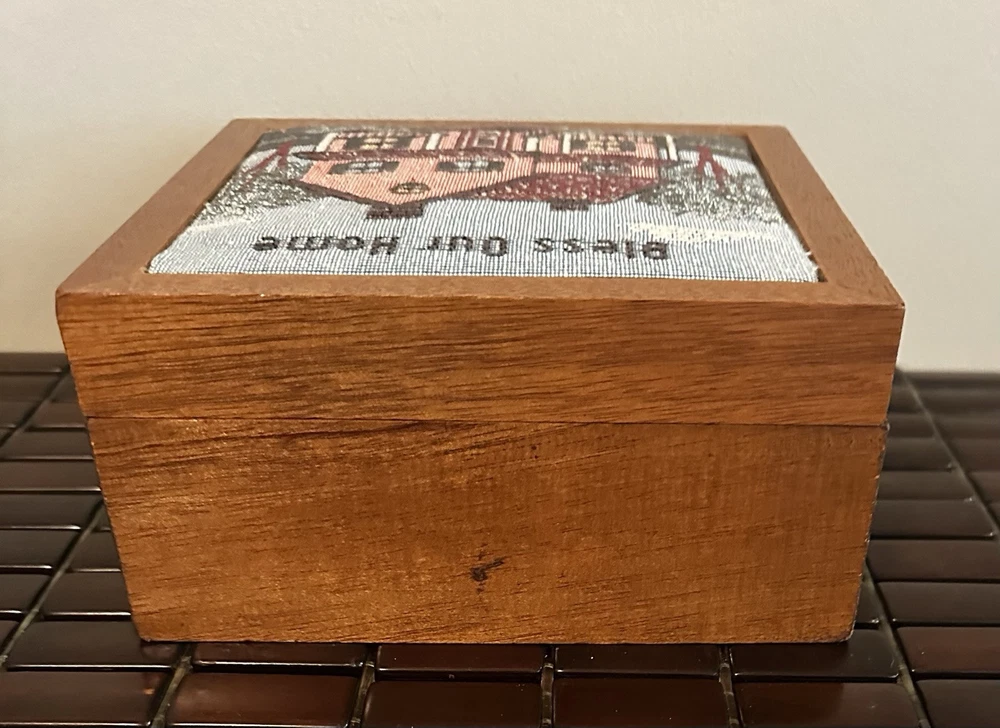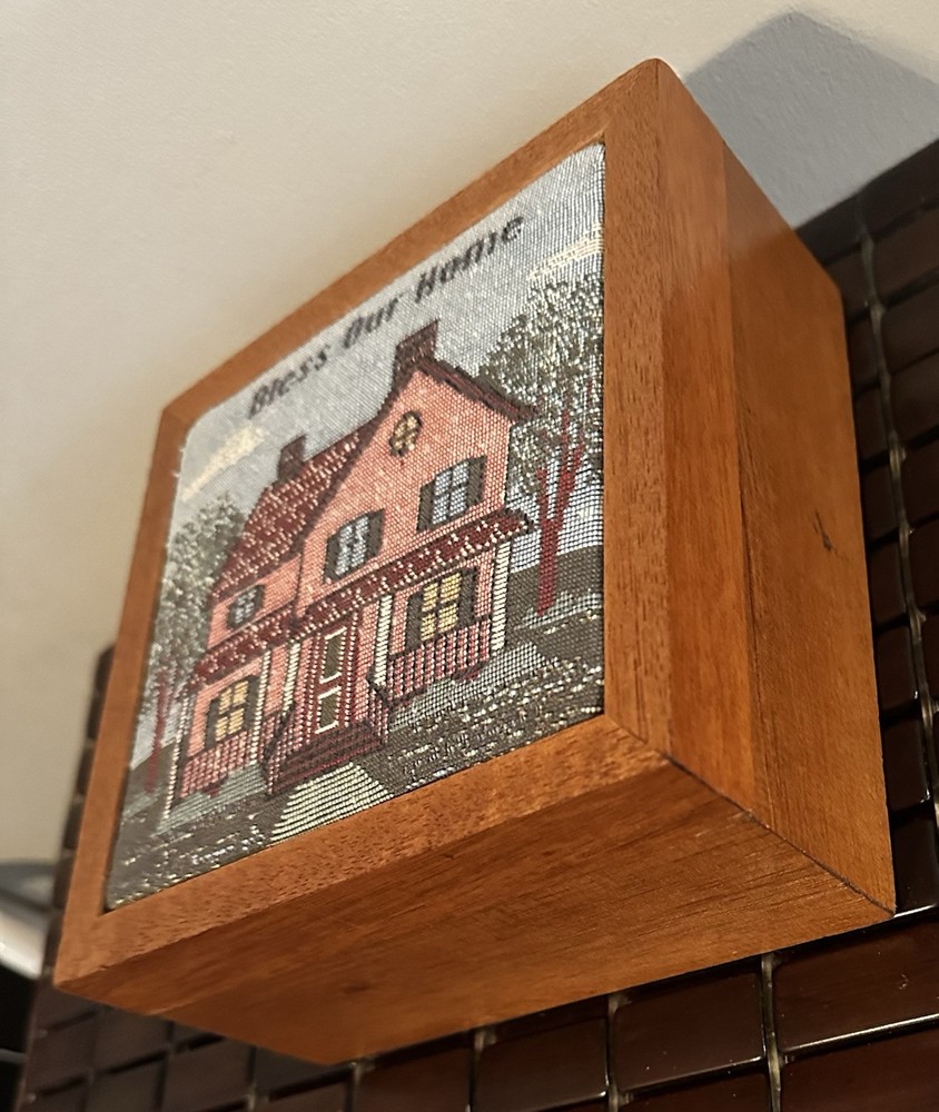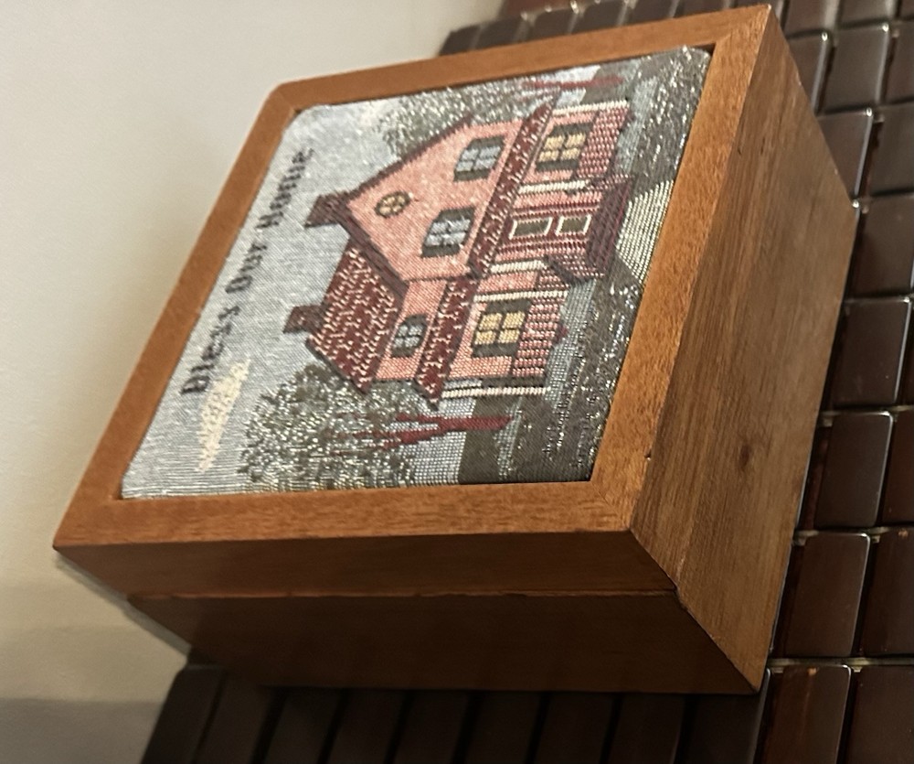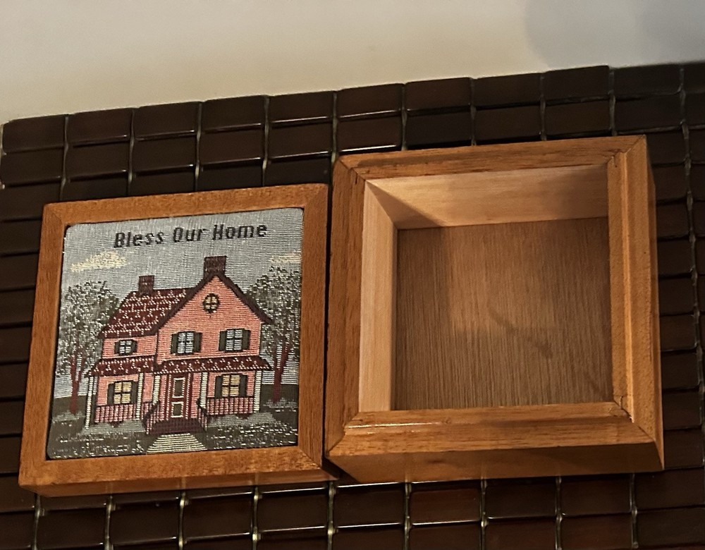 This beautiful vintage square storage box features a tapestry top with the inscription "Bless Our Home." Made of wood in the United States. In great pre owned condition.