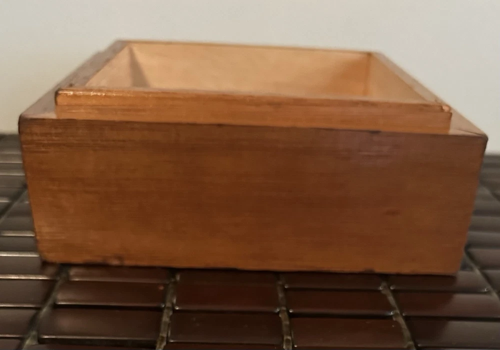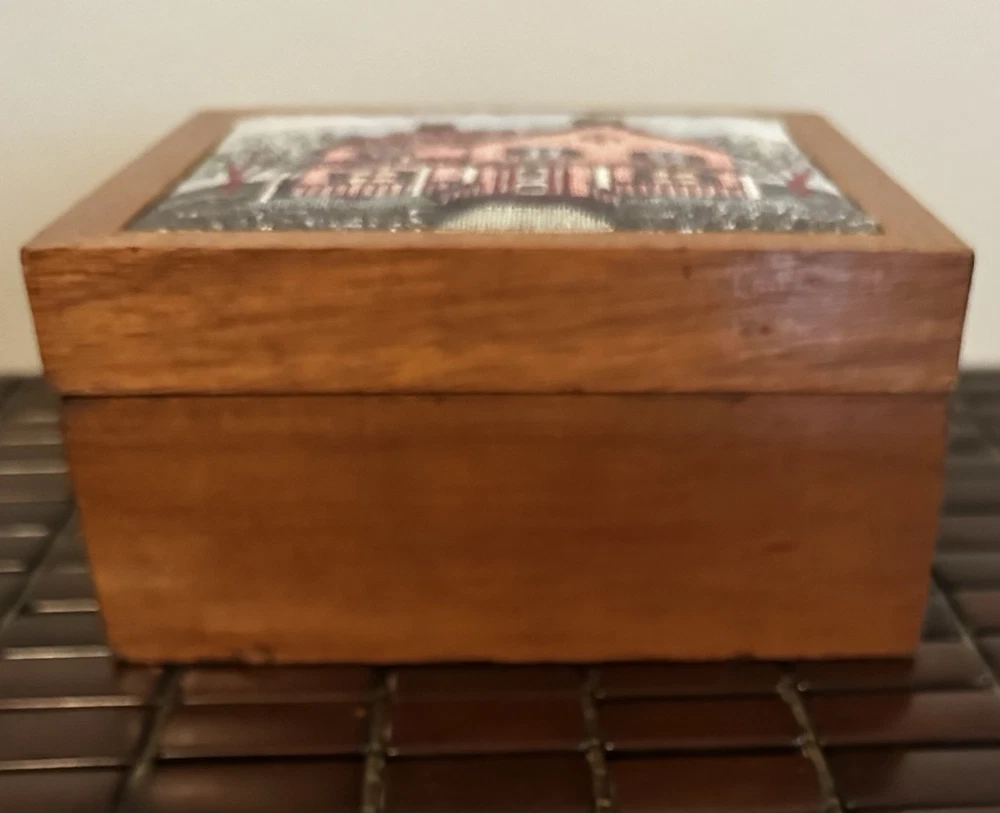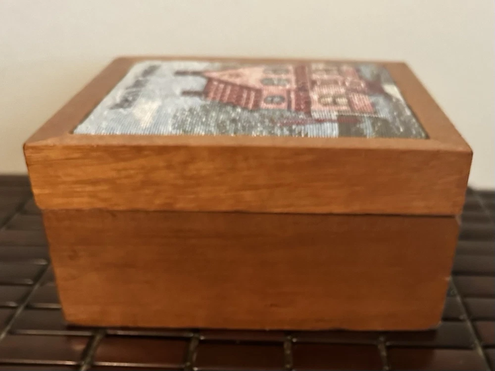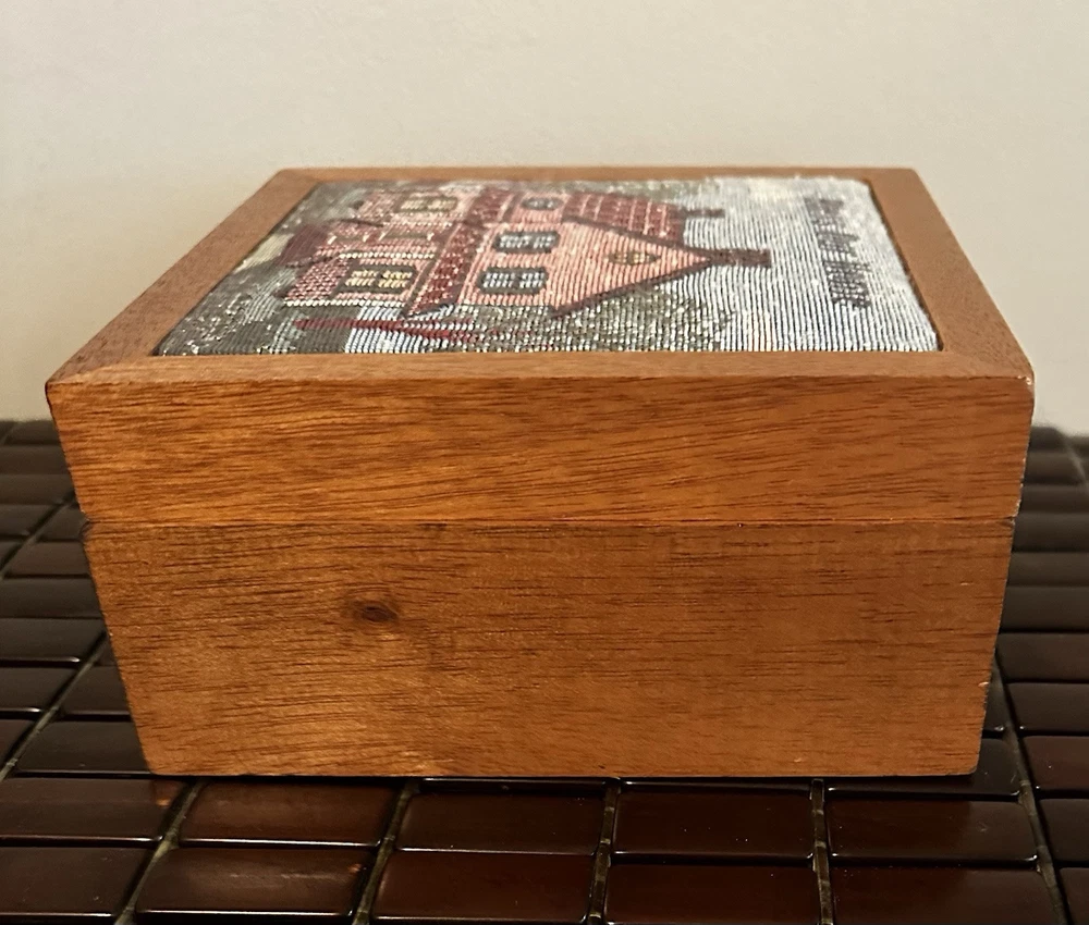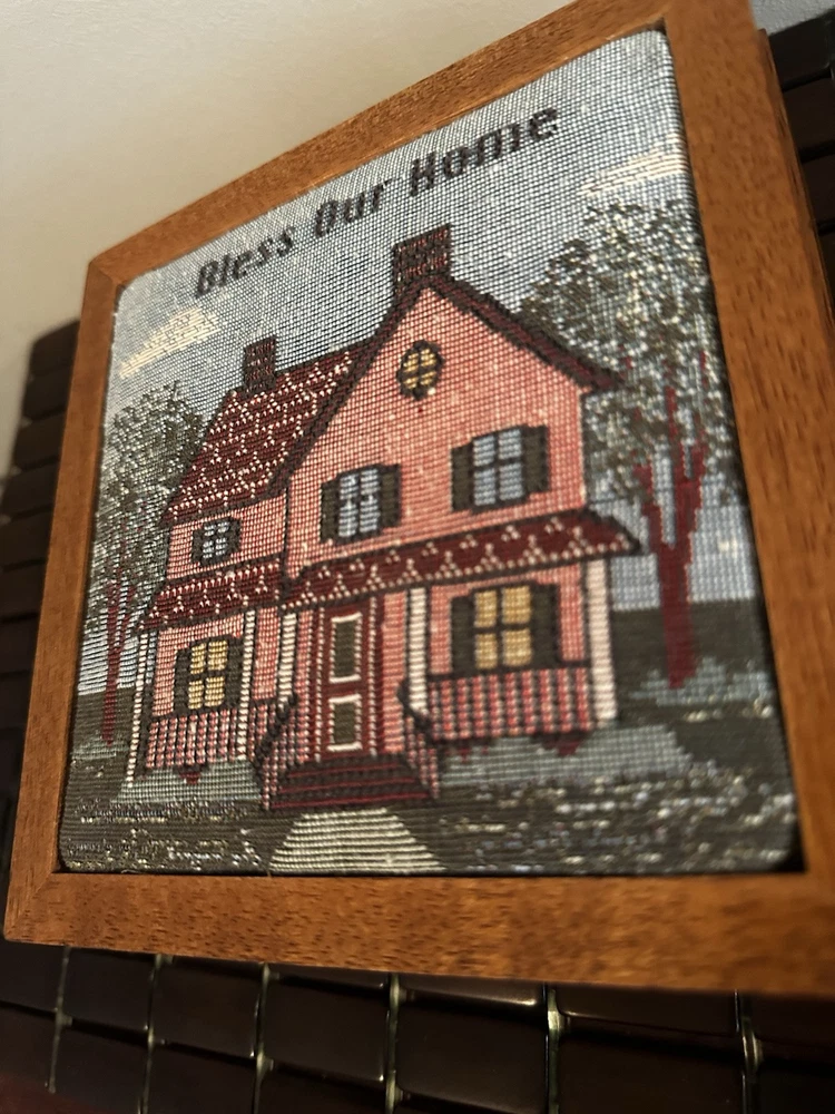 This beautiful vintage square storage box features a tapestry top with the inscription "Bless Our Home." Made of wood in the United States. In great pre owned condition.