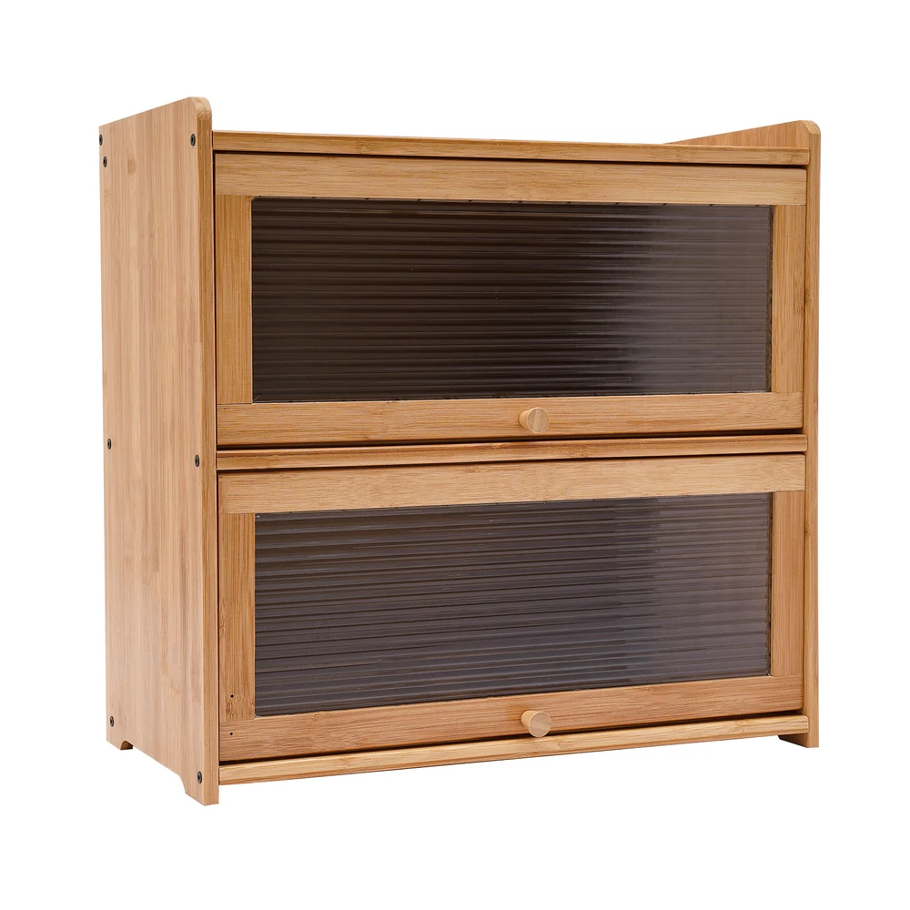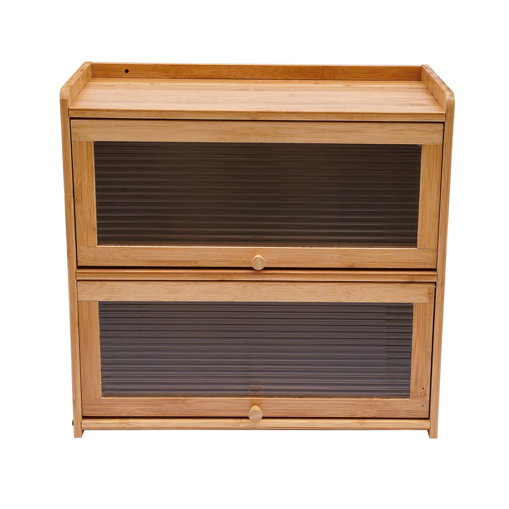 This storage cabinet is a game-changer for small spaces! The sturdy bamboo construction and strong acrylic doors hold up to 99 lbs, perfect for organizing kitchen essentials, bathroom supplies, or office clutter. Love the smooth-opening doors with built-in stoppers—no more slamming. Compact yet spacious, it looks sleek on any countertop while keeping everything neatly tucked away. Highly recommend for an instant organization upgrade!