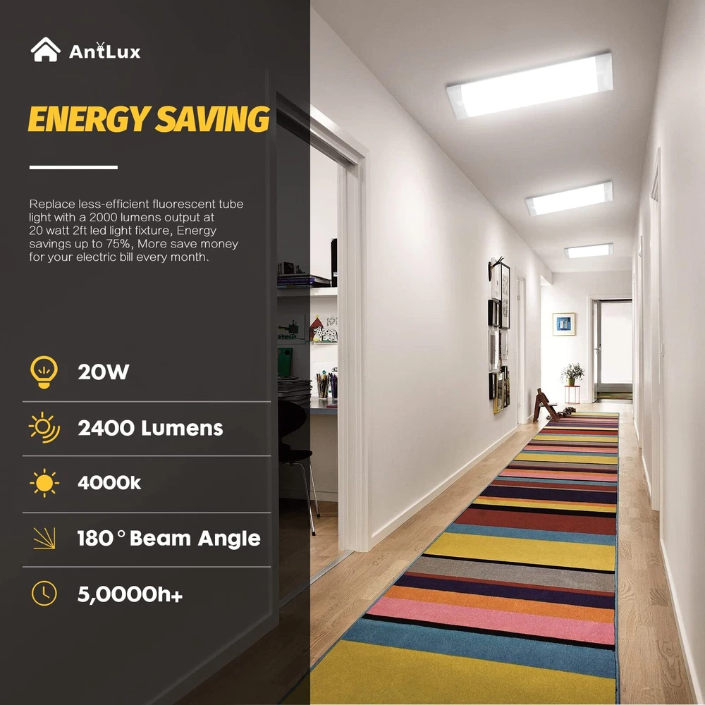 【Elegant & Unique Design】 The unique decorative end caps design of this 2ft led light fixture makes your space more elegant. Featured with the thermal-formed diffuser, the 2ft led kitchen ceiling lights provide soft and comfortable lighting, resulting in a light source without glare, dazzle or spot dot, protecting your eyes. 【Energy Saving】 The 2ft led kitchen light fixture provides an impressive 2400 lumen light output at 20watts, saving you up to 75% energy with the latest LED technology. It is a great replacement for the existing fluorescent or incandescent light fixtures. And this long-lasting 24 inch LED Wraparound Shop Light Provides up to 50,000 hours of maintenance-free operation. 【Widely application】 Our 2 foot flush mount led lights are ideal for your kitchen, laundry, closet, garage, basement, workshop, office, hallway, stairway, utility room, living room and replacing fluorescent versions. 【Quick & Easy Installation】 Follow our installation guide for a quick and easy setup, mounting hardware included. Directly mount this 2ft. led light fixture to the ceiling,connect wire correctly. If you want to link multiple lights together, just knock out the holes on the end, and use connect wires to link up together. 【Benefits】 2 foot led light fixture can last 23 years (6 hrs per day). If you need any support, please feel free to contact us, our professional after-sales team will solve your problem timely and provide you 100% satisfaction solution.