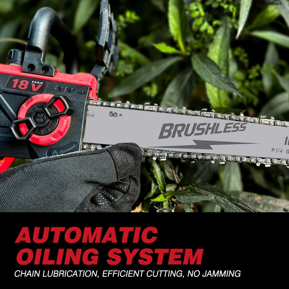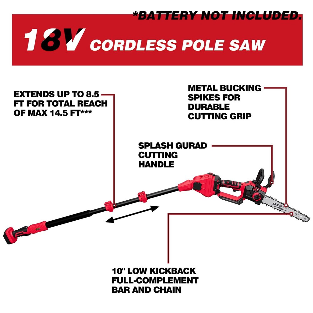 2-IN-1 Cordless 10-Inch Pole Saw And Chainsaw Compatible with Milwaukee M18 18V Battery, Total Reach of Max 15ft, Auto Oiling, Electric Pole Saw for Tree Trimming Pruning (No Battery) Compatible with MilWaukee Batteries: Pay Attention! Tool only,Battery not included!Compatible with MilWaukee m18 series lithium-ion batteries,for 48-11-1820 48-11-1822 48-11-1828 48-11-1840 48-11-1841 48-11-1850 48-11-1852 48-11-1860 48-11-1862 48-11-1880,etc.Giving professionals who already own a MilWaukee m18 battery and battery charger the flexibility to use their preferred battery and battery charger,avoid unnecessary expenses! Versatile 2-in-1 Design: The removable chainsaw head can be used on its own as a 10 inch chainsaw or mounted on a telescoping pole to be used as a pole saw without any tools. With a telescopic pole saw for pruning high branches and a handheld chainsaw for ground work, it will fulfill all your cutting needs. Adjustable 180° Telescopic Pole: The 180° rotatable head provides excellent cutting flexibility, and the extension pole can be extended from 5.7 to 8.5 feet and up to 14.5 feet (based on a 6-foot tall person extending the pole saw to shoulder level). Trimming branches in different locations is easy and effortless without having to rely on unstable ladders. Automatic ROiling And Power Display: Enjoy smoother cuts and longer chain life with our chainsaw’s instant auto-lubrication. The transparent oil tank makes maintenance effortless, while the intelligent power display eliminates battery worries, keeping you in control for smarter, stress-free operation! True Brushless Motor: Our 10-inch cordless 2 IN 1 pole saw is powered by a high-efficiency second-generation brushless motor for powerful performance and reliable operation. Higher efficiency, lower energy consumption, stable and non-decaying power, and longer service life! After-sales service: All of our power tools have passed strict factory quality inspection, safe and reliable, meanwhile you will enjoy 12 months after-sales service, if you have any questions or suggestions, please leave us a message. We are at your service within 24 hours to help you with any questions you may have.