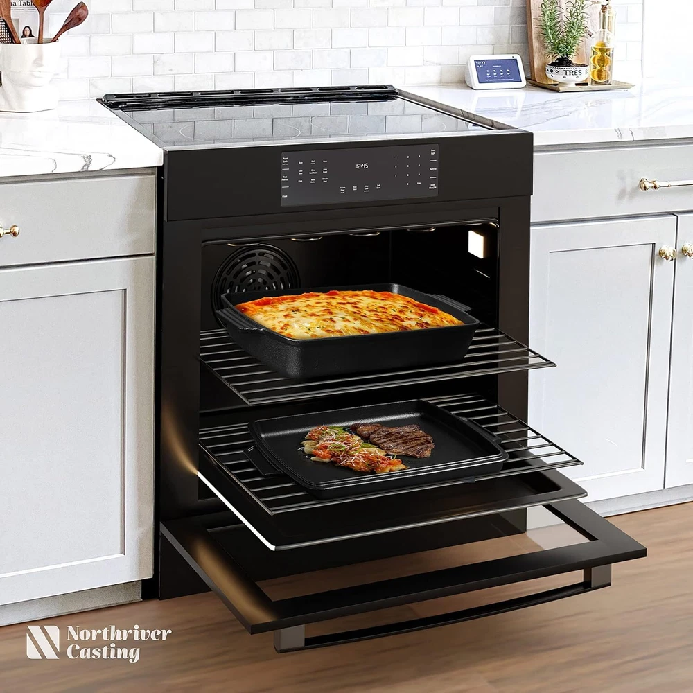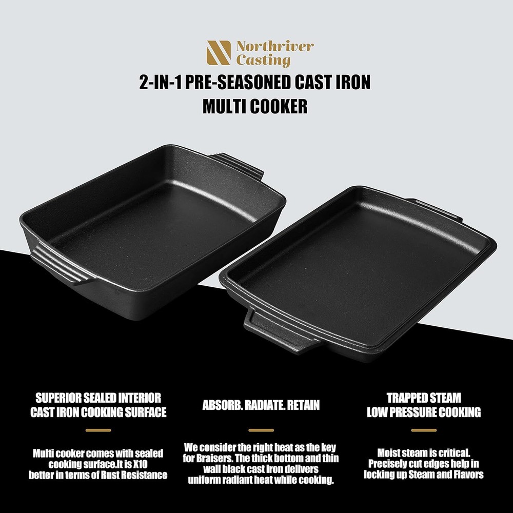 You may also like 14 inch Cast Iron Wok with Flat Base and Handles 5 Quarts 68.3 USD 71.89 USD Free shipping 5% off 2-in-1 Pre-Seasoned Cast Iron Dutch Oven Pot with Skillet Lid Set 10" Skillet 42.99 USD 45.25 USD Free shipping 5% off Cast Iron Dutch Oven with Lid Non-Stick Ovenproof Enamelled Casserole Pot 6.4 qt 54.1386 USD Free shipping 4.75qt Round Cast Iron Ceramic Enamel Dutch Oven with Lid & Grip Handles Kitchen 36.86 USD 40.46 USD Free shipping 9% off 2-In-1 Pre Seasoned Cast Iron Dutch Oven With Skillet Lid,Casserole Dish,Rectangular Baking Pan,Griddle Pot Set, 6QT, 9"x13" Material Cast Iron Capacity 6.2 Quarts Color Black Finish Type Non Stick 【COOK ANYTHING, ANYWHERE】: The 2-in-1 cast iron Dutch oven pan with lid can be used to grill steaks, sear pork chops, fry eggs, saute vegetables, cook pot roast, bake sourdough bread and so much more. Cover the pot with lid to retain moisture, or use lid as a cast iron skillets. This large Dutch oven is suitable for all kitchen cooktops, oven, electric stove, blackstone. Also it can be used as a multifunctional camping cookware for outdoor grill, and campfire. 【PRE-SEASONED & READY TO USE】: We use a special seasoning technique to give our cast iron Dutch oven set extra protection and establish a naturally non-stick surface. Northriver Casting's cast iron pot can really handle the fire, and is made to last for generations! 【ERGONOMIC DESIGN】: We have developed our study handles to allow you greater control to safely transport your large Dutch oven with lid from the stovetop to the oven and the dinner table. ( Please note: handles get hot during cooking.) 【SPACIOUS COMPACT】: This heavy duty 6 qt Dutch oven set is rectangular so you have more space for food, while still fitting perfectly in a standard oven. It's 15.2inch x9.25inch (38.7cm x 23.5cm); the base is just over 2.6inch (6.5cm) and the skillet/lid is 1.3inch(3.3cm) high. You may also like Rain Wizard Rain Water Storage Collection Rain Barrel 50-Gallon W/ Brass Spigot 169.2 USD 178.11 USD Free shipping 5% off 9 Ft Solar 32 LED Lighted Patio Umbrella Waterproof Sunshade for Garden Pool 79.64 USD Free shipping 14-Piece Flex-Head Ratcheting Wrench Set 6-19mm Metric Chrome Vanadium Steel New 68.24 USD Free shipping 108 Qt. Stacker Box Plastic Bin Tote Lid Container Organizer Stackable Set of 4 86.4 USD 94.49 USD Free shipping 9% off Portable Laptop Table with Charging Station Height Adjustable Standing Computer 76.64 USD 80.67 USD Free shipping 5% off Locking Storage Box 19.5 X 7 X 13.5 Inches Black Organizer Combination Lock Safe 90.86 USD Free shipping 8 Tier Shoe Storage Cabinet 32 Pair Plastic Shelves Organizer Hallway Entryway 51.14 USD Free shipping High Top Folding Bistro Table Side Cafe Round Outdoor Patio Cocktail Party Table 55.4 USD 60.72 USD Free shipping 9% off 9 Ft 32 LED Lighted Patio Table Market Umbrella with Tilt & Crank for Pool Beach 79.64 USD Free shipping 1-Part Epoxy Acrylic Concrete and Garage Floor Paint Satin Silver Gray 1 Gallon 64.96 USD 71.17 USD Free shipping 9% off Console Table Entryway Storage Shelf Entry Modern Accent Sofa Table Living Room 64.07 USD 70.09 USD Free shipping 9% off 10x10' Pop UP Canopy Party Tent Folding Waterproof Commercial Gazebo Instant 61.56 USD 67.34 USD Free shipping 9% off