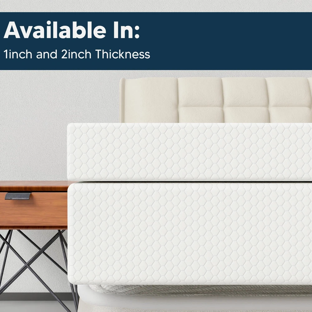 Elevate your sleep to new heights of comfort and protection with our premium mattress topper, thoughtfully designed with an included cover to enhance your nightly rest. Experience the ultimate in relaxation as our mattress topper embraces your body's contours, providing a layer that alleviates pressure points and ensures a tranquil sleep experience. Discover a new level of temperature regulation with our advanced cooling technology, engineered to disperse heat and maintain an optimal sleep temperature throughout the night. Embrace a hygienic sleep environment with the protective shield offered by the included cover and enjoy the convenience of effortless maintenance as the cover is easily removable and machine washable. Revolutionize your sleep setup with easy installation – simply unroll the mattress topper, secure it in place using the accompanying cover, and witness an instant transformation of your sleep haven. Say goodbye to restless nights caused by motion transfer and creaky mattresses as our mattress topper minimizes disruptions and envelops you in quiet . Breathe new life into your existing mattress while augmenting its comfort, delaying the need for a complete . Our mattress topper adapts seamlessly to diverse sleeping positions, ensuring a personalized experience whether you're a side sleeper, back sleeper, or stomach sleeper. And when adventure calls, take your sleep sanctuary on the road by effortlessly rolling up the topper for portable comfort. Experience the convergence of luxury and sustainability, as our mattress topper and cover boast eco-friendly materials that align with your values. Enhanced Comfort: Provides an extra layer of softness and cushioning to your existing mattress, enhancing overall comfort and support. Helps distribute body weight evenly, reducing pressure points and relieving discomfort, especially on sensitive areas like hips and shoulders. Temperature Regulation: Mattress toppers come with breathable materials, aiding in temperature regulation, and preventing overheating during sleep. CertiPUR-US certified foam: Rest easy knowing that the topper's foams are CertiPUR-US certified, meeting stringent standards for durability, performance, and content. Quality you can trust. Quick Installation: Simply unroll and place the topper on your mattress, secure it with the included cover, and you're ready to enjoy enhanced comfort. Affordability: An economical way to improve your sleeping experience without investing in an entirely new mattress. Toppers available in 1” and 2” thickness