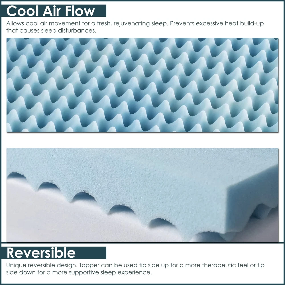 Convoluted memory foam toppers are a type of bedding accessory that can be placed on top of a mattress to enhance its comfort and support. These toppers are made of high-quality memory foam, which conforms to the body's shape, distributing weight evenly and reducing pressure points. The convoluted design of the foam topper features a series of hills and valleys that create a more breathable surface for improved airflow and temperature regulation. The addition of into the foam layer provides further temperature regulation by absorbing excess heat and dissipating it away from the body. The toppers come in various thicknesses like 1 & 2 inches, which can be selected based on individual preferences and needs. They are also available in various sizes, including twin, full, queen, and king, making them suitable for most bed sizes. Convoluted memory foam toppers are known for their ability to provide a comfortable and supportive sleep surface, improving the overall sleep experience. They also offer additional benefits such as motion isolation and durability, making them a popular choice for people who suffer from body aches, discomfort, or who simply want to enhance their sleep quality. Pressure : The convoluted design of the foam topper provides targeted pressure and support to different parts of the body. This can help reduce pain and discomfort in areas such as the hips, shoulders, and back. Temperature Regulation: The addition of to the foam can help regulate body temperature, keeping you cool throughout the night. This can be particularly helpful for people who tend to sleep hot. Motion Isolation: Memory foam toppers, including convoluted memory foam toppers, are known for their ability to isolate motion. This means that if your partner moves around in bed, you are less likely to be disturbed by their movements. Durability: Convoluted memory foam toppers are designed to be durable, which means they can provide consistent support and pressure for several years. CertiPUR-US certified foam: Rest easy knowing that the topper's foams are CertiPUR-US certified, meeting stringent standards for durability, performance, and content. Quality you can trust.