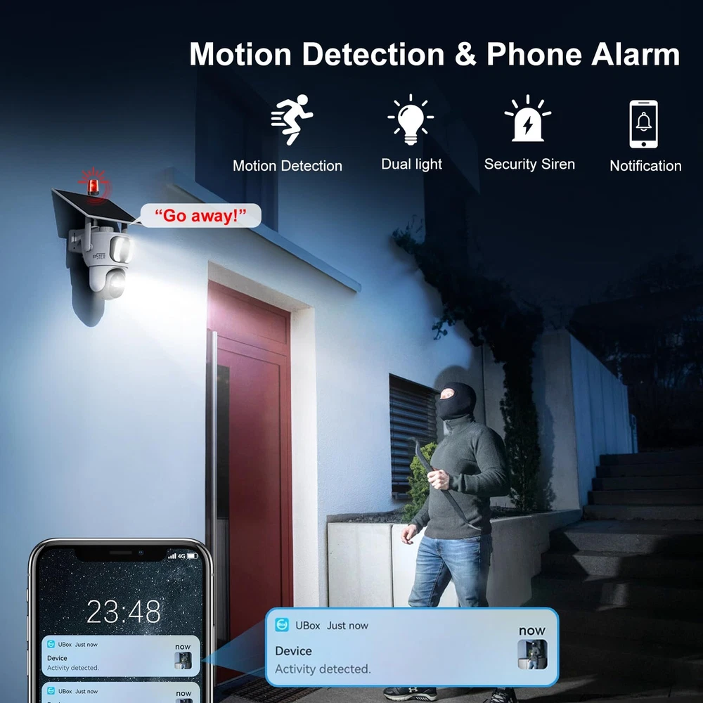 【 2K HD Live Video & Color Night Vision 】 Enjoy 2K high-definition live video with advanced color night vision. The camera ensures vivid, accurate colors even in low-light conditions. Keep an eye on your property day and night with this state-of-the-art security camera, perfect for monitoring your home. 【 Solar Powered Wireless Battery 】 Say goodbye to tangled wires with our solar-powered security camera. The camera features a rechargeable battery that keeps it running as long as there is sunlight. Enjoy hassle-free installation and continuous home security without interruptions. Ideal for maintaining outdoor surveillance. 【 4MP Dual Lens Technology for Full Coverage 】 The dual-lens system in the camera provides comprehensive surveillance. With a 4MP dual lens, it captures a wider and more detailed perspective. Monitor your surroundings effectively with this innovative security solution, designed for optimal home security. 【 Enhanced 360° PTZ Coverage & Night Vision 】 Protect every corner of your property with the Solar Security Camera's 360° PTZ coverage, allowing full 360-degree rotation. Capture every detail, day or night, with infrared LEDs that provide clear images up to 65ft away. Perfect for any home security setup. 【 2.4G WiFi & Two Way Audio 】 Easily access and control the camera from anywhere with 2.4G Wi-Fi. The outdoor camera for home security also features a built-in microphone and speaker, communicate directly through the app. Connect with visitors, deter intruders, and have complete control over your property. 【 PIR Motion Detection & Smart Alerts 】 Stay connected with the Solar Security Camera. Featuring PIR motion detection, you can receive real-time alerts, ensuring you're always informed about your home's security status. Ideal for comprehensive surveillance. 【 Easy Setup & Versatile Storage Options 】 Install the Solar Security Camera effortlessly with its wire-free design. Choose between SD card (up to 256GB) or cloud storage for your video recordings. This flexibility ensures that you can access and store footage easily, enhancing your home security experience. 【 High-Capacity Battery & IP66 Waterproof 】 The Solar Security Camera comes with a high-capacity battery and an IP66 waterproof rating. This means it can withstand various weather conditions, from rain to extreme heat. The solar panel ensures continuous power, making it an ideal choice for reliable home security throughout the year.